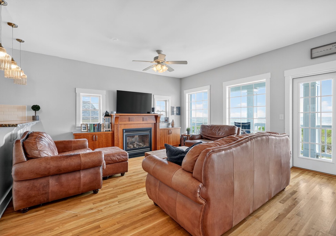 Step inside to an open and airy living space filled with natural light and coastal charm. The main floor features hardwood floors, a cozy gas fireplace, and large windows that frame the Atlantic. Step outside onto one of the multiple private decks to enjoy the sea breeze, or simply watch the waves roll in. The fully equipped kitchen has everything you need to cook meals at home, and the dining area makes it easy to gather for family dinners or game nights.