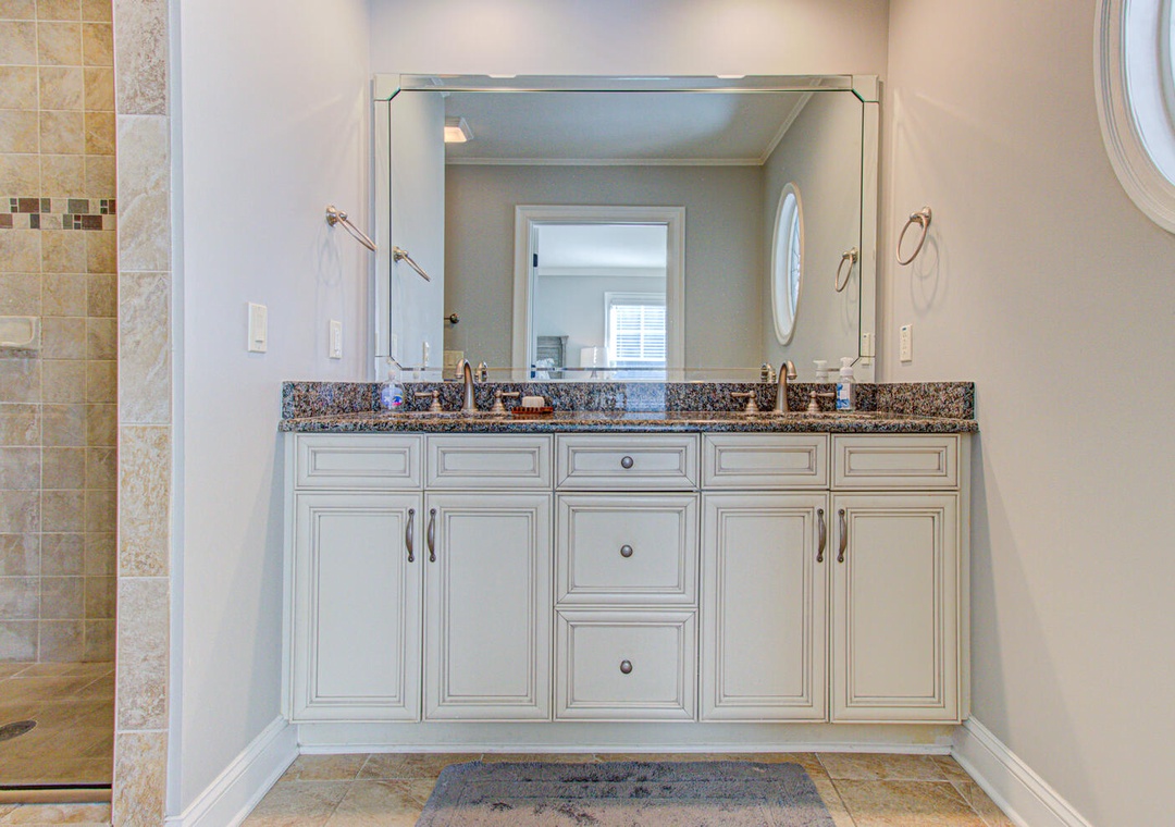 Private Bathroom with Glass Door Walk-in Shower and Double Vanity Sinks