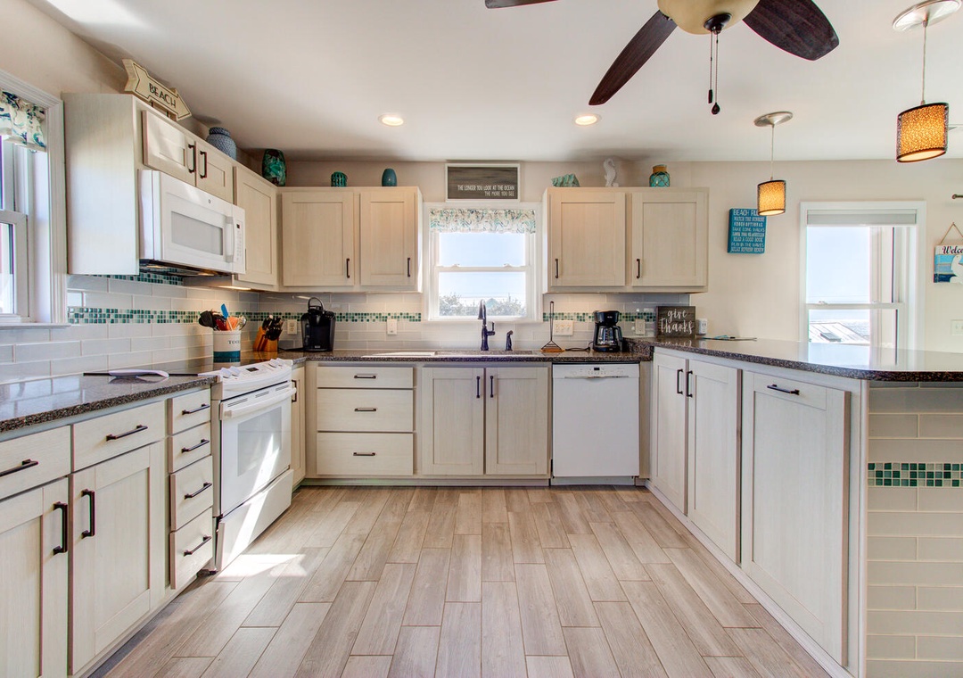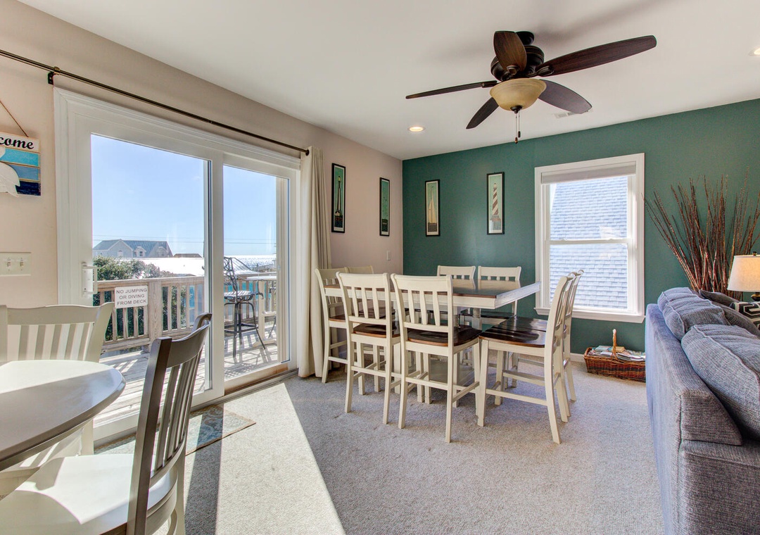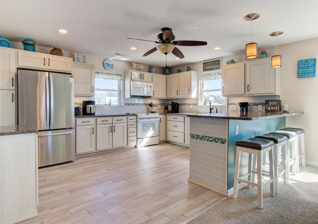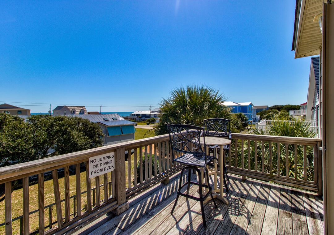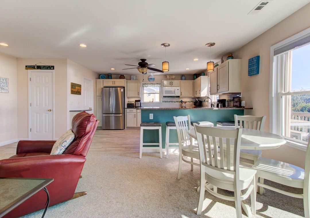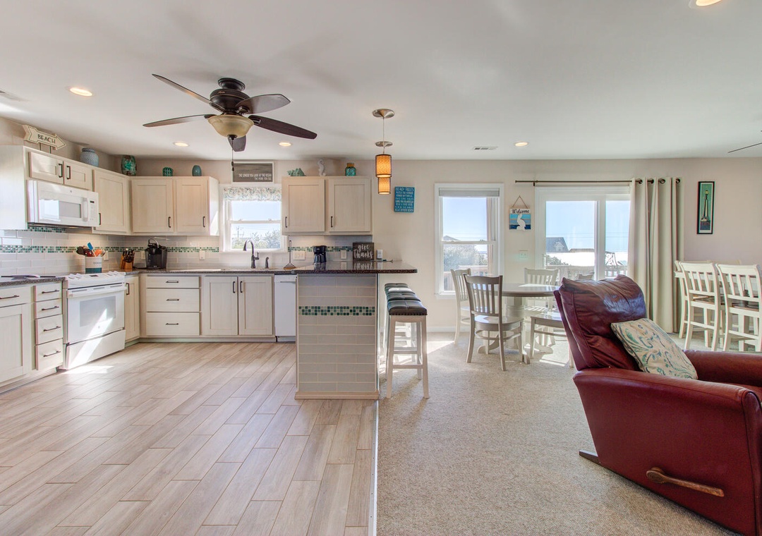 The third floor of Atlantic Views is a haven of comfort and style, featuring two king bedrooms with en suite bathrooms, including a master suite with a beautifully remodeled walk-in shower. The open-concept living, dining, and kitchen area is perfect for gatherings, equipped with new furniture, a 60" smart TV, and a fully updated kitchen complete with modern appliances and a Keurig coffee maker. Step out onto the expansive third-level deck to savor morning coffee with breathtaking views of the Atlantic, or unwind in the evening as the sun sets over the horizon.