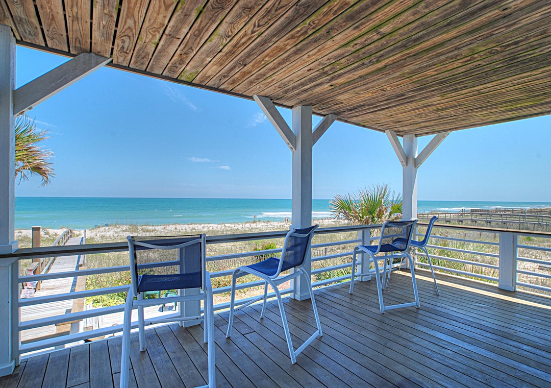 The second floor features a remarkable open floor plan with 270-degree ocean views. A spacious, modern kitchen with stainless steel appliances and a breakfast bar flows seamlessly into the dining area, a cozy fireplace, and two separate sitting areas. Guests can unwind in comfort while enjoying a large flat-screen TV with cable or sip cocktails from the wet bar. Step out onto the expansive oceanfront deck to take in panoramic views of the Kure Pier and enjoy private beach access. Hardwood flooring graces the common areas and most bedrooms on the top two floors, adding to the home’s sophisticated charm.
