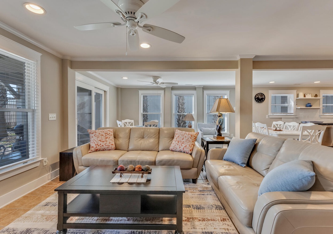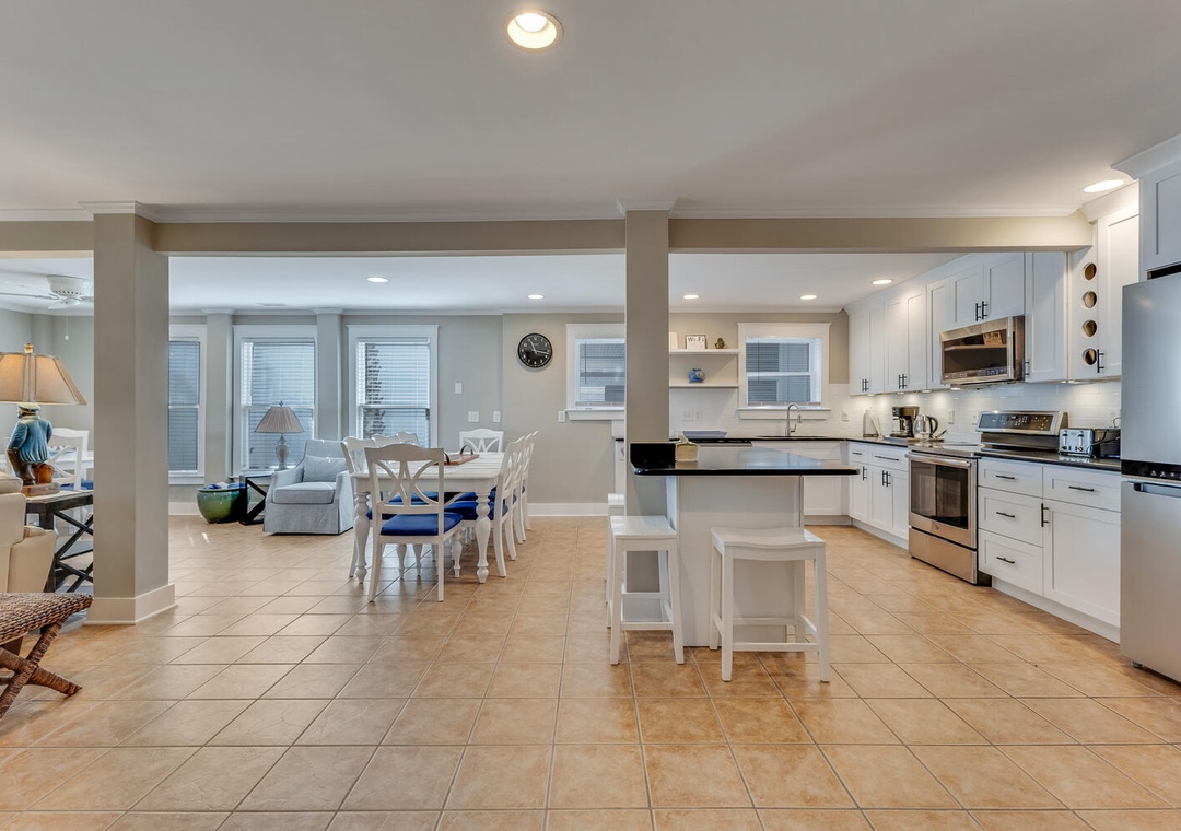 The fully stocked kitchen features a stove-top/oven combo, dishwasher, microwave, and a 12-cup drip coffee maker, while the dining area includes a large table with seating for 7 and a kitchen bar with seating for 2. The oceanfront living room boasts a flat-screen TV with Roku, a plush sofa, and additional seating for a cozy night in.