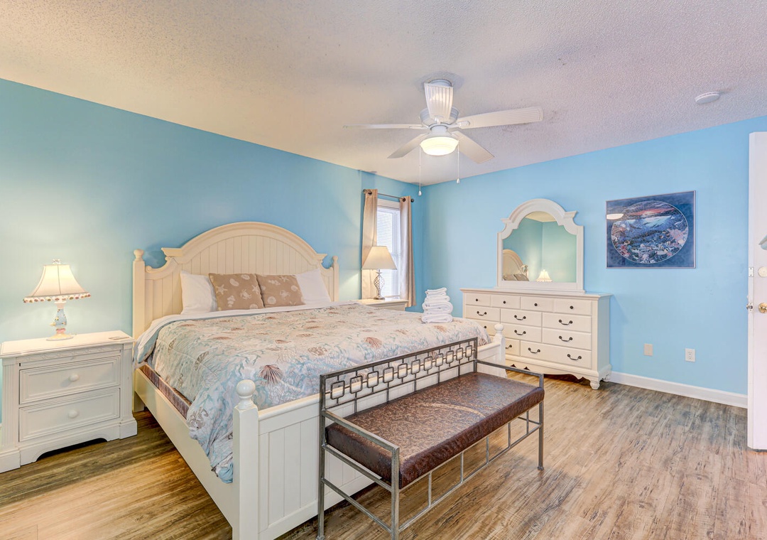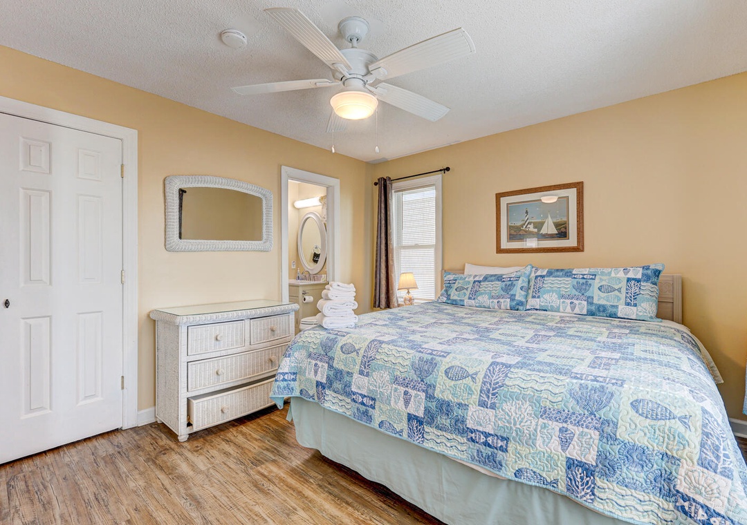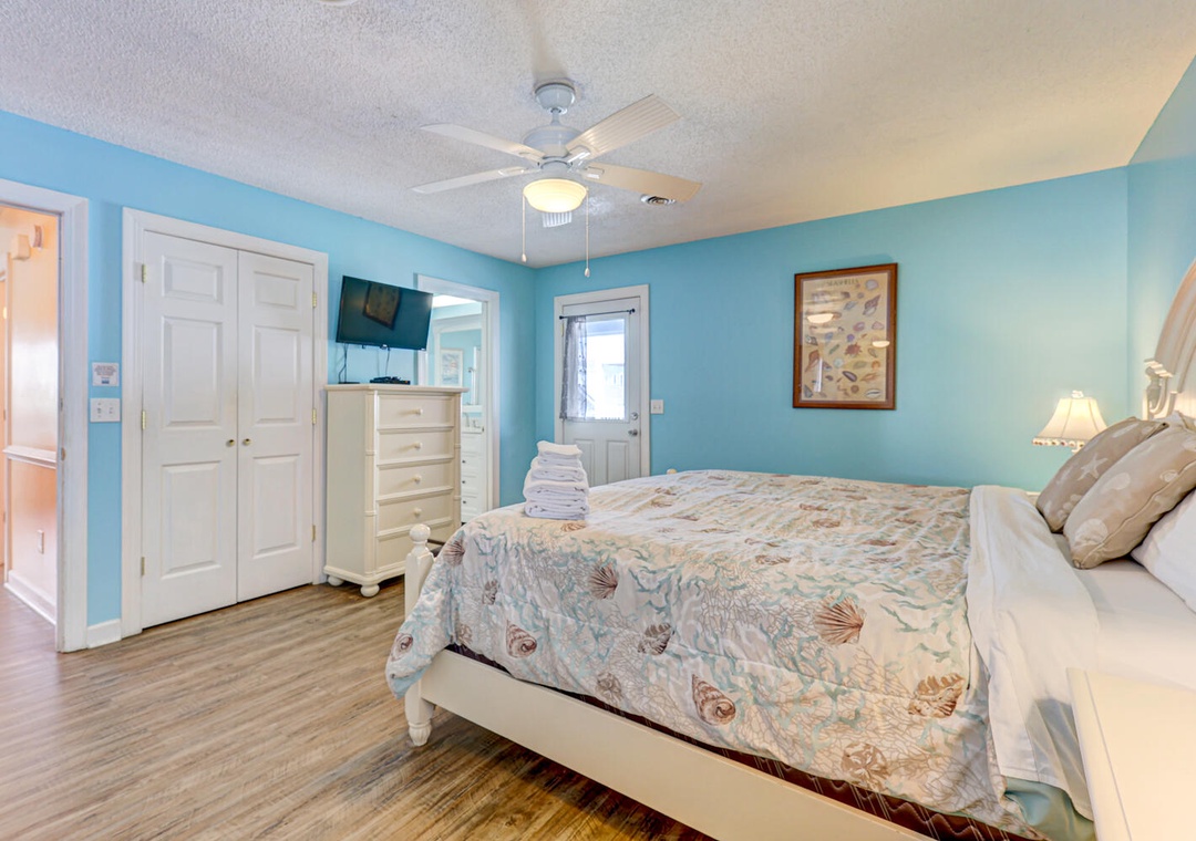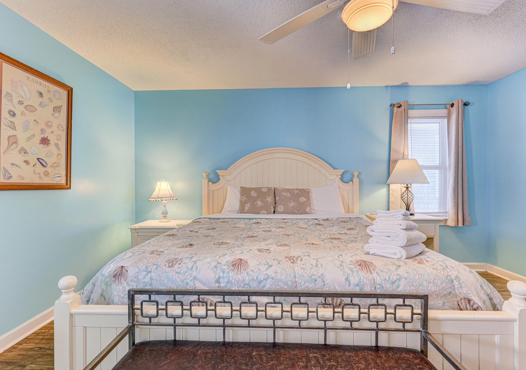 The home features four spacious bedrooms designed for relaxation. The master suite boasts a king bed, flat-screen TV, and ceiling fan, complemented by an en-suite bathroom with a glass-door walk-in shower. Two additional bedrooms also feature king beds, flat-screen TVs, and ceiling fans, providing a luxurious retreat for guests. The fourth bedroom offers flexible accommodations with a king bed and a twin-over-twin bunk, making it a perfect space for families with children. Each room is thoughtfully appointed for comfort and convenience, ensuring a restful night after a day of beachside adventures.