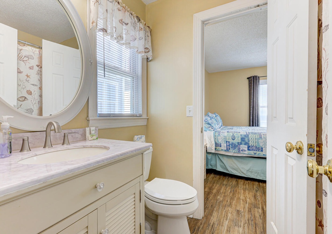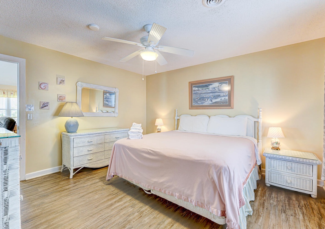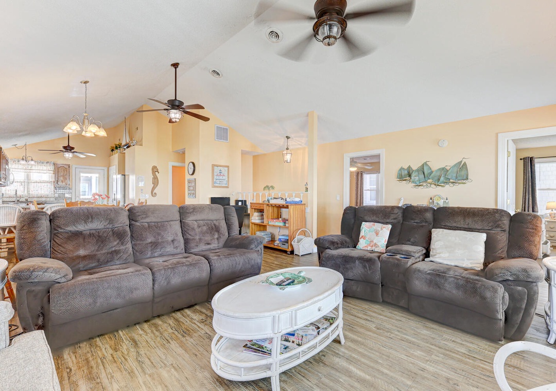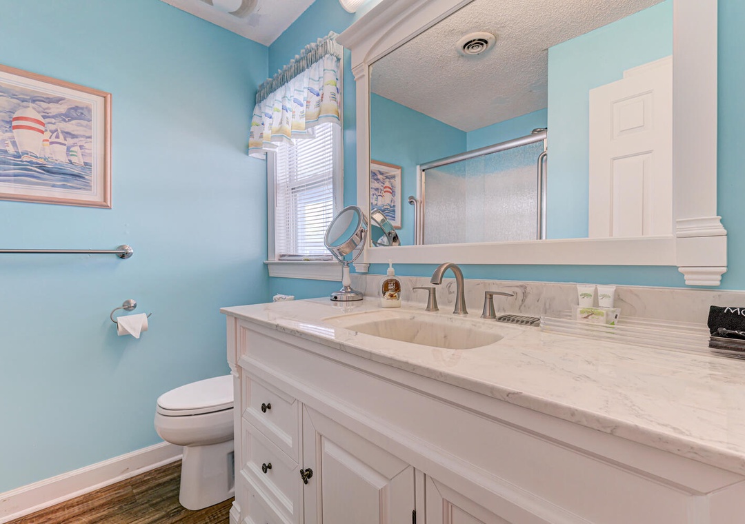The home features four spacious bedrooms designed for relaxation. The master suite boasts a king bed, flat-screen TV, and ceiling fan, complemented by an en-suite bathroom with a glass-door walk-in shower. Two additional bedrooms also feature king beds, flat-screen TVs, and ceiling fans, providing a luxurious retreat for guests. The fourth bedroom offers flexible accommodations with a king bed and a twin-over-twin bunk, making it a perfect space for families with children. Each room is thoughtfully appointed for comfort and convenience, ensuring a restful night after a day of beachside adventures.