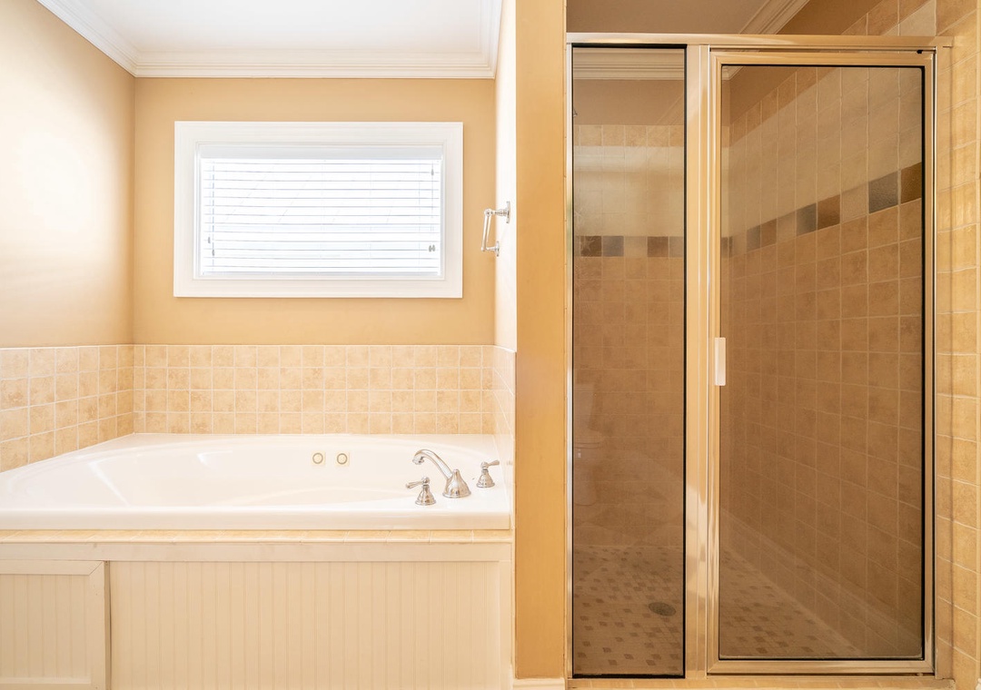 With six well-appointed bedrooms, this home comfortably accommodates large groups. The third-floor master suite includes a king-sized bed, a private balcony, and a luxurious en-suite bathroom with a Jacuzzi tub and glass-door shower. A second master suite on the second floor features a queen bed and private bath, while additional bedrooms are spread across all three floors, offering a mix of queen, twin, and full-sized beds. Three shared bathrooms ensure convenience, with features like double vanity sinks and tub/shower combos. Ceiling fans, TVs with cable, and alarm clocks add extra comfort throughout the home.