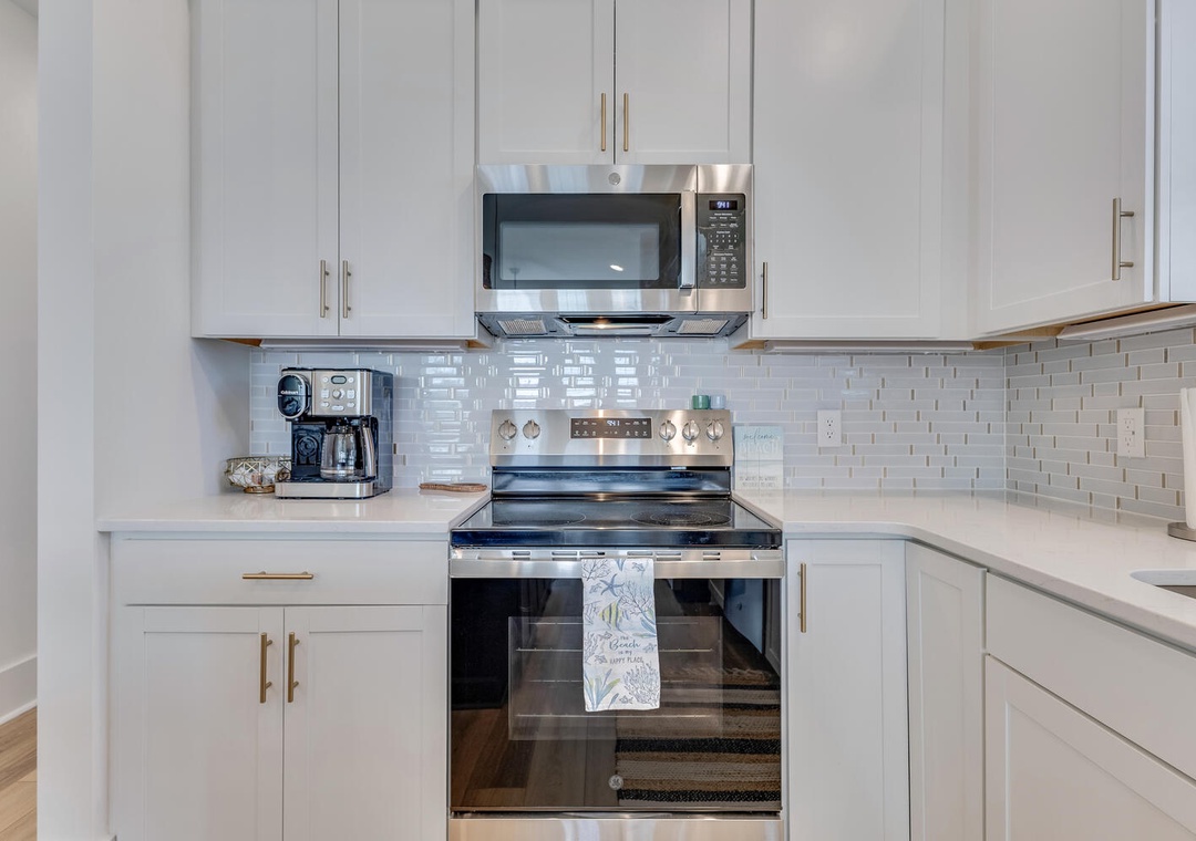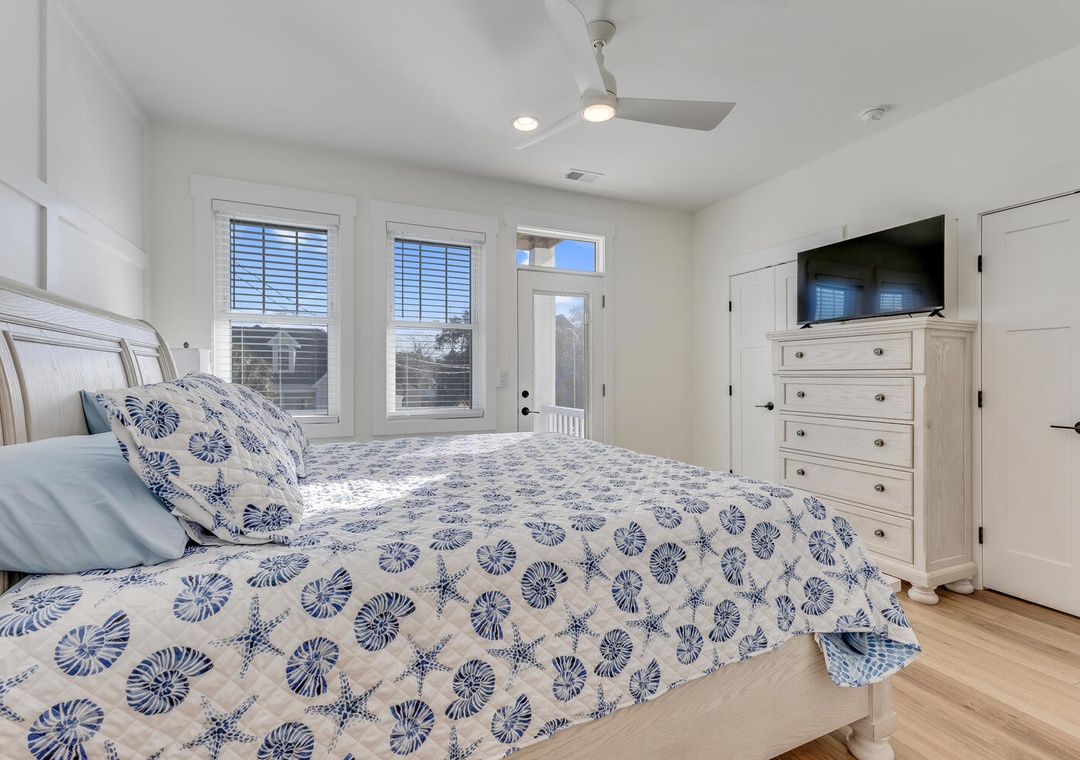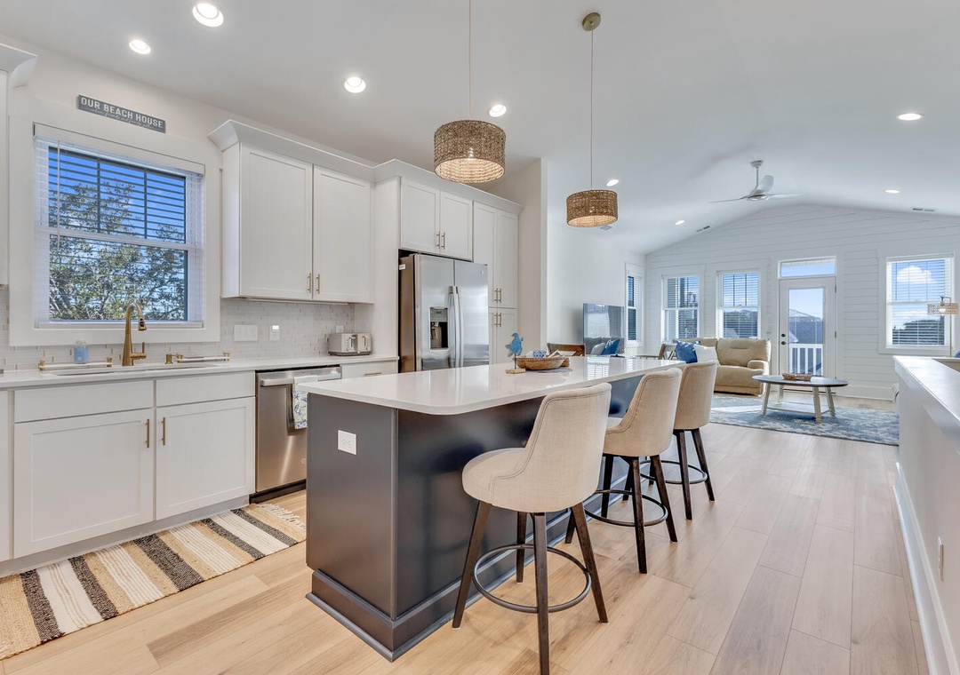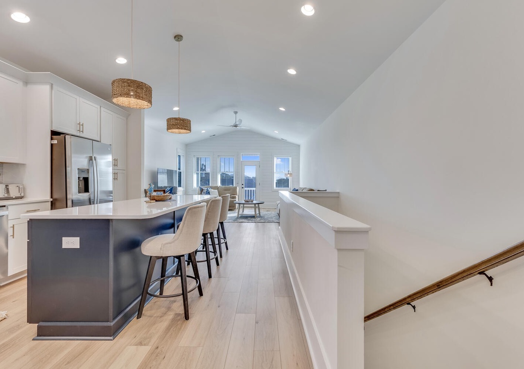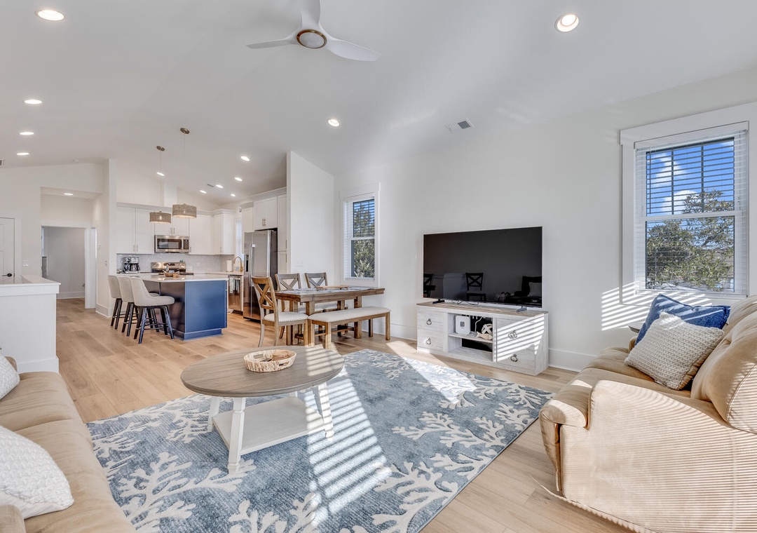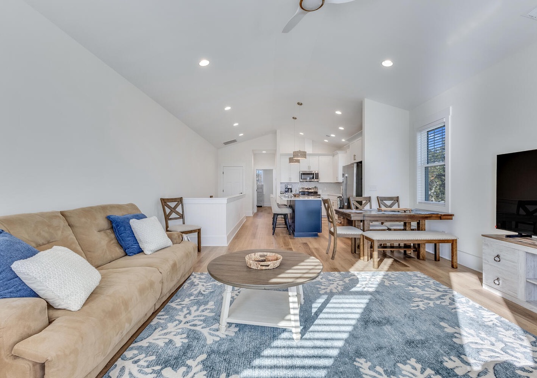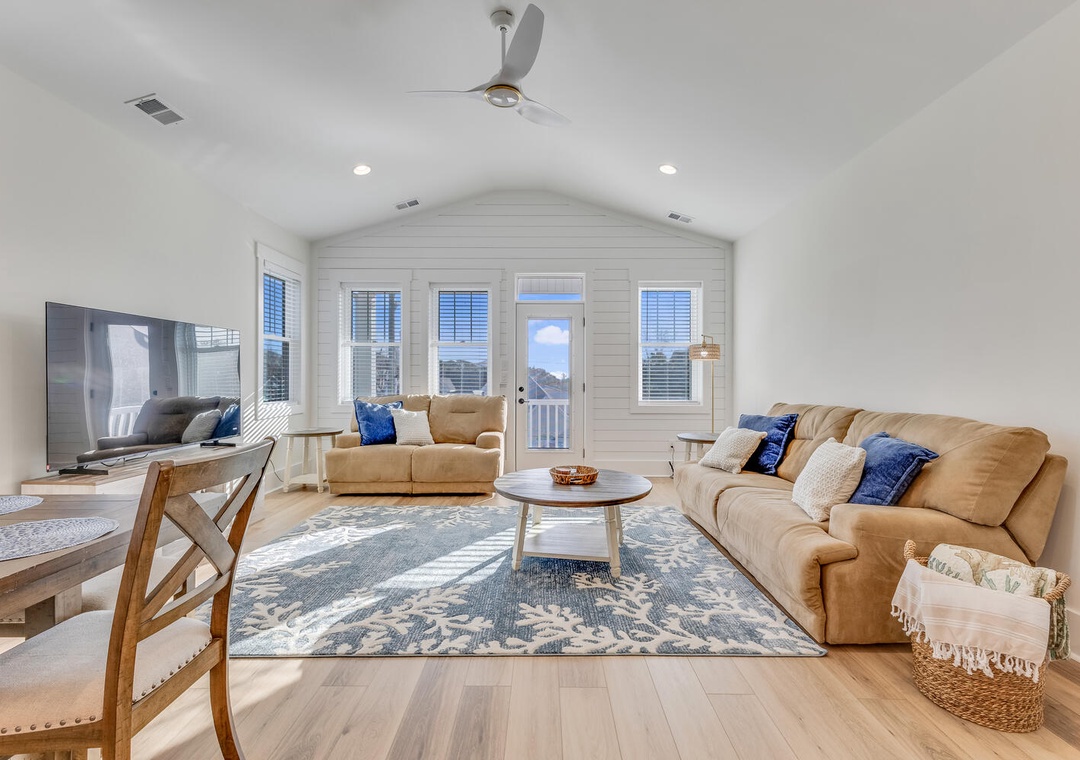 The main living level welcomes you with an open-concept design filled with natural light. A spacious living room flows seamlessly into the dining area, creating an inviting space for gatherings or evenings spent relaxing after a day at the beach. The living area opens to a private deck, perfect for enjoying the coastal breeze.