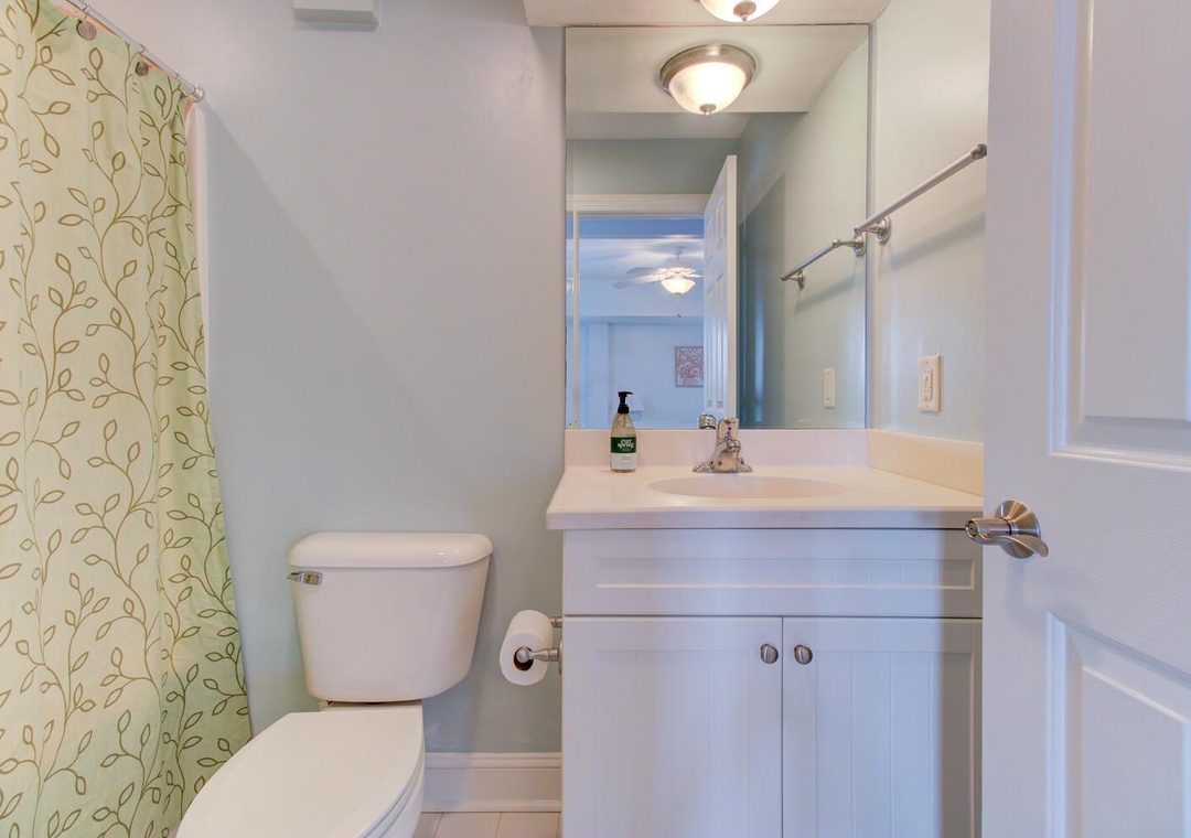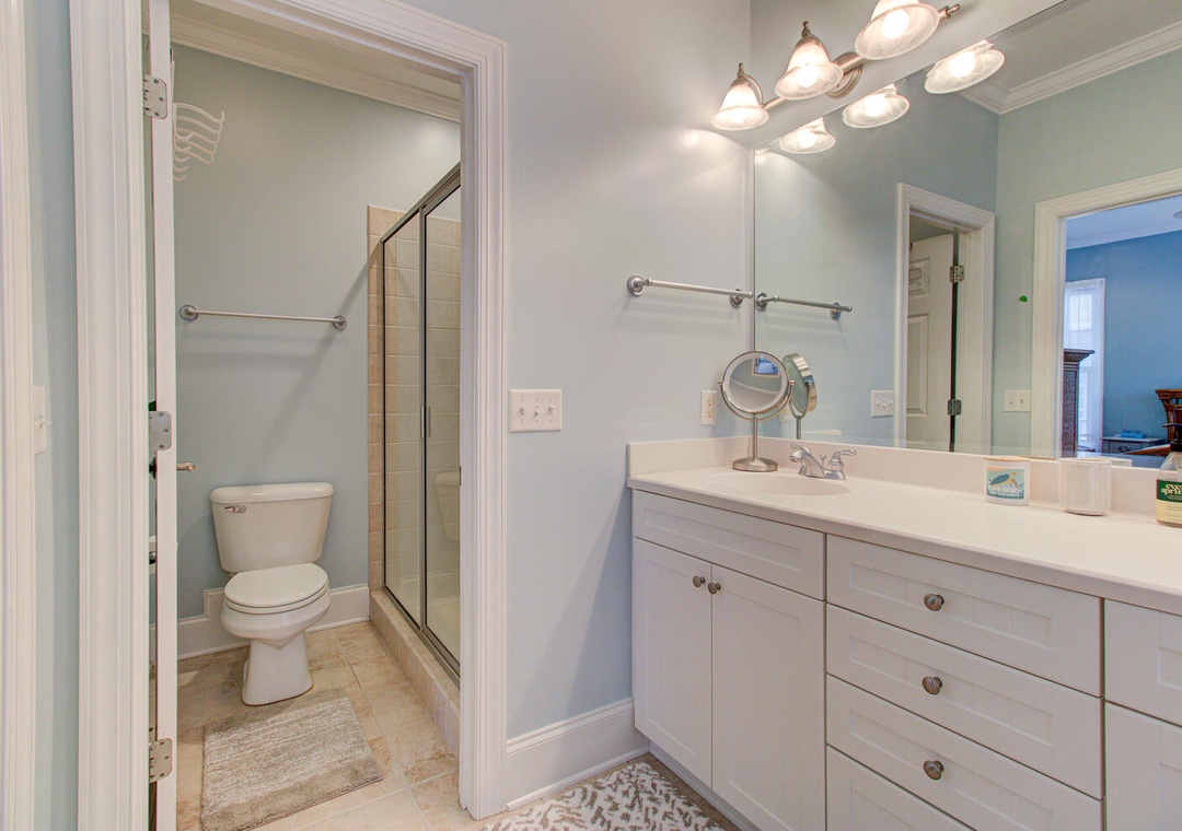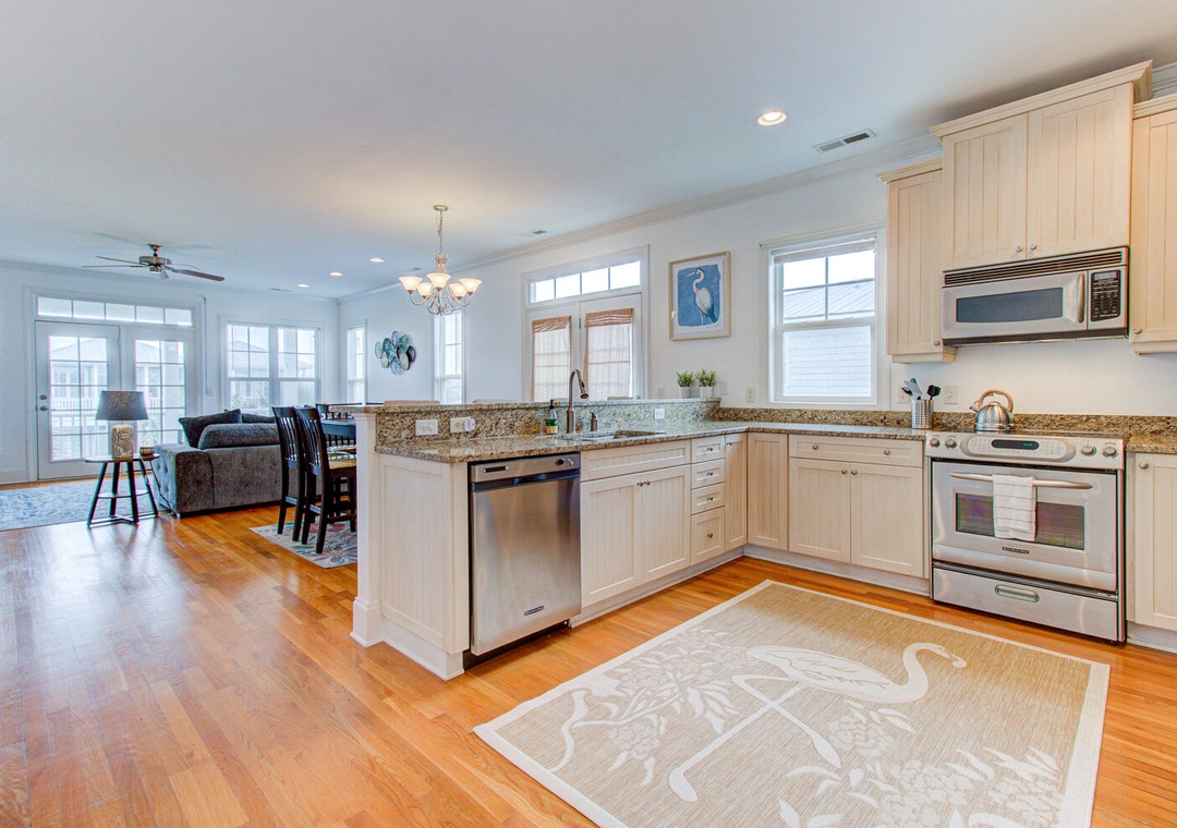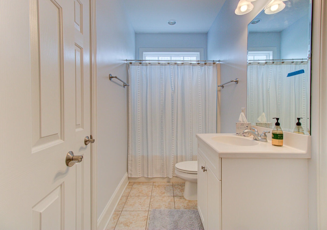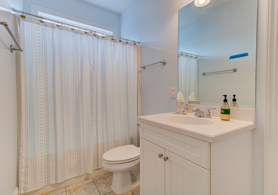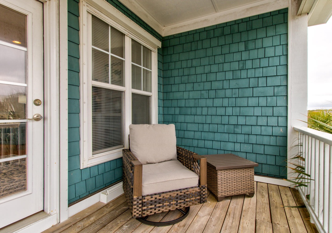 With five bedrooms across three floors, this home comfortably accommodates guests. The first-floor master suite includes a queen bed, and private bath. The second floor has another master suite with a private deck, along with a queen room and a bunk room with two sets of twin-over-twin bunks. The third floor features a queen bedroom and an inviting living area with a sectional, flat-screen TV, and access to the upper deck with seating for eight. A laundry room with a washer, dryer, and sink adds convenience. To rent both sides of this duplex, check out Carolina Hugs for even more space!