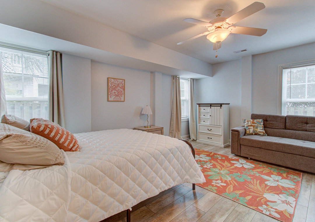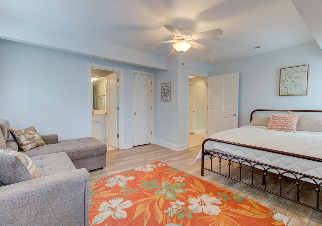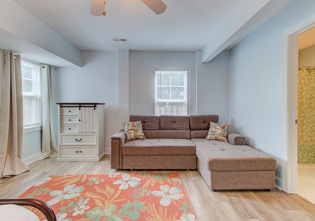 1st Floor Couch Ceiling Fan Private Deck