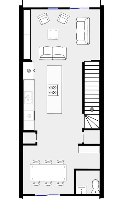 The kitchen and dining area offer plenty of space to prepare and enjoy meals together, with a dining table for eight and a kitchen counter with five bar stools. Modern appliances, including a refrigerator, flat-top stove, microwave, and small appliances like a coffee maker and blender, make meal prep a breeze. The home also includes a washer and dryer for added convenience.
