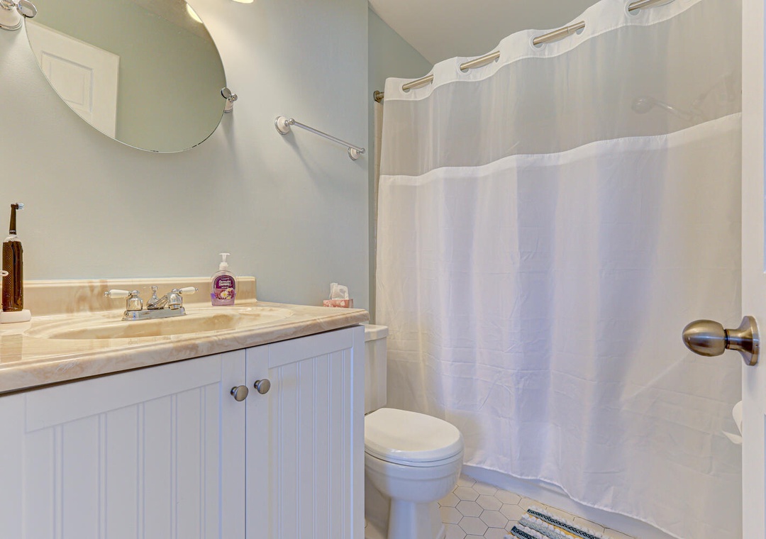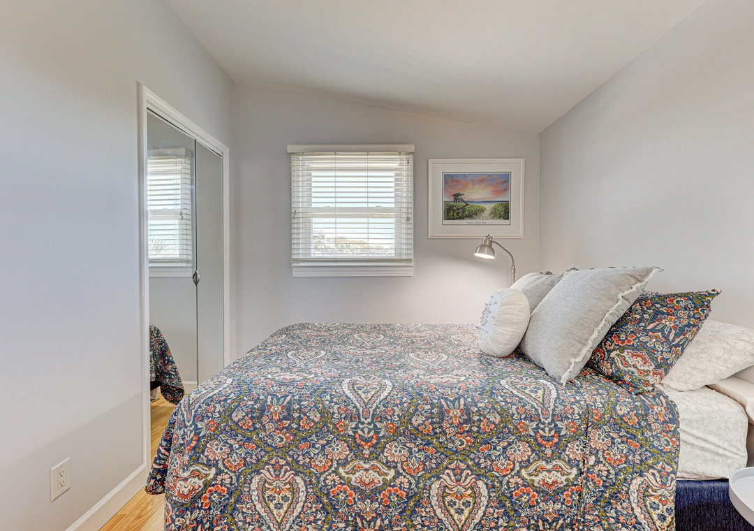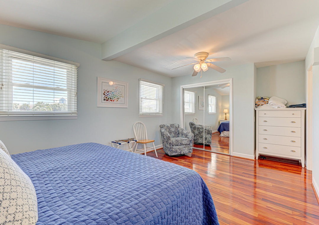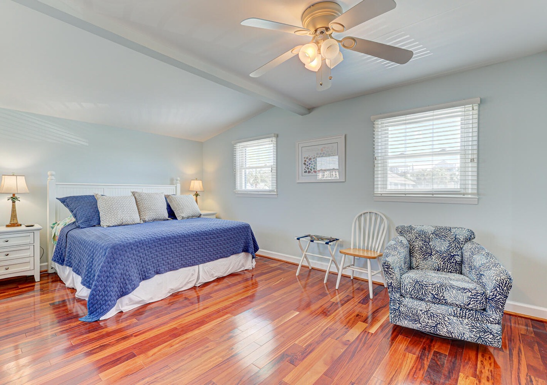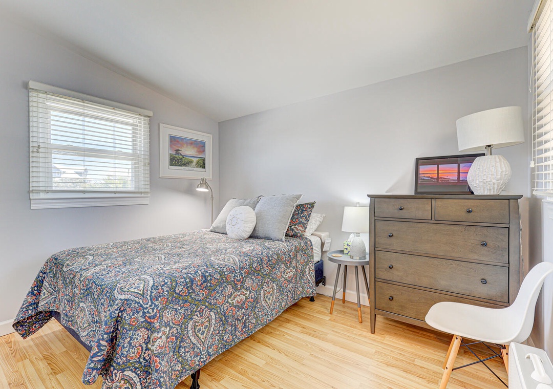The well-appointed bedrooms offer a restful retreat after a day by the water. The master bedroom, located on the second floor, includes a king bed, ceiling fan, and private bathroom with a shower/tub combination and single vanity. A second bedroom offers a queen bed and ceiling fan, with an additional bathroom nearby featuring a walk-in shower. The sunroom on this level provides two couches for lounging, and a dedicated laundry room with a full-size washer and dryer makes extended stays easy and convenient.