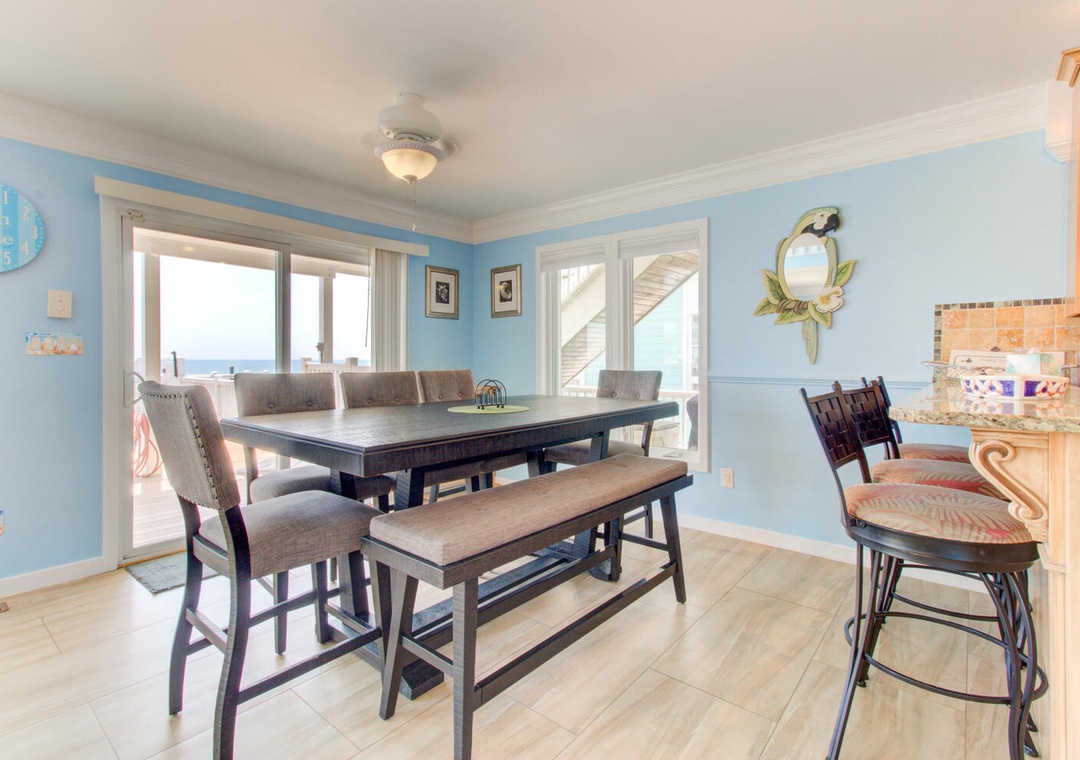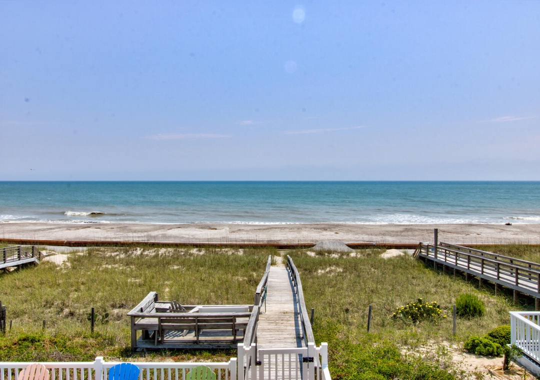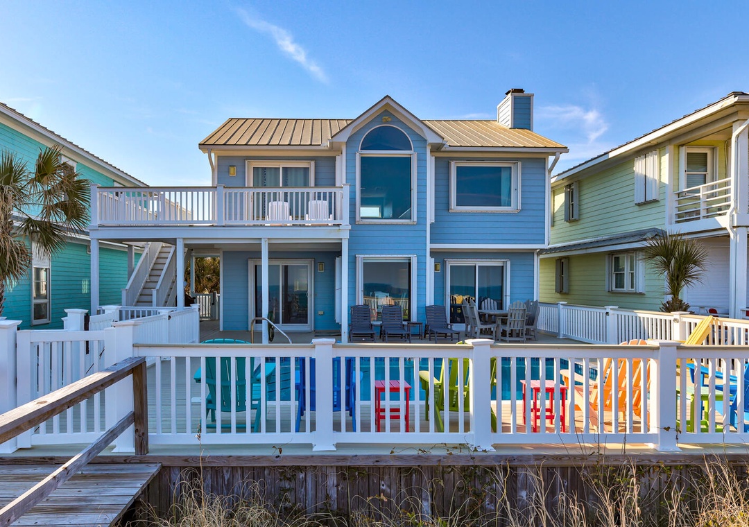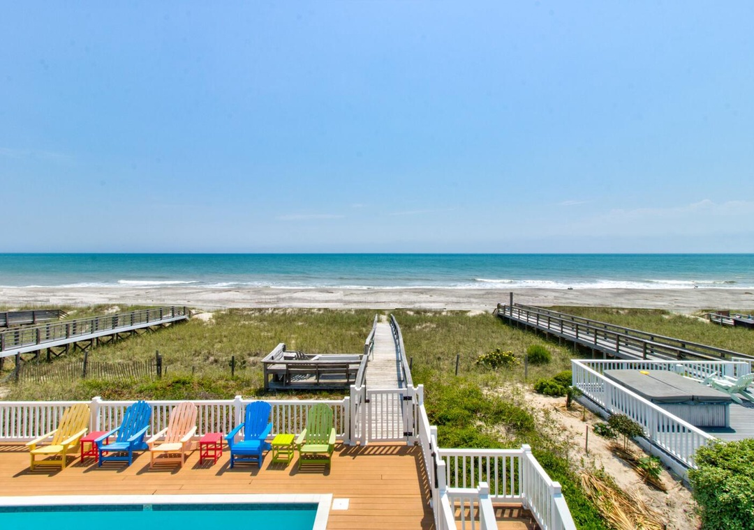 Welcome to Dolphin Run, a spacious 5-bedroom beachfront retreat that sleeps up to 15 guests, making it the perfect getaway for families and groups. Perched to capture breathtaking ocean views, Dolphin Run offers scenic vistas from two cozy den areas, the expansive kitchen, and the inviting living room on the second floor. Step outside to large oceanfront decks or take a few steps down your private beach access to enjoy the sandy shores. A convenient foot rinse on the walkway makes cleaning up after a day at the beach effortless.