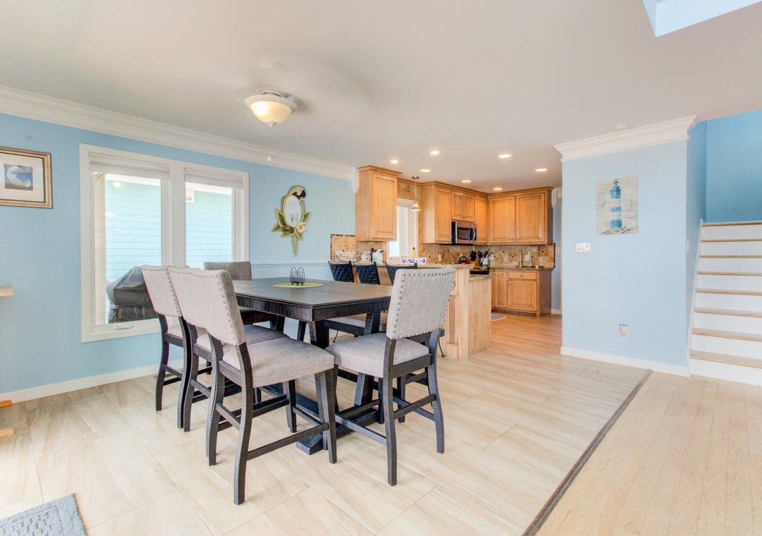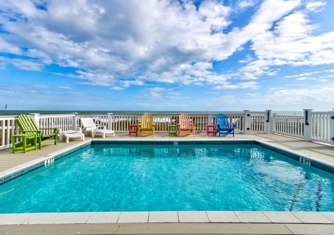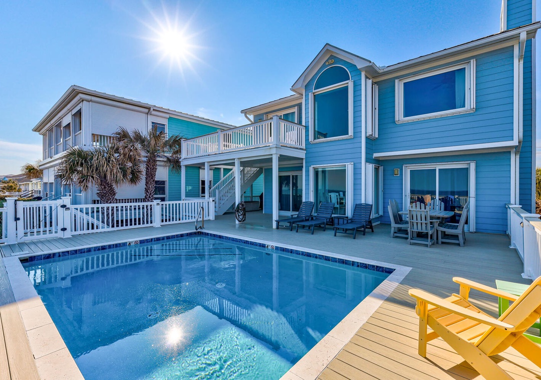 Dolphin Run is designed for comfort and fun, featuring a private pool, gas grill, boogie boards, beach chairs, and umbrellas to elevate your vacation experience. The well-equipped kitchen includes a flat cooktop stove, a combo brewer for K-cups and brew pots, and seating for 11 at the dining table and kitchen bar. Bedrooms are thoughtfully spread across three floors for added privacy, with the luxurious oceanfront master suite on the third floor offering a king-sized bed, a private deck, and a stunning view. Whether relaxing indoors with modern amenities like smart TVs and Wi-Fi or soaking up the coastal charm outdoors, Dolphin Run ensures a memorable stay for every guest.