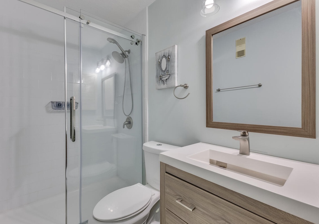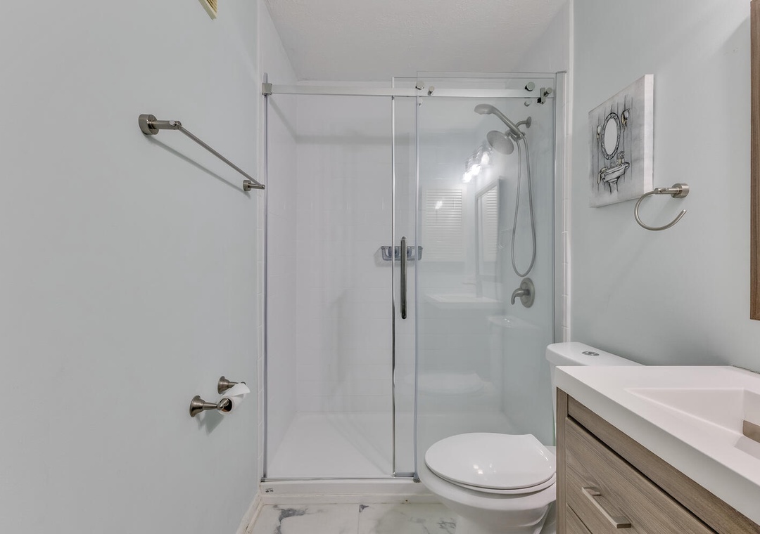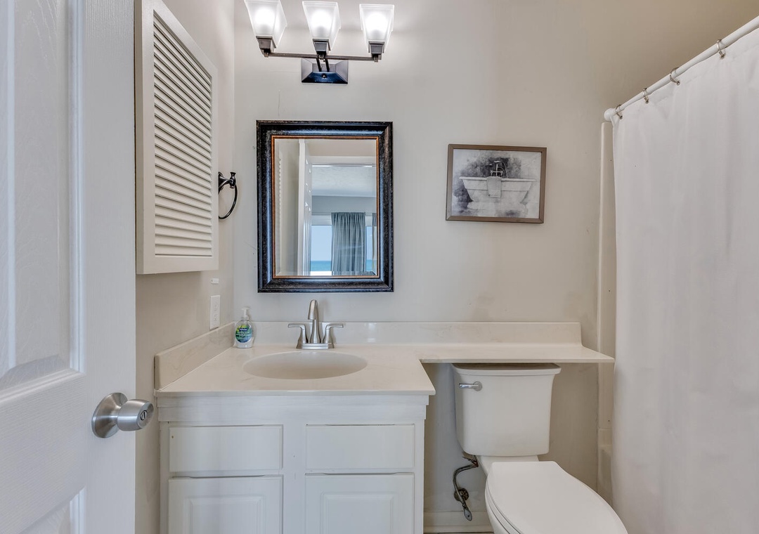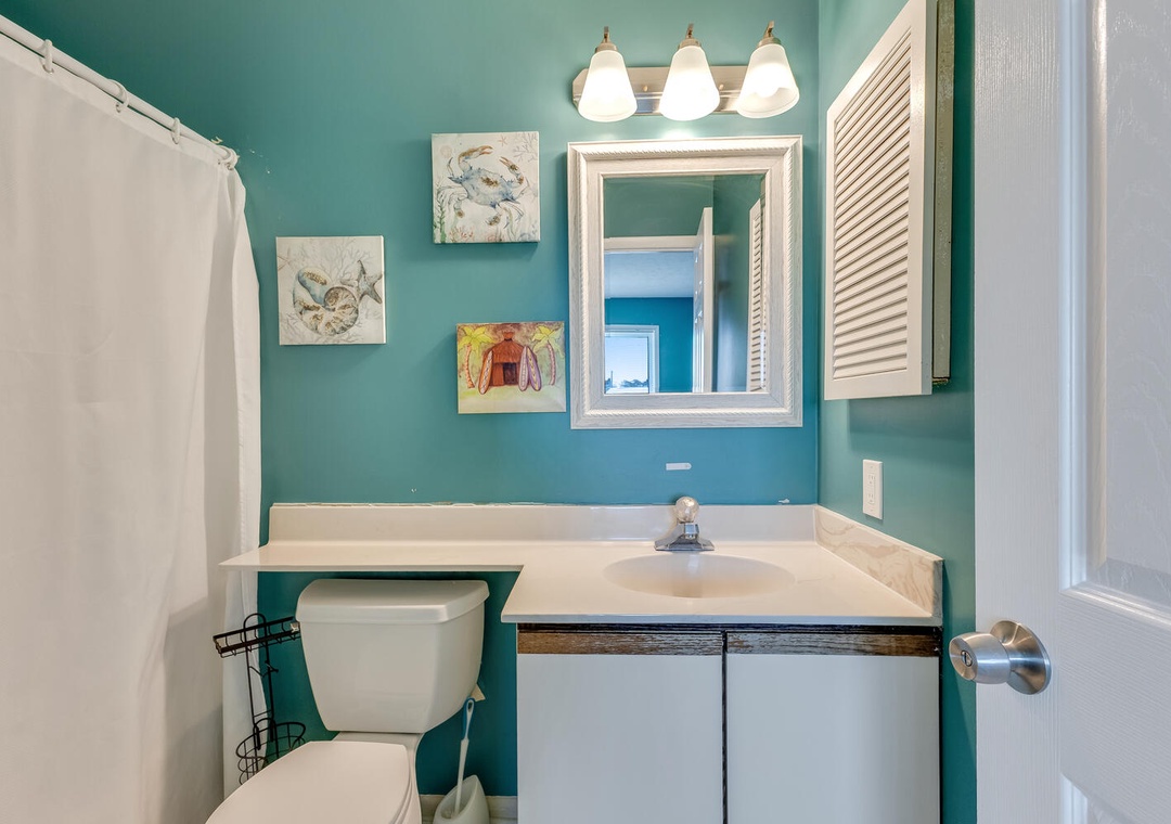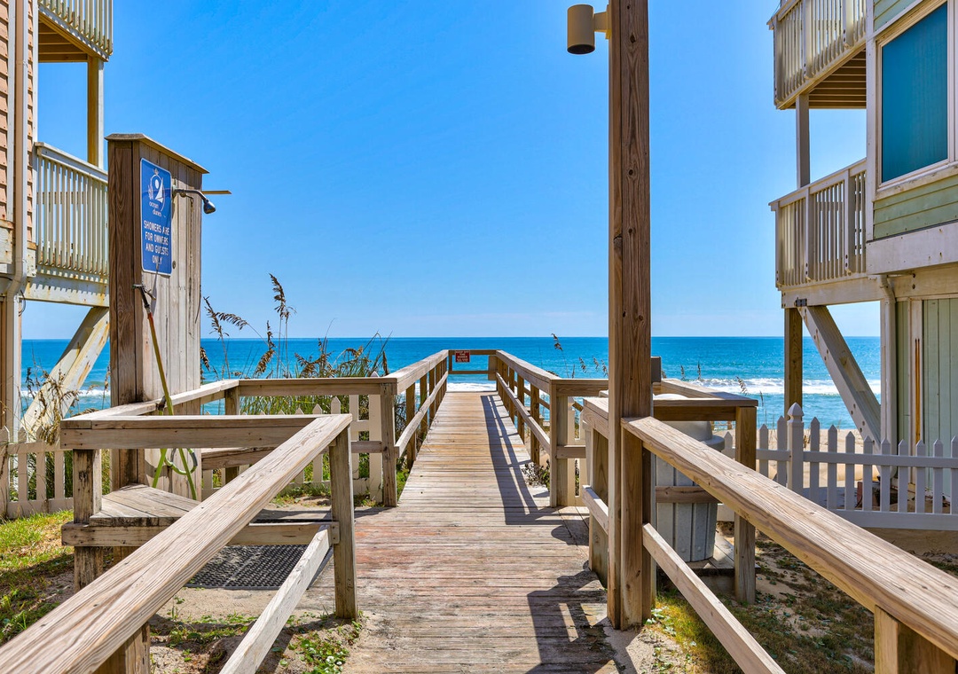 Two bedrooms upstairs provide comfort and privacy, with the master bedroom offering oceanfront deck access, a king bed, and a private bathroom with a combo tub/shower. The second bedroom has a queen bed and twin bunk bed with a second bathroom featuring a tub/shower combo. The third bedroom is on the main level with a queen bed. Whether you’re visiting the nearby Fort Fisher Aquarium or taking the ferry to Southport, Dune Our Thing is perfectly situated for exploring the best of Pleasure Island.