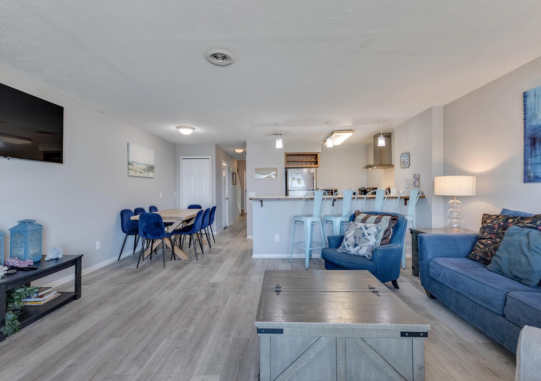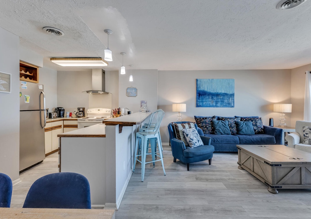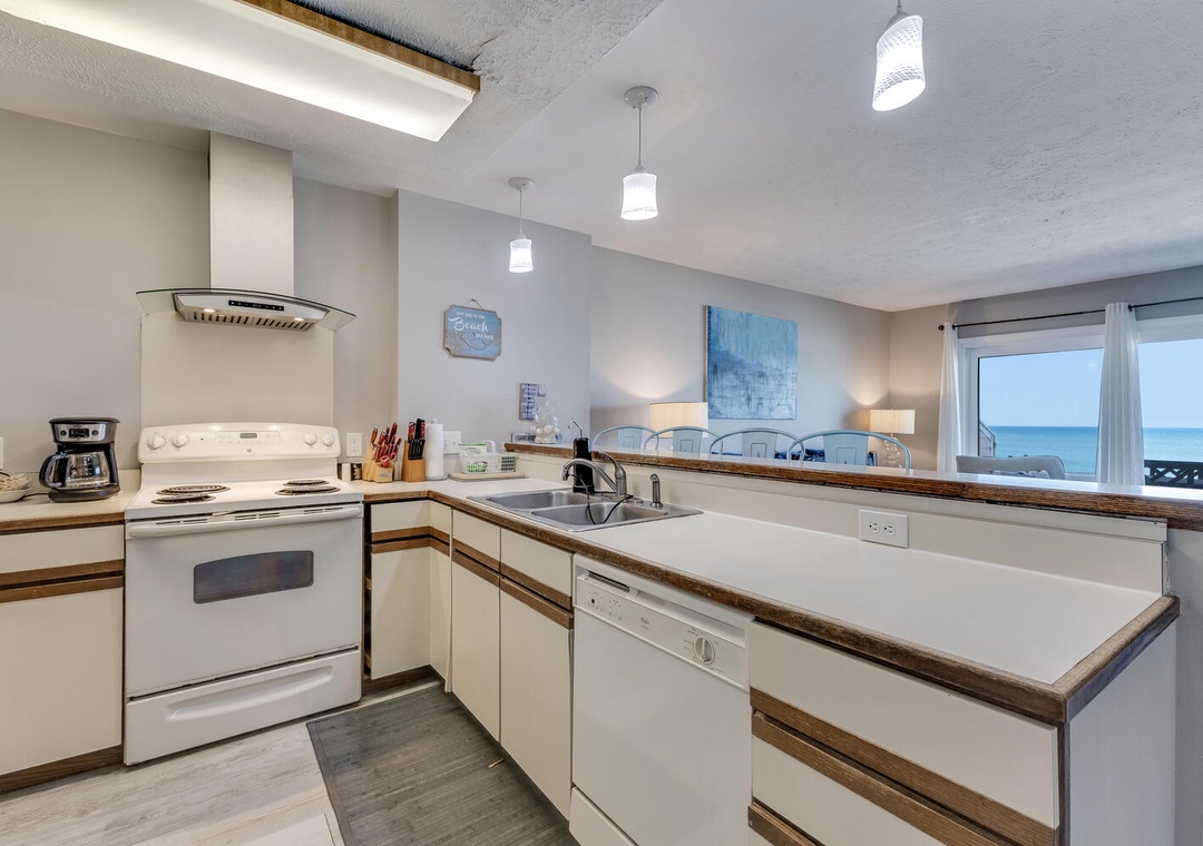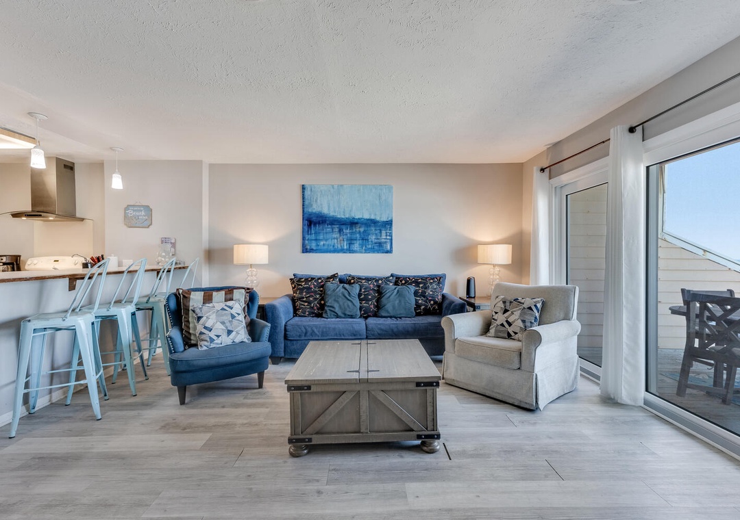 The condo's fully equipped kitchen features a cooktop stove, microwave, refrigerator, and dishwasher, along with a dining area that seats 8. The living room opens to the oceanfront deck and offers comfortable seating and a flat-screen TV for winding down after a day at the beach. You’ll also have access to multiple outdoor pools, a community recreation center with an indoor pool, a gym, and a spa, ensuring plenty of entertainment options for everyone. The community also features a charcoal grill area and convenient beach access.