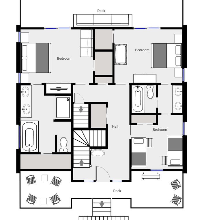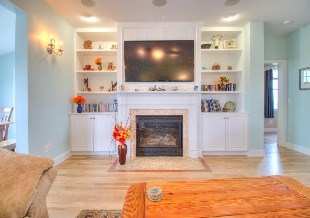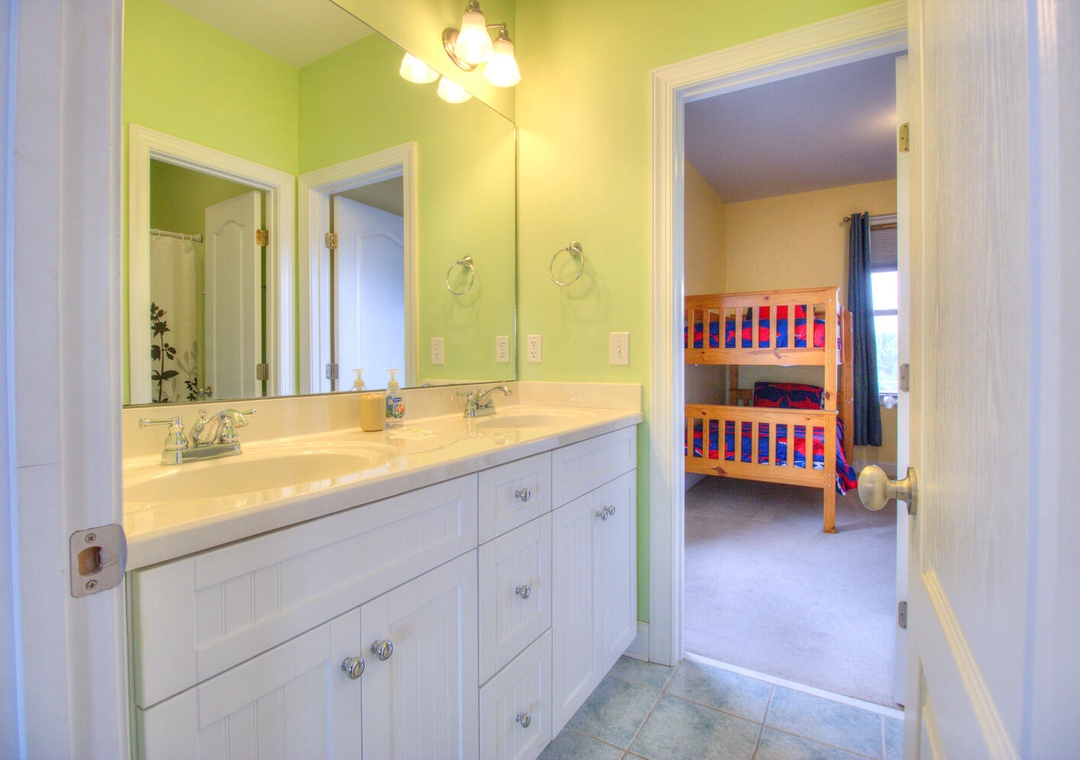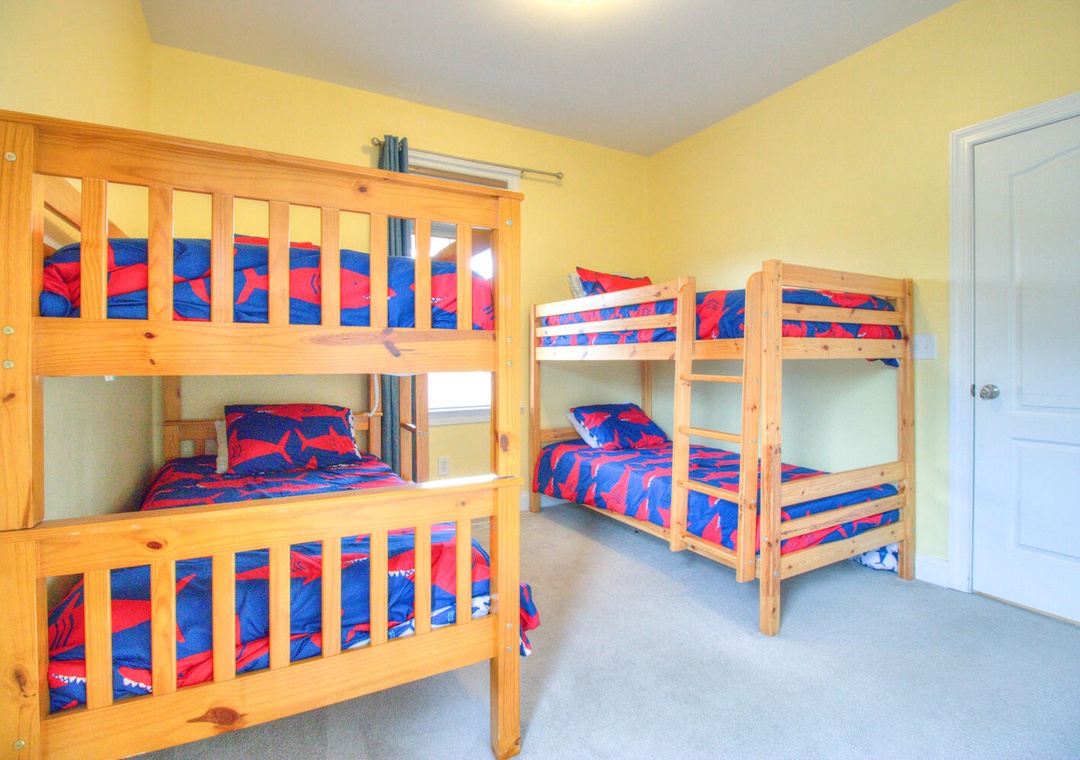This home comfortably accommodates guests with five well-appointed bedrooms. The luxurious master suite on the second floor includes a king bed, a futon, a private bathroom with a shower, a Jacuzzi tub, double vanity sinks, deck access, a walk-in closet, a flat-screen TV, a DVD player, and a ceiling fan. The second bedroom, located on the third floor, features a queen bed and a shared bathroom with a glass door walk-in shower. The third and fourth bedrooms on the second floor share a bathroom with a tub and shower combo with double vanity sinks; one features two sets of twin bunk beds, while the other has a queen bed with deck access. The fifth bedroom on the first floor includes a twin-over-full bunk bed with a trundle and shares a bathroom with the common area. Thoughtful extras such as booster seats, a crib, and alarm clocks ensure a comfortable stay for all.