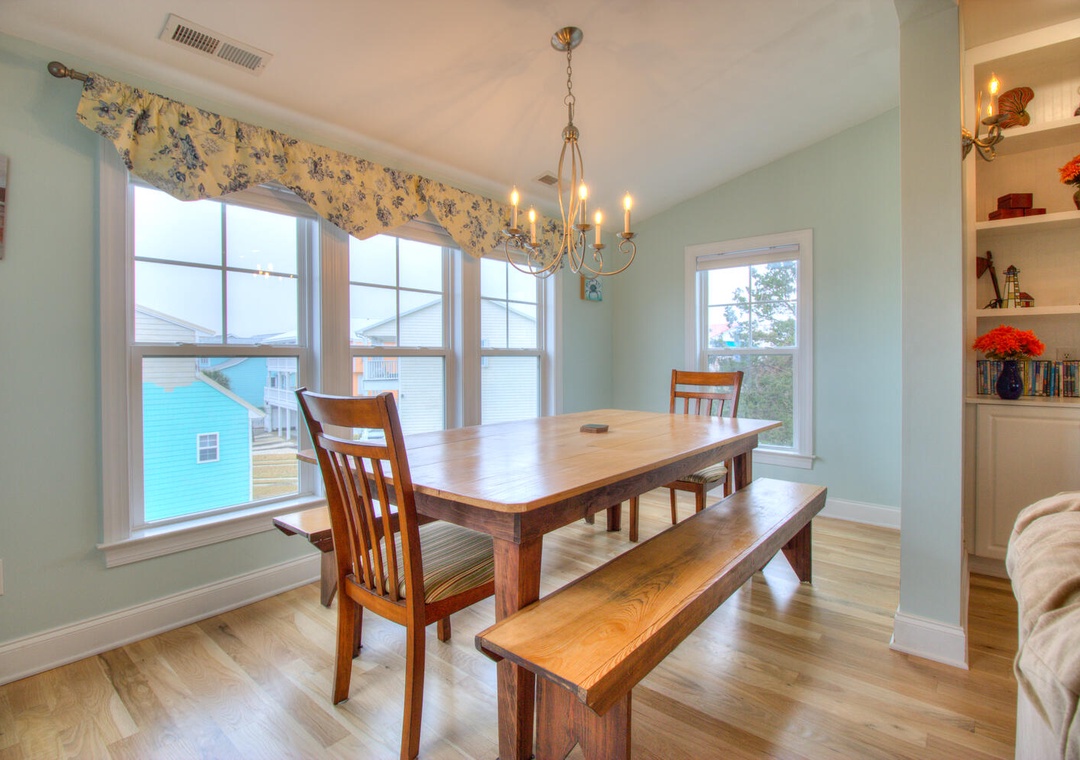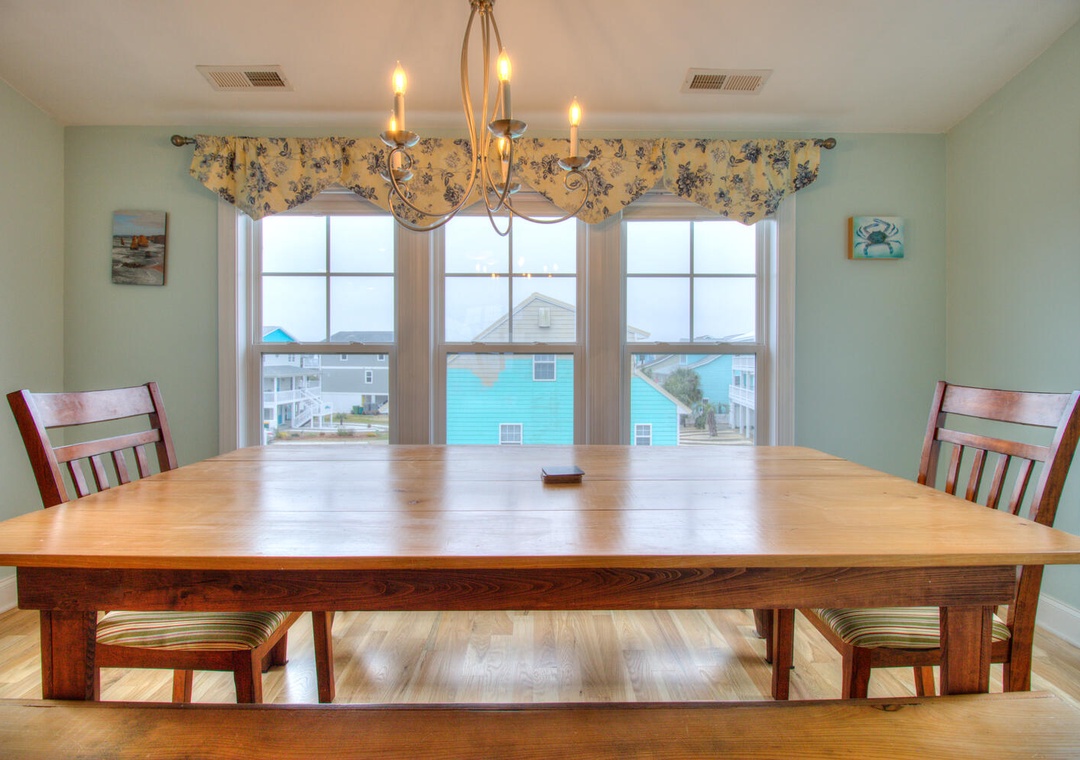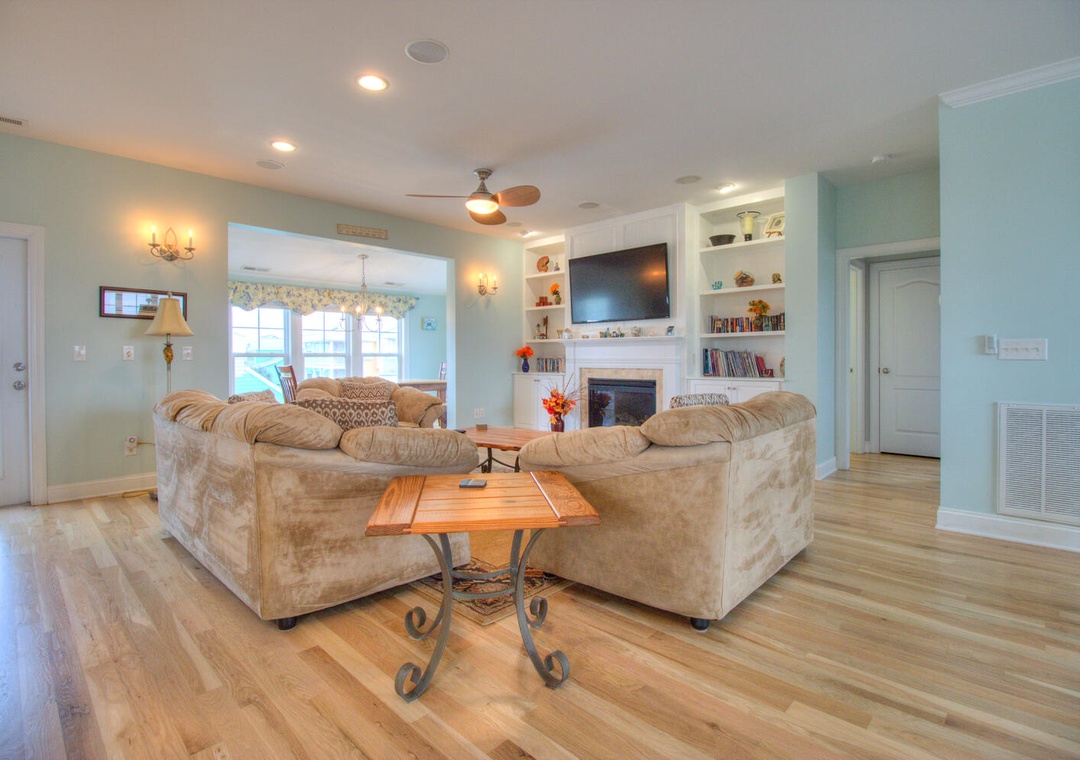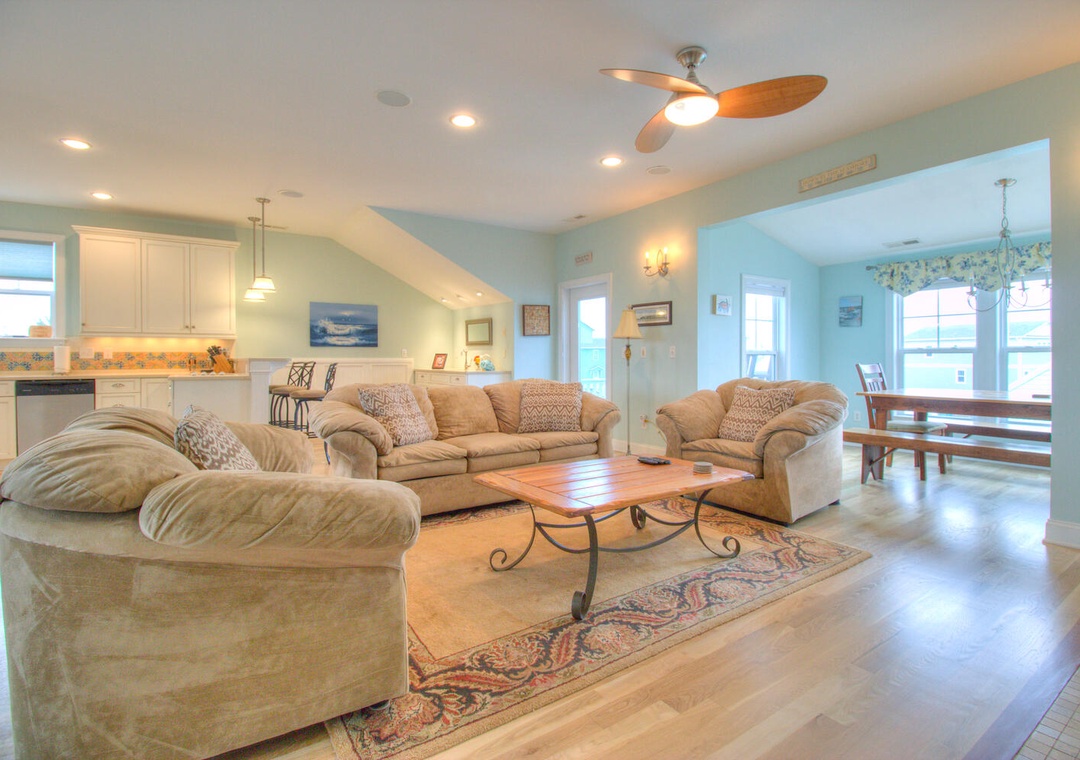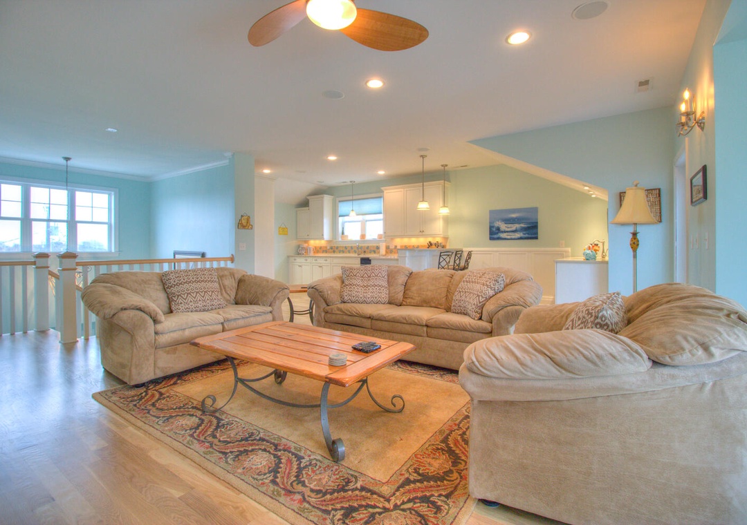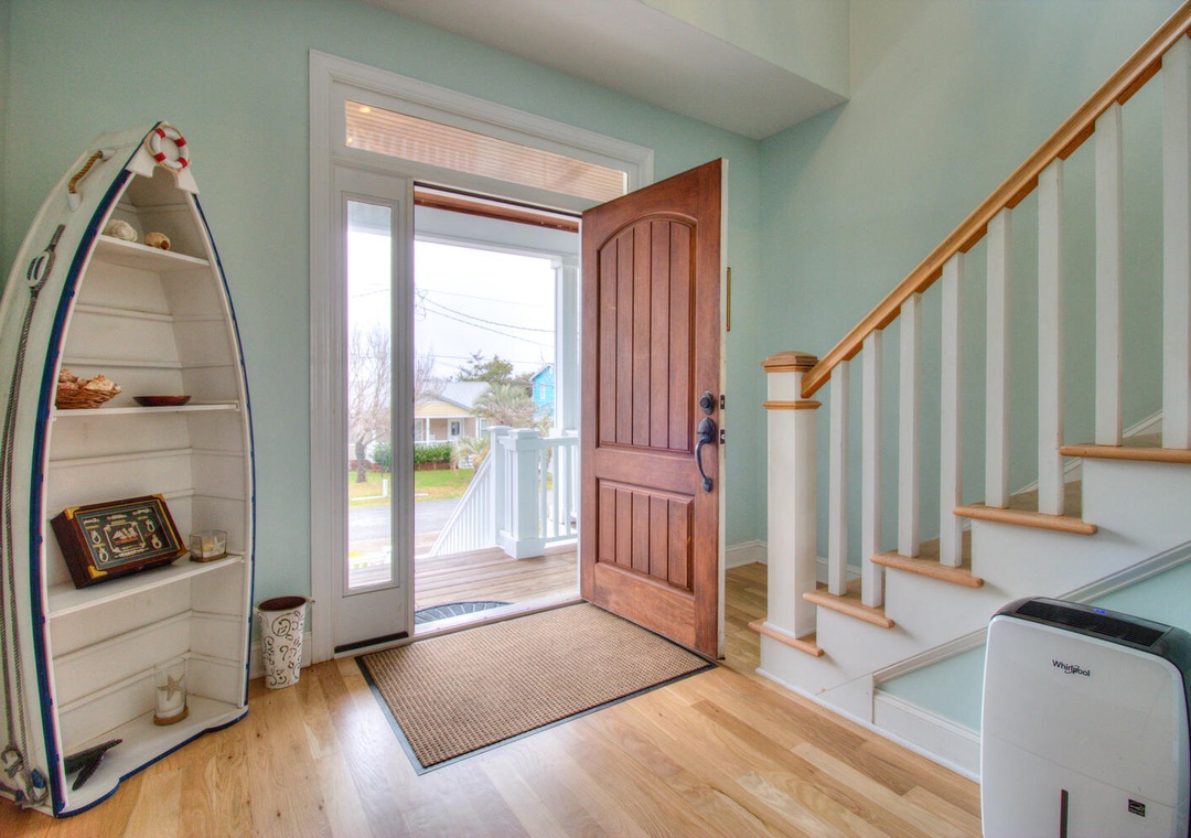 Welcome to Elanora! This spacious vacation home offers modern conveniences and ample room for relaxation, featuring complimentary WiFi, central air and heat, and a large driveway accommodating up to four cars. Outdoor amenities include a charcoal grill, an outdoor shower, a wet bar, and a fridge in the garage. The second-floor deck provides seating for six, while the front porch comfortably seats ten. Inside, the fully equipped kitchen boasts a dining table for eight, a kitchen bar for three, and appliances such as a refrigerator with an ice maker, a 12-cup drip coffee maker, a blender, a toaster, a pancake griddle, a microwave, and a flat cooktop stove. The adjacent living room, offering balcony access, features seating for six, a flat-screen TV, a stereo, a Blu-ray player, streaming services, DVDs, books, board games, and a ceiling fan. Additional conveniences include a laundry area with a front-loading washer and dryer, an iron, and a first-floor common area with seating, a large futon, a flat-screen TV, and an Xbox 360.