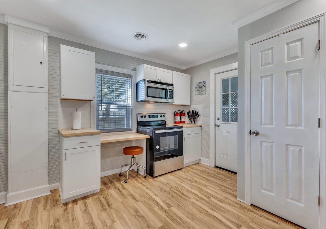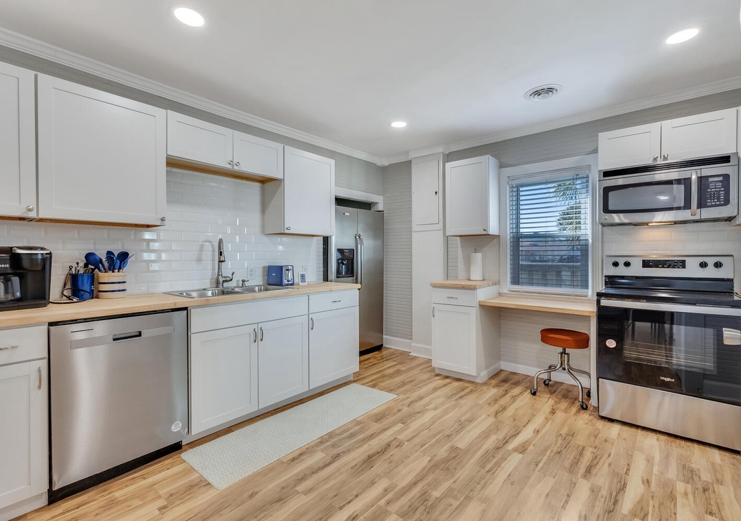 The newly renovated kitchen serves as the heart of the home, boasting stainless steel appliances, butcher block countertops, new cabinetry, and a classic subway tile backsplash. With three bedrooms and two full bathrooms in the main house, there’s plenty of room for everyone to unwind. Outside, a deep, fenced-in lot provides privacy and space to enjoy the fresh air just moments from the shoreline.