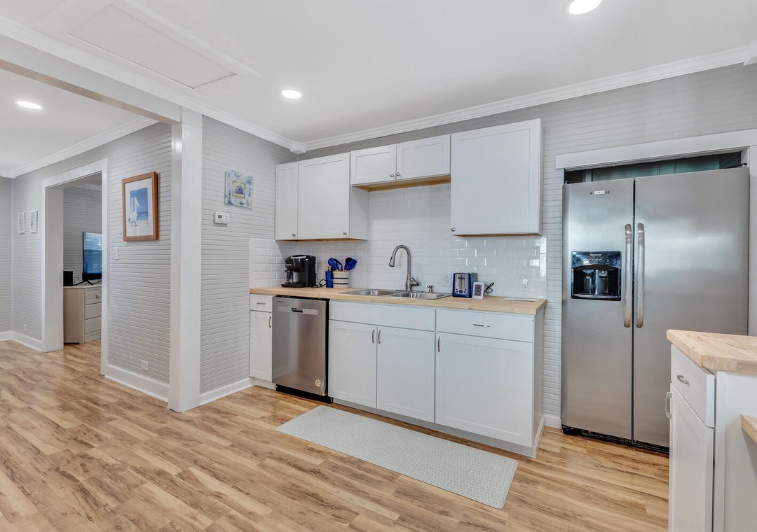 The newly renovated kitchen serves as the heart of the home, boasting stainless steel appliances, butcher block countertops, new cabinetry, and a classic subway tile backsplash. With three bedrooms and two full bathrooms in the house, there’s plenty of room for everyone to unwind. Outside, a deep, fenced-in lot provides privacy and space to enjoy the fresh air just moments from the shoreline.