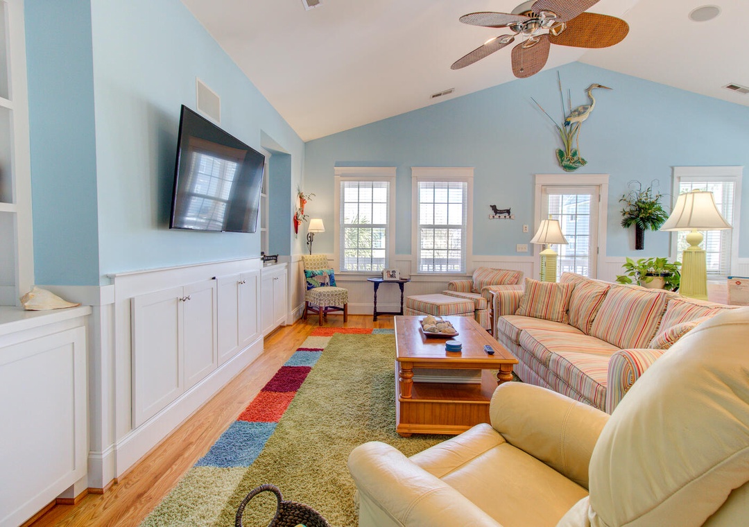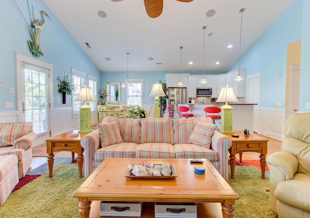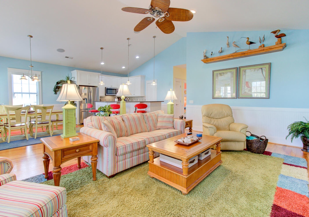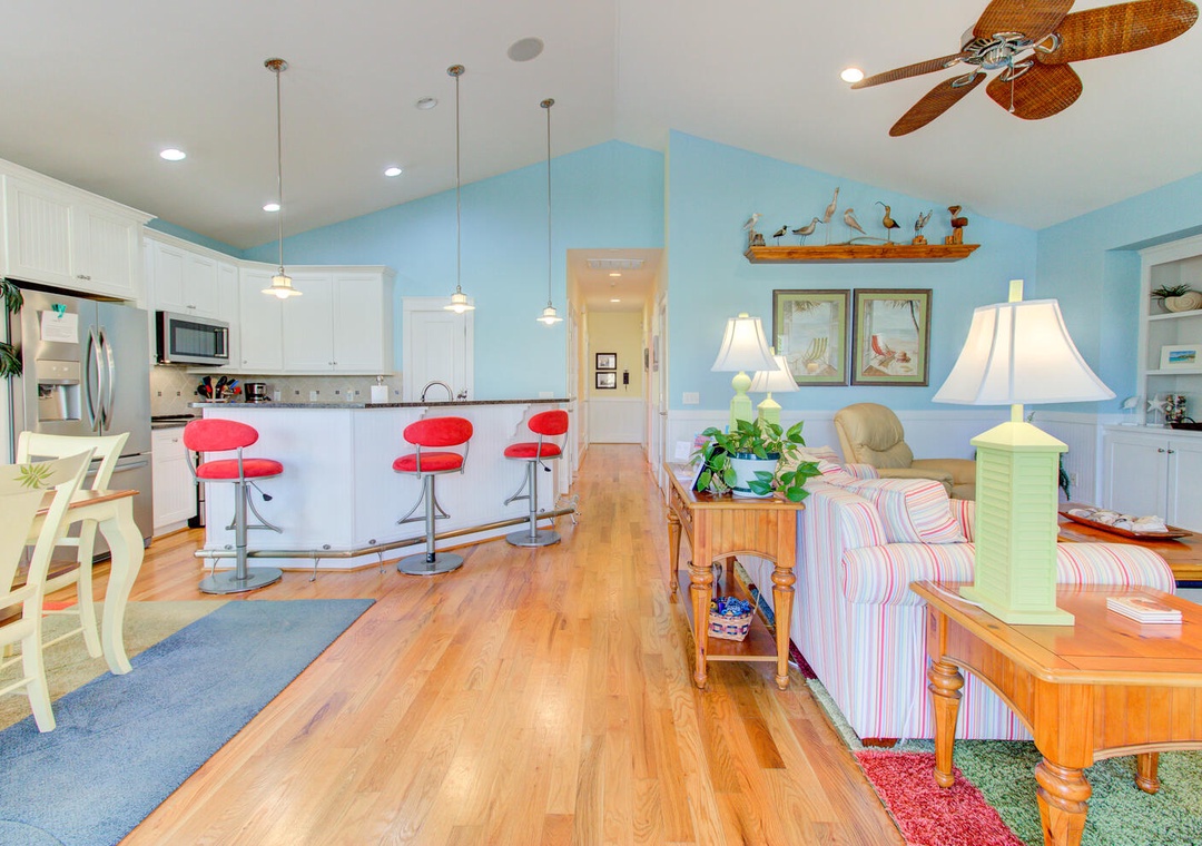 Step inside to an inviting open-concept living area featuring comfortable seating for six, a flat-screen TV with cable, and a ceiling fan to keep things cool. The fully equipped kitchen offers everything needed for home-cooked meals, including a dining table for six, bar seating for three, and essentials like a flat cooktop stove, dishwasher, griddle, and blender. A first-floor common area provides an additional space to gather, with a sleeper sofa, Roku-equipped TV, DVD player, and a patio for outdoor relaxation. Plus, the home is well-equipped for families with a highchair and Pack 'n Play available for little travelers.
