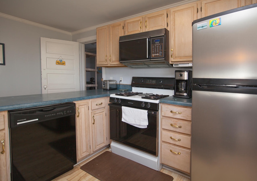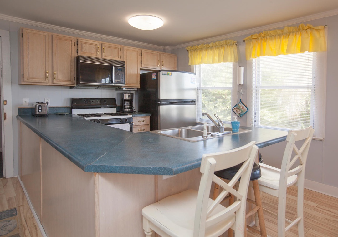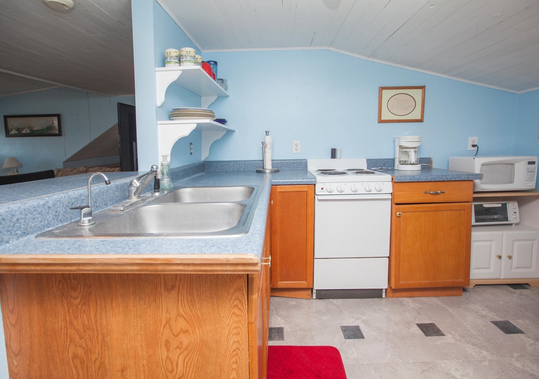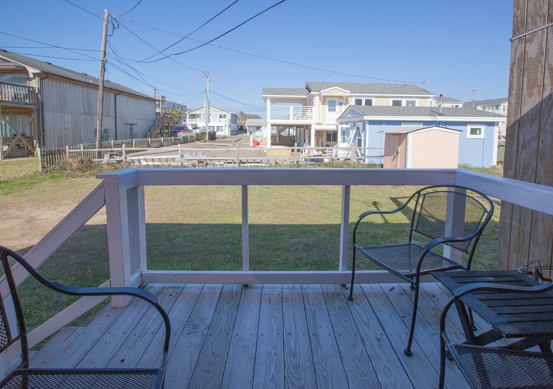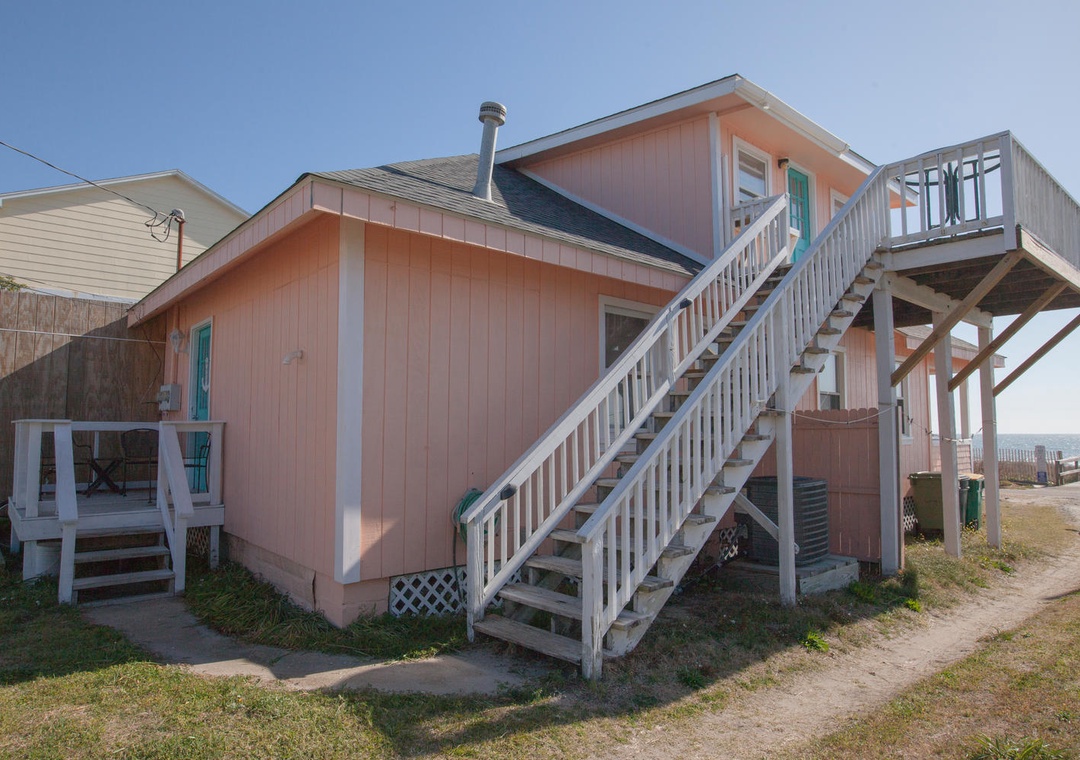 2nd Floor Ocean View Accessed via Exterior Stairs on Side of House Common Area with Seating for 6 Flat Screen TV with Cable VHS Player DVD Player Full Kitchen Dining Table with Seating for 3 Kitchen Bar with Seating for 2 Refrigerator Keurig Coffee Pot Coil Top Stove Oven Toaster Oven Microwave