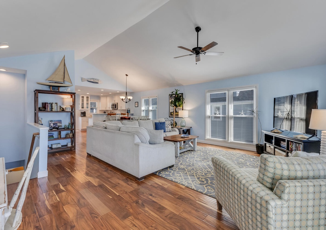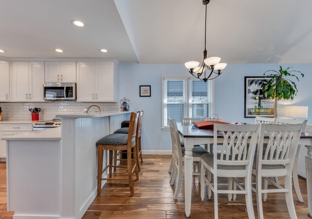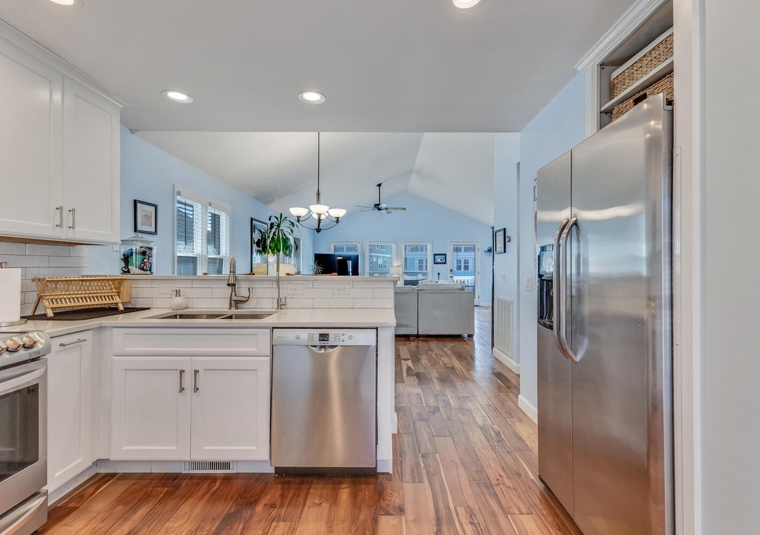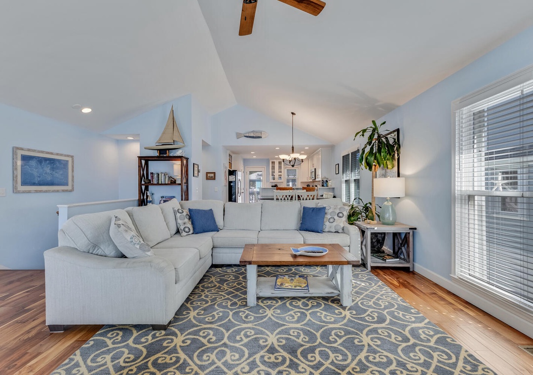 Inside, the home features a beautifully furnished and well-equipped kitchen designed to handle everything from quick breakfasts to large group meals. The generous living spaces offer plenty of room to gather, relax, and enjoy time together after a day at the beach. Each bedroom provides comfortable accommodations, creating a welcoming environment where everyone can unwind.