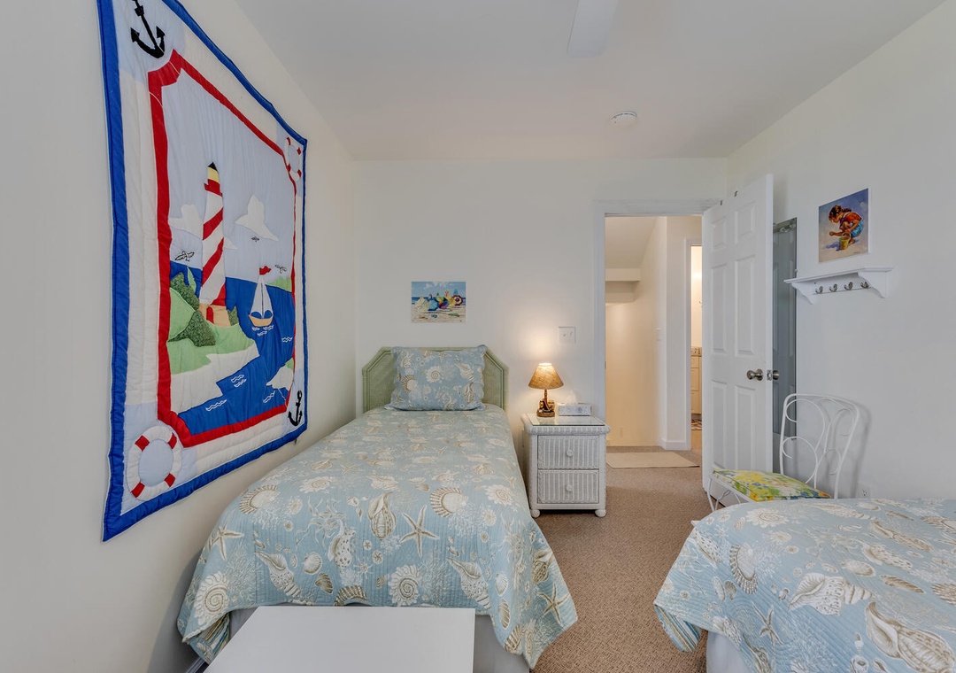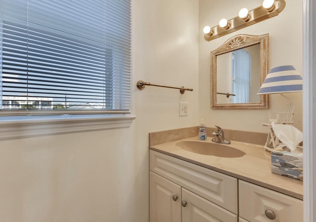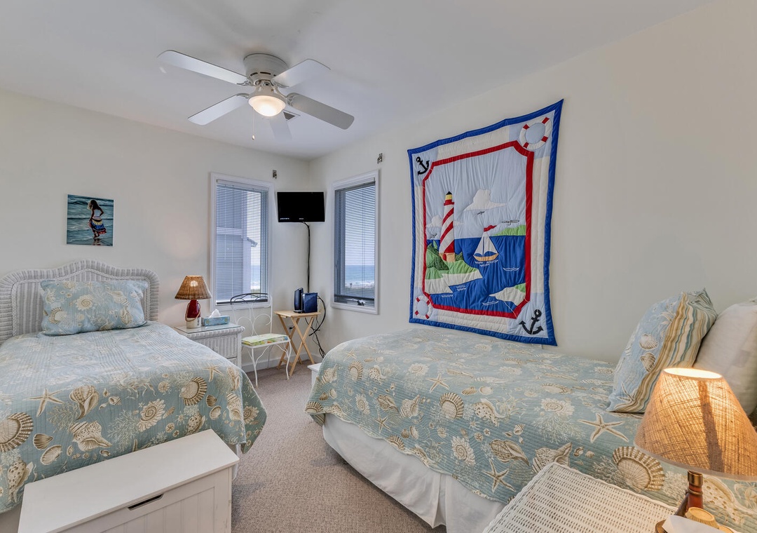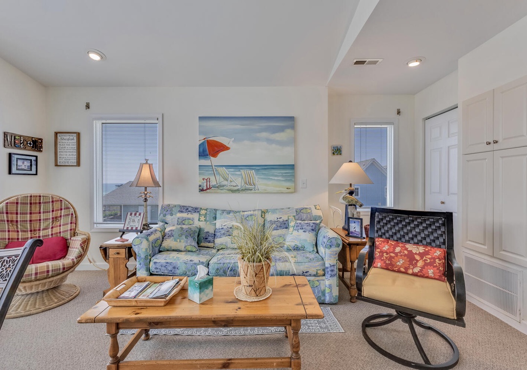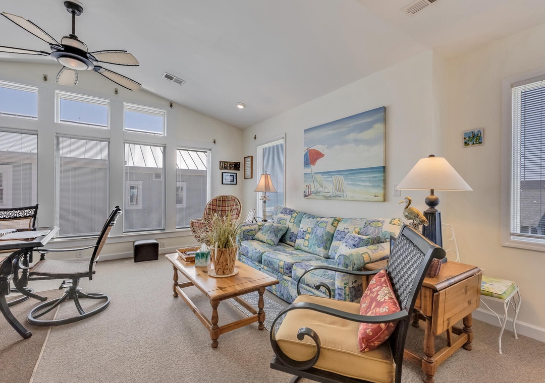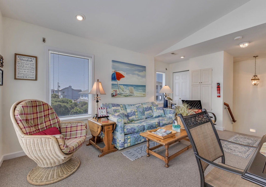 Inside, the home comfortably sleeps up to 6 guests with thoughtfully designed living spaces spread across multiple levels, offering plenty of room to relax and unwind. The main living area is bright and airy with coastal décor, featuring large windows that bring in the natural light.