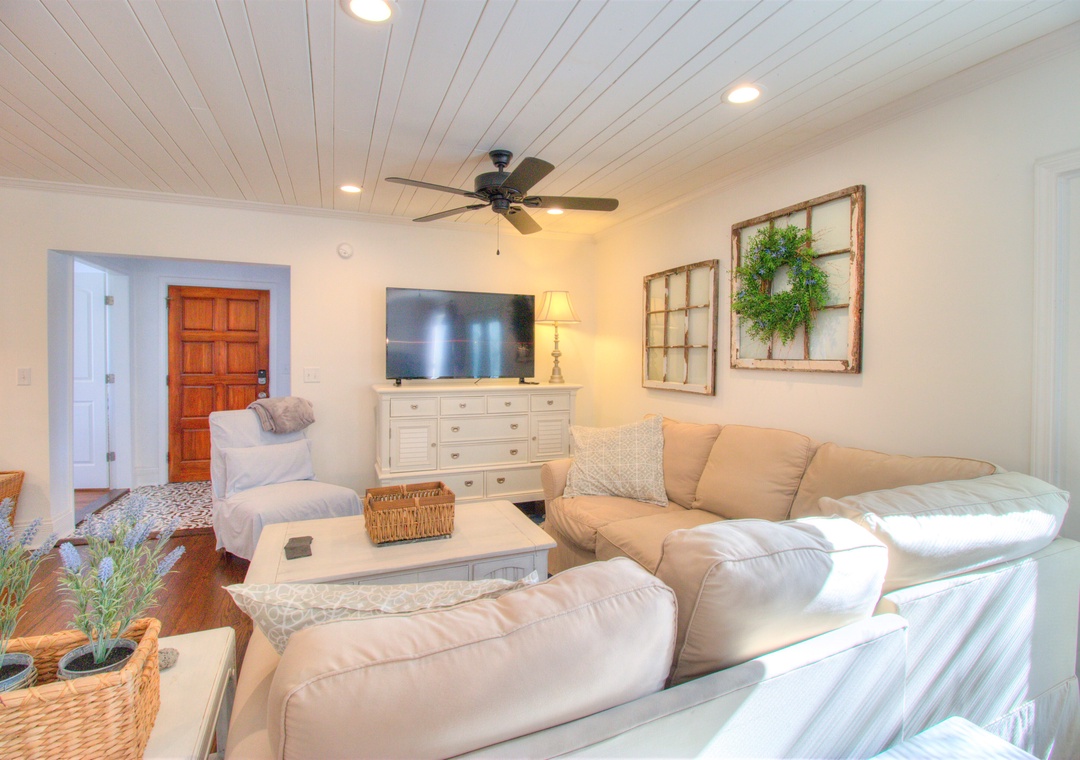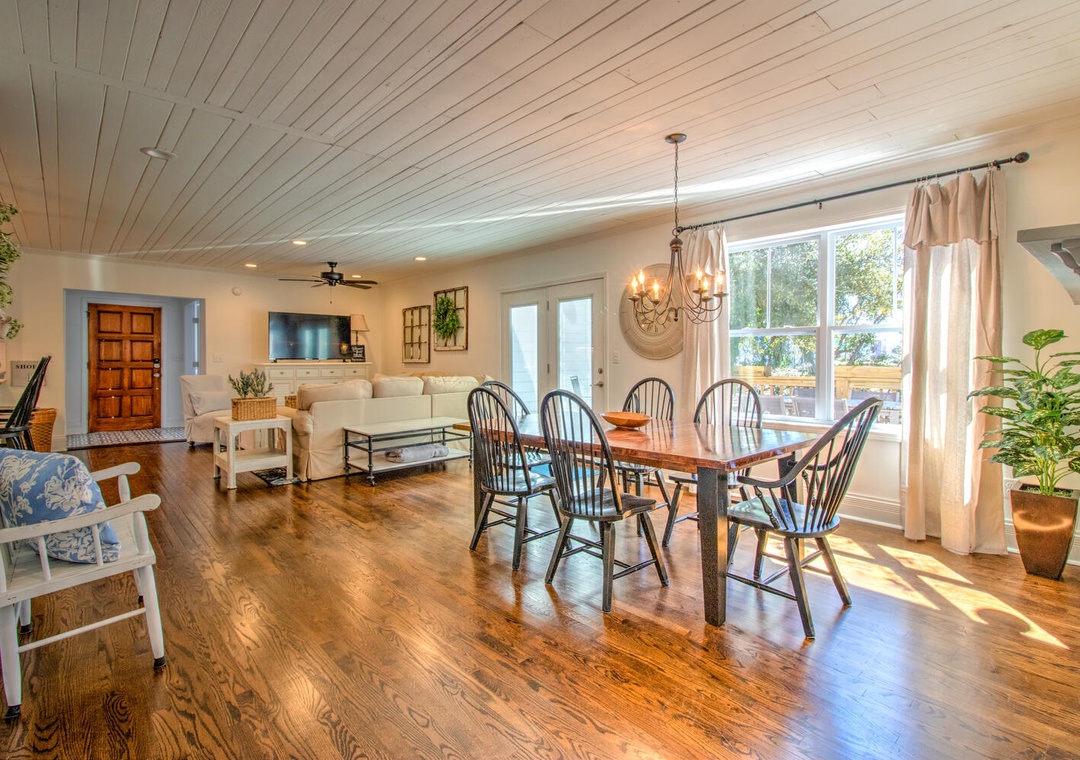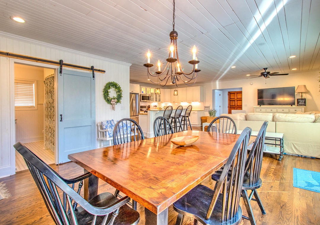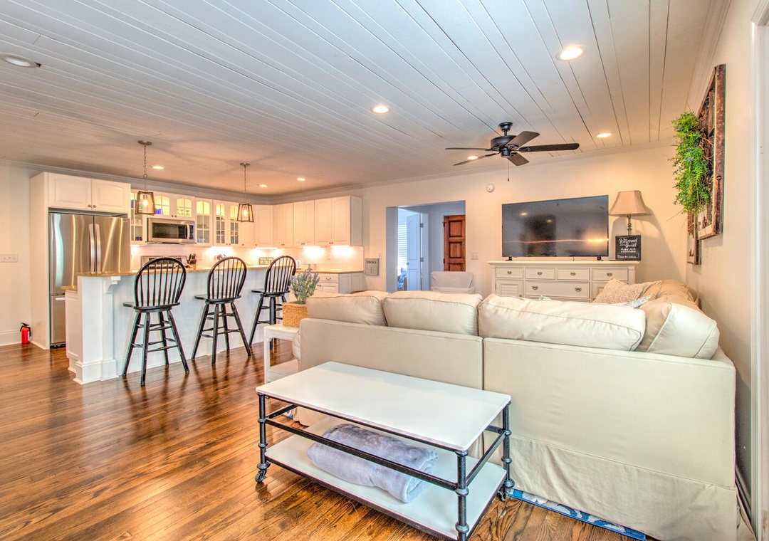 Inside, the fully equipped kitchen and dining area offer everything you need for preparing and enjoying meals. The dining table seats six, with additional bar seating for three. The kitchen includes a refrigerator, flat cook-top stove, oven, microwave, toaster, drip coffee maker, blender, dishwasher, and specialty items like a pancake griddle, roasting pan, hand mixer, and large soup pot. The adjacent living room is a cozy gathering spot with seating for seven, a flat-screen smart TV, and a ceiling fan.
