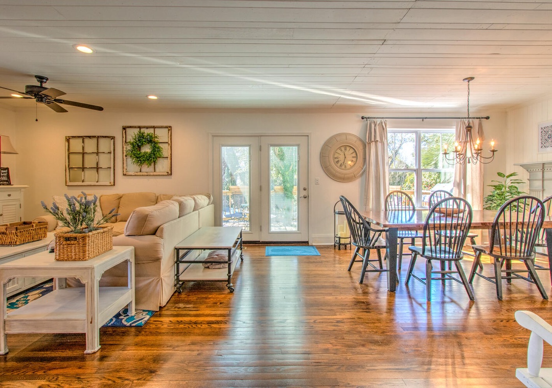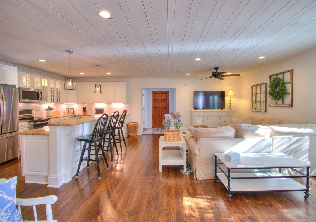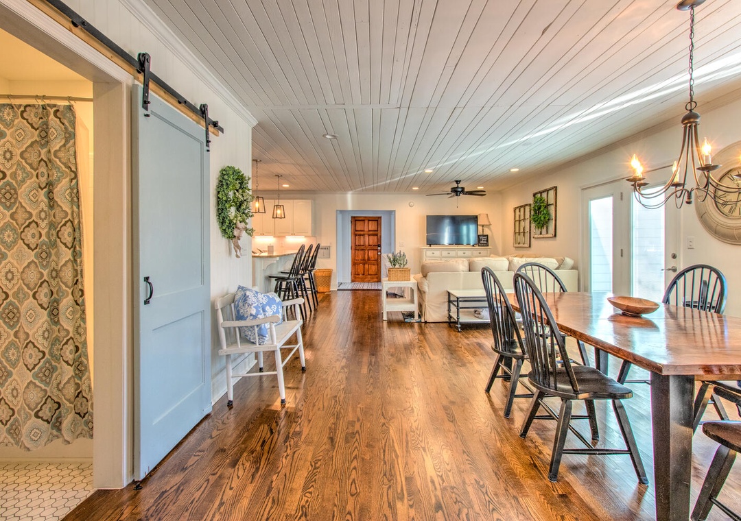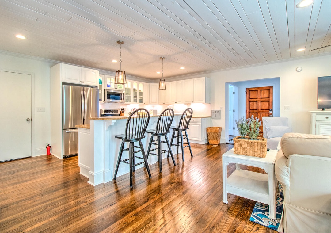 Inside, the fully equipped kitchen and dining area offer everything you need for preparing and enjoying meals. The dining table seats six, with additional bar seating for three. The kitchen includes a refrigerator, flat cook-top stove, oven, microwave, toaster, drip coffee maker, blender, dishwasher, and specialty items like a pancake griddle, roasting pan, hand mixer, and large soup pot. The adjacent living room is a cozy gathering spot with seating for seven, a flat-screen smart TV, and a ceiling fan.