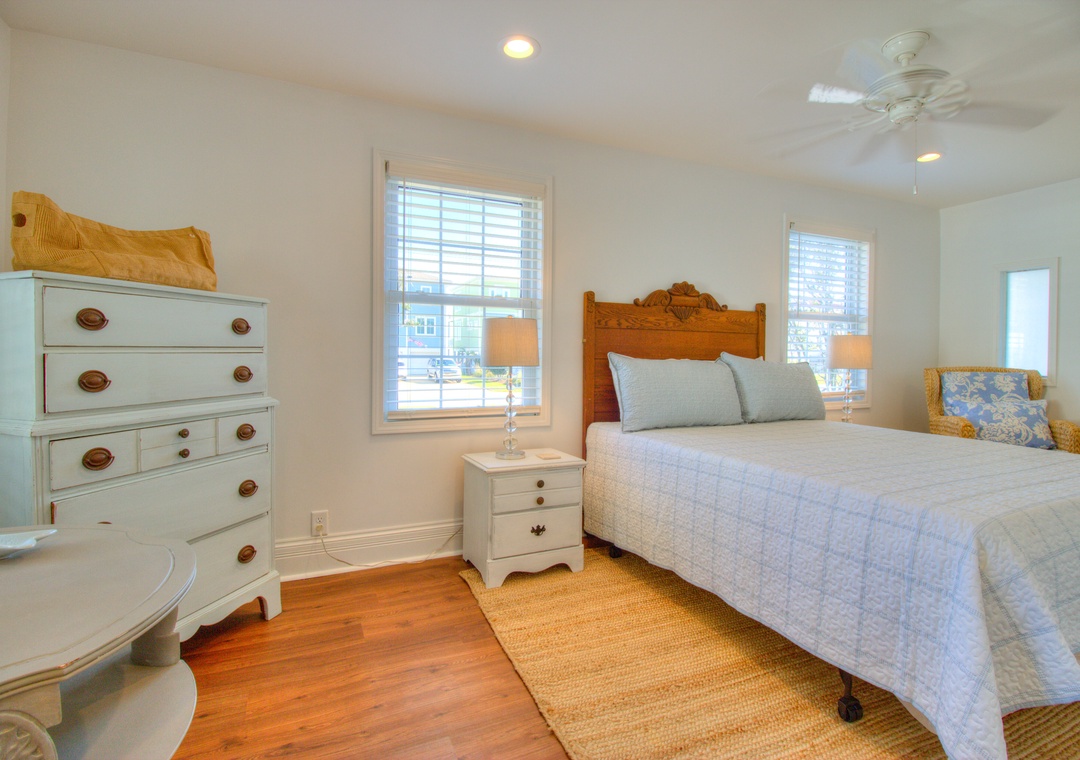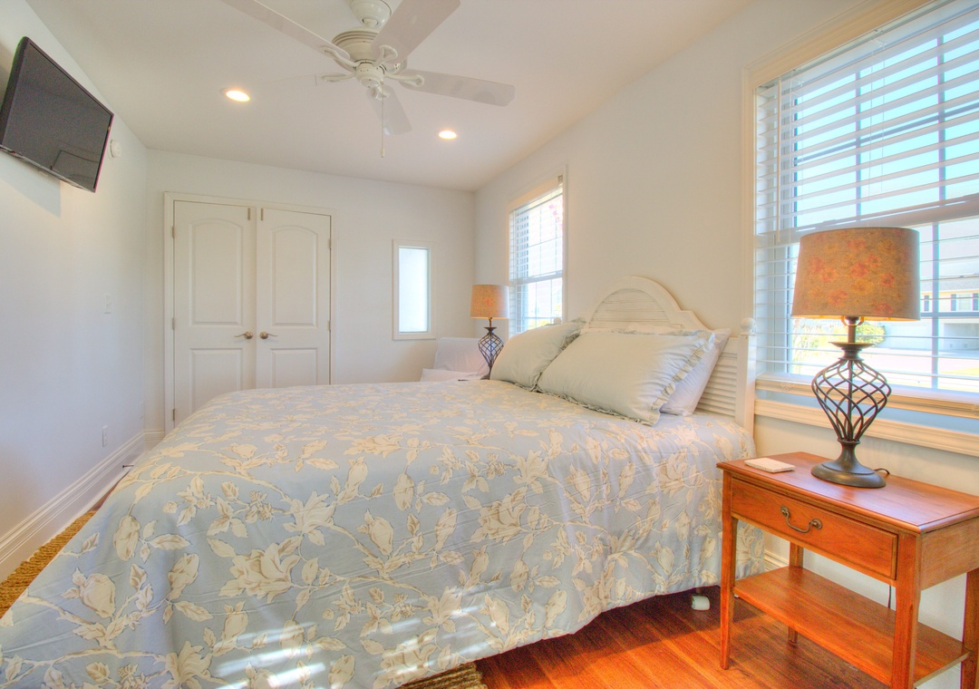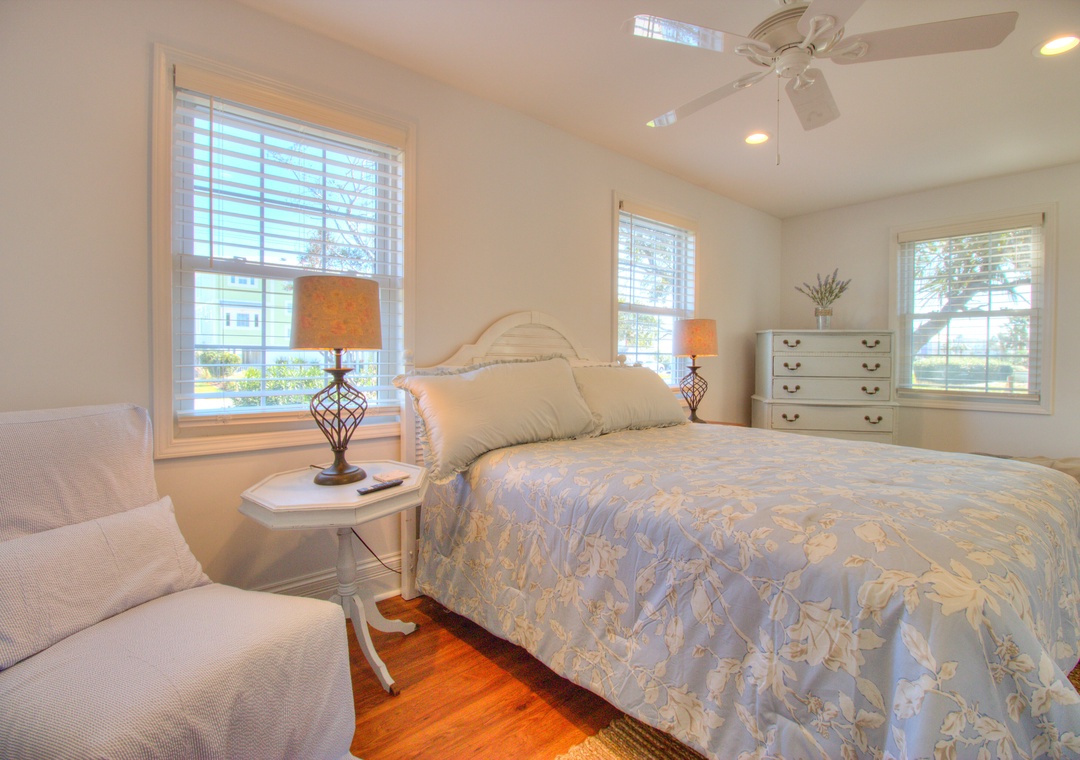 Sleeping arrangements are thoughtfully designed for comfort and privacy. Two master suites each feature queen beds, flat-screen smart TVs, ceiling fans, and private bathrooms—one with a shower equipped with a built-in seat. Bedroom #3 offers twin over twin bunk beds, perfect for children, while Bedroom #4 provides two twin beds. Both rooms share a bathroom with a shower/tub combo. With its well-appointed spaces and thoughtful amenities, Kure Cottage is the ideal getaway for families and groups alike.