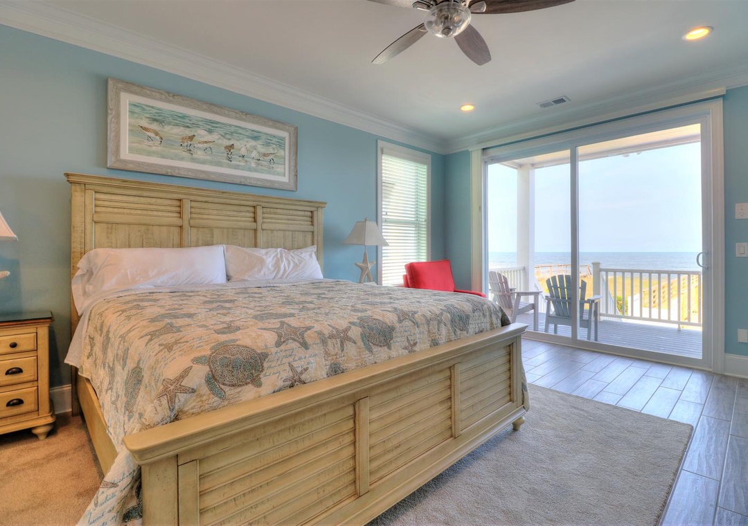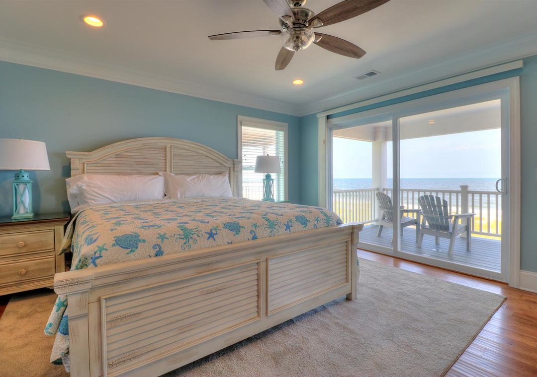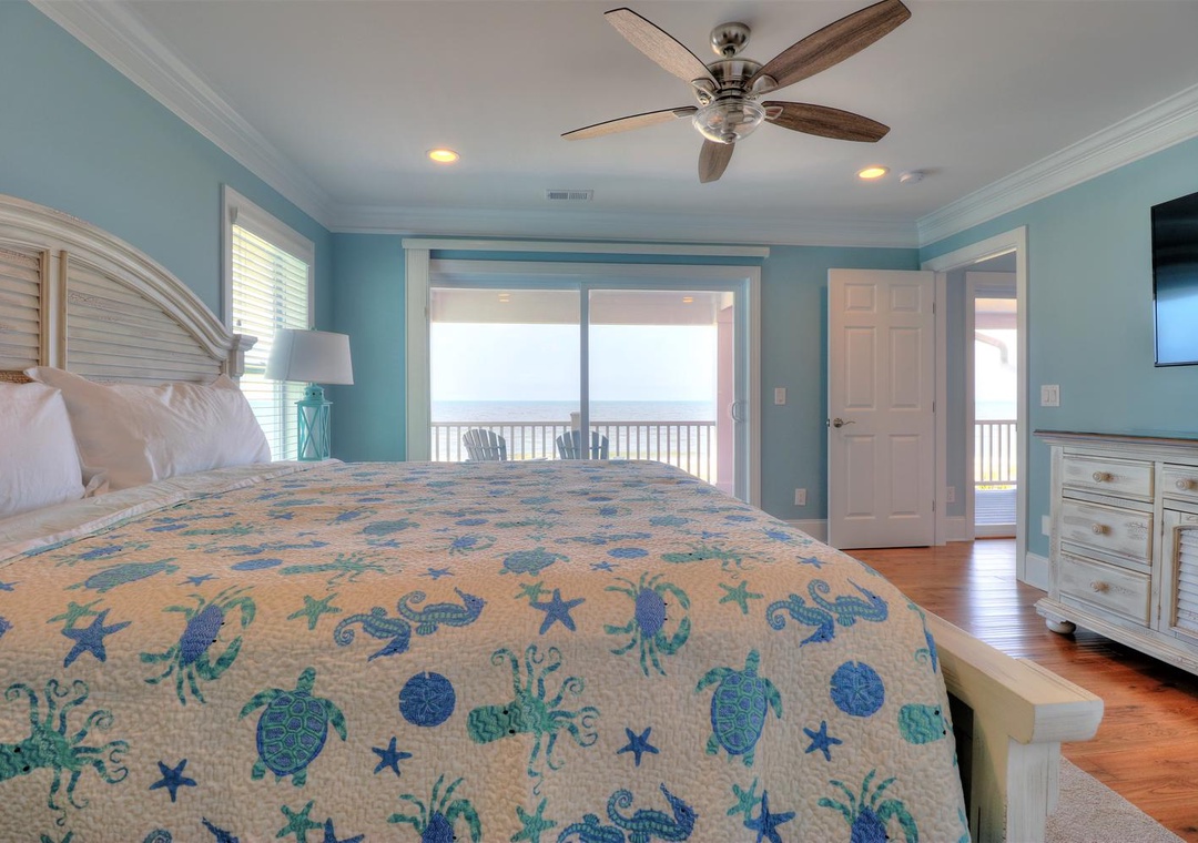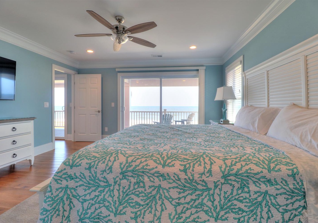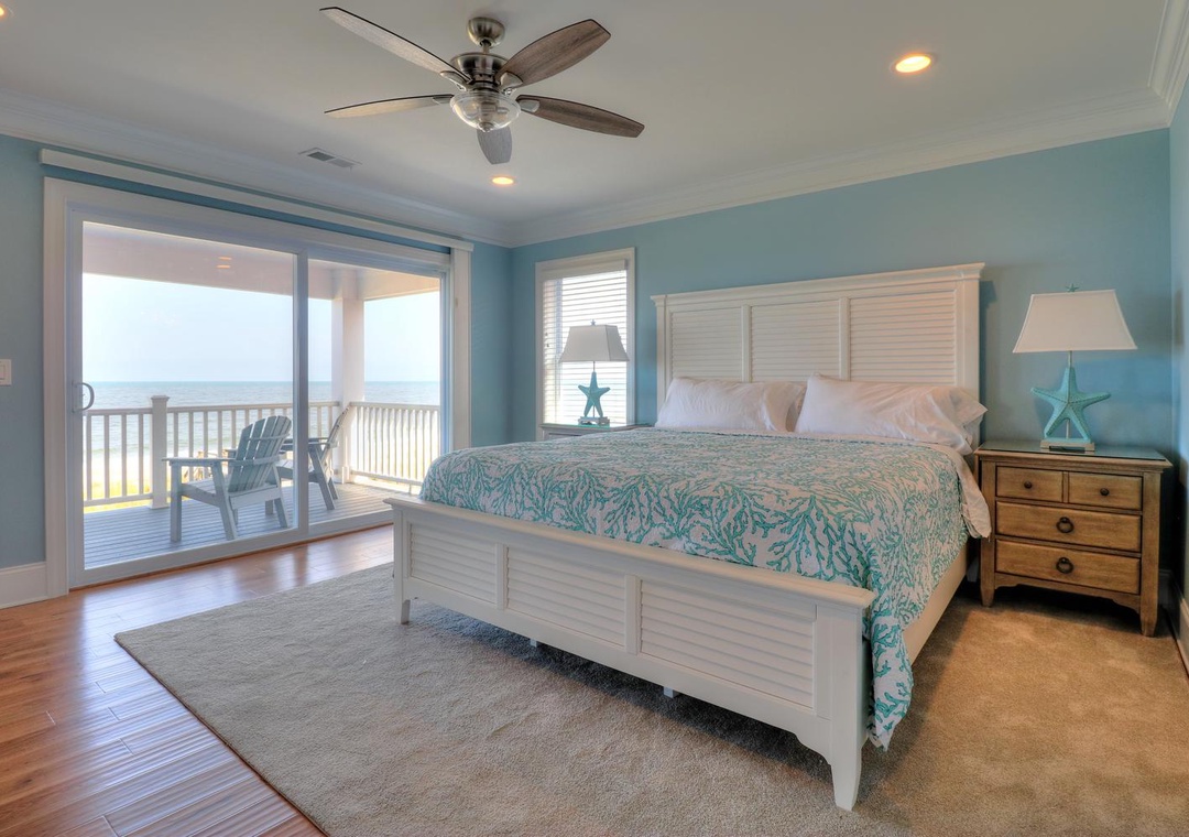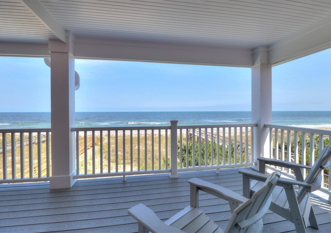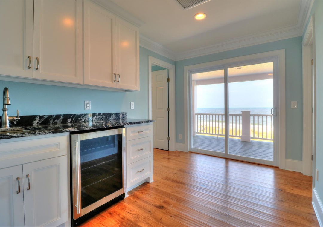The third floor offers a common area with deck access and a mini-bar complete with a wine cooler and coffee station. This level houses four spacious bedrooms, including two ocean-side king suites with private bathrooms and flat-screen TVs, as well as two additional king bedrooms with en-suite bathrooms. Designed with both relaxation and entertainment in mind, this home is perfect for a memorable coastal retreat.