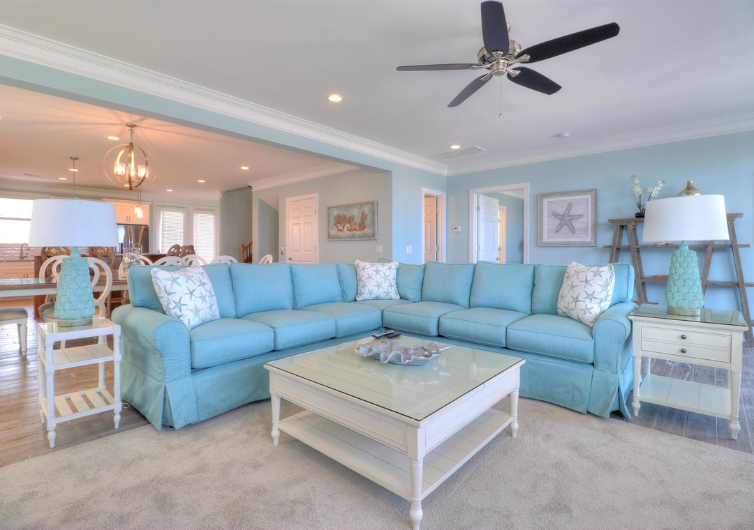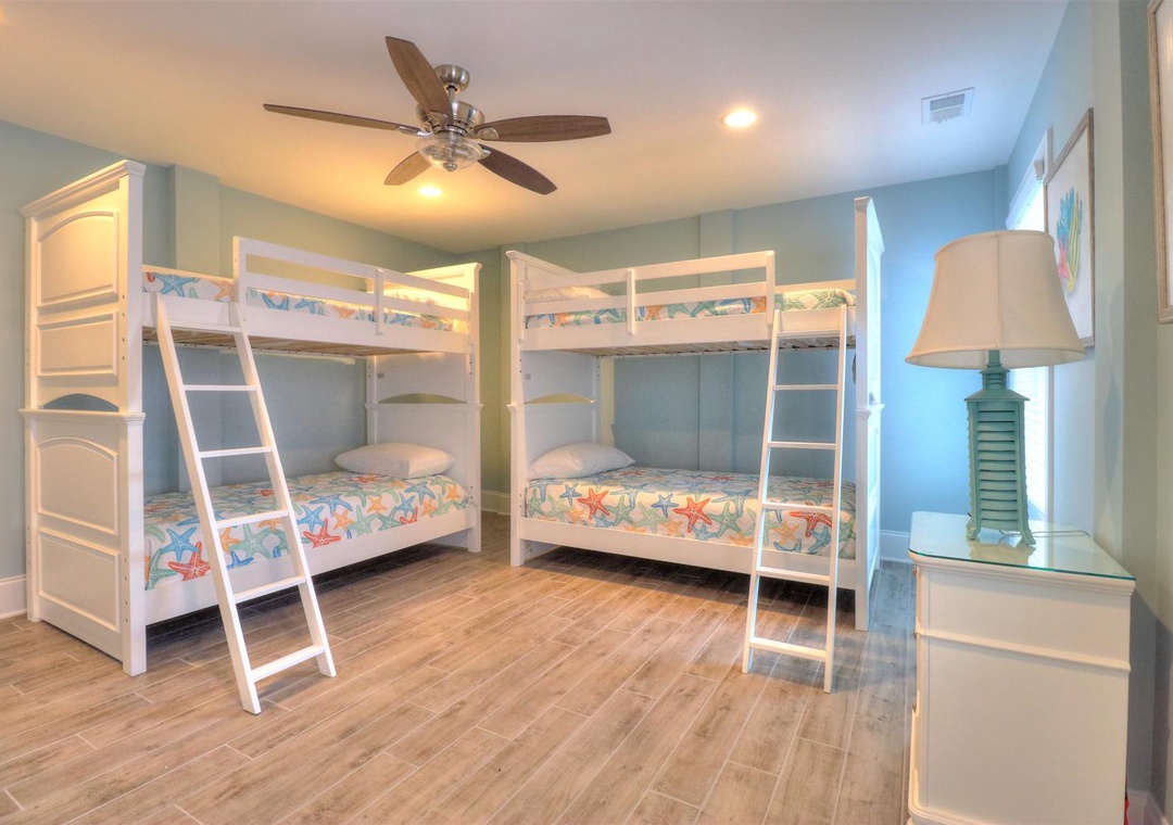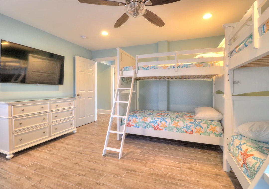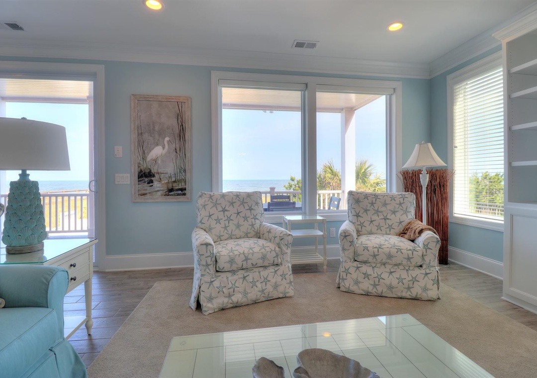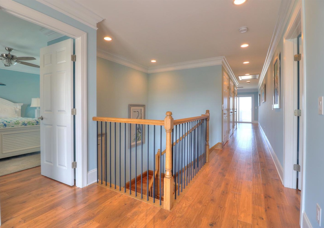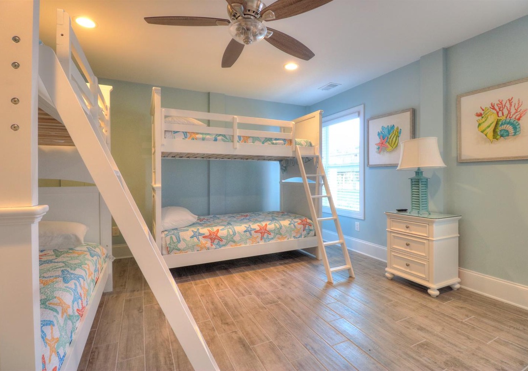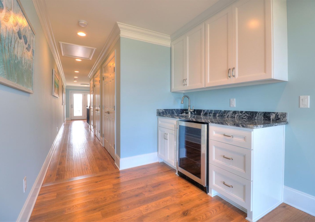 The third floor offers a common area with deck access and a mini-bar complete with a wine cooler and coffee station. This level houses four spacious bedrooms, including two ocean-side king suites with private bathrooms and flat-screen TVs, as well as two additional king bedrooms with en-suite bathrooms. Designed with both relaxation and entertainment in mind, this home is perfect for a memorable coastal retreat.