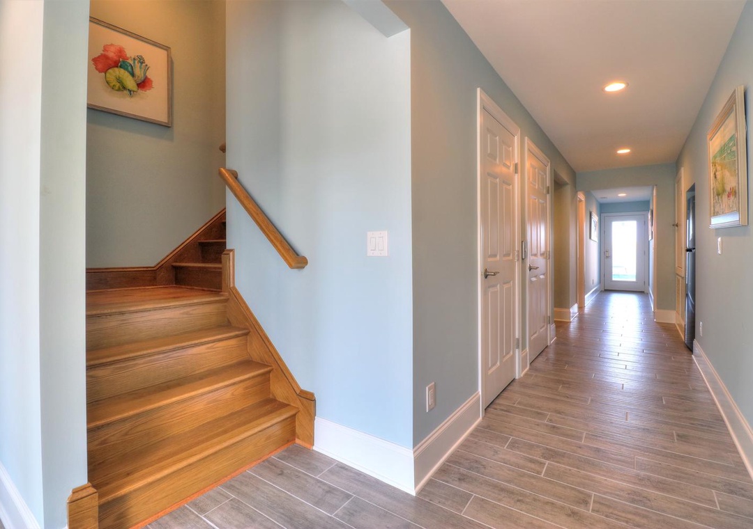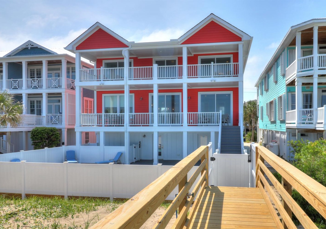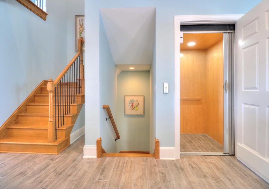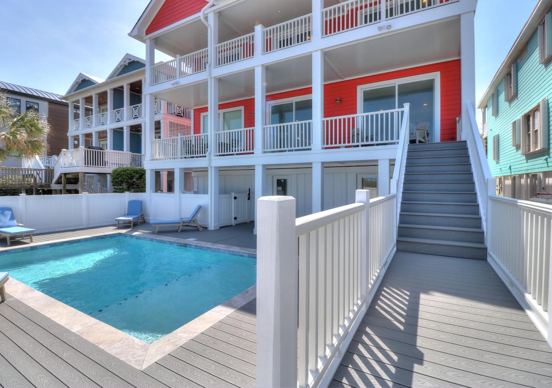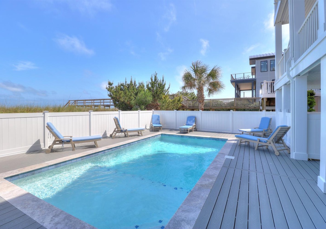 Welcome to Less Stress! This luxurious oceanfront home offers ultimate comfort and convenience, featuring WiFi, an elevator accessing all levels, and parking for up to six cars, including two garage spaces. A 12' x 24' saltwater pool provides the perfect spot to unwind, and the property’s prime location near the Kure Beach Pier and downtown attractions makes it ideal for leisurely walks. The ground floor includes access to the garages, pool area, and elevator, along with two bedrooms: one with a king bed and private bathroom, and another equipped with twin-over-twin bunk beds, each with a flat-screen TV.