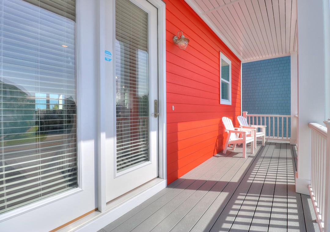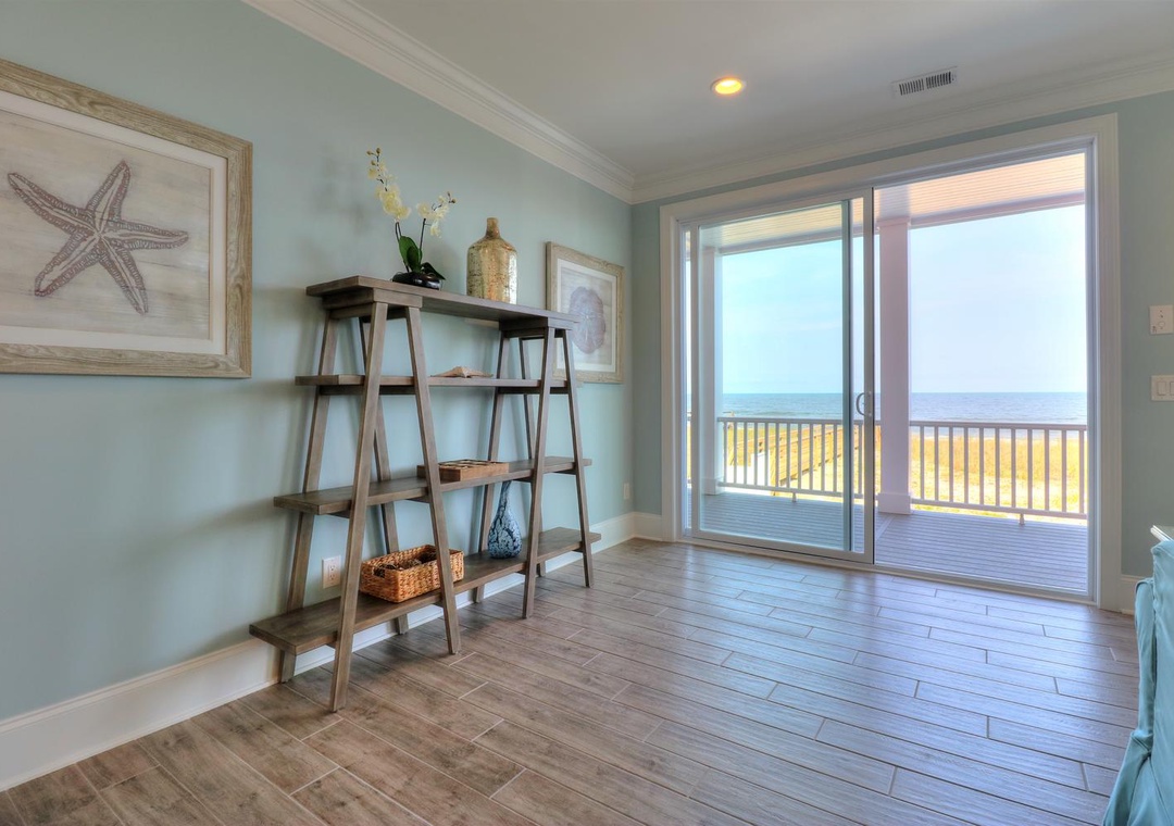The second floor is the heart of the home, featuring an open kitchen, dining, and living area with a large dining table, kitchen bar seating, and a flat-screen TV with cable. Guests can enjoy direct access to ocean-side and rear decks. This floor also includes two bedrooms: an ocean-side king bedroom and a twin bedroom, both sharing a Jack-and-Jill bathroom, each equipped with flat-screen TVs.
