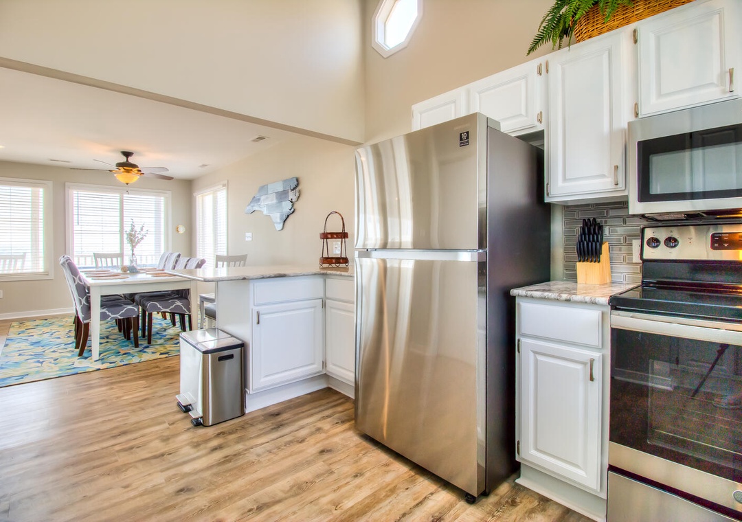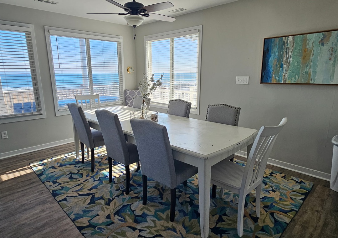 The second-story deck provides stunning ocean views and convenient access to the beach, complete with built-in bench seating and a covered area featuring a picnic table and rocking chairs. Up on the third story, another deck offers panoramic ocean vistas, including views of Kure Beach Pier, and is accessible from both third-floor bedrooms. The kitchen and dining area, located on the oceanfront second floor, feature a dining table for ten, additional bar seating, and are fully equipped with everything needed for meal preparation, from a blender to a crockpot.