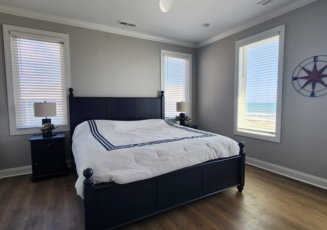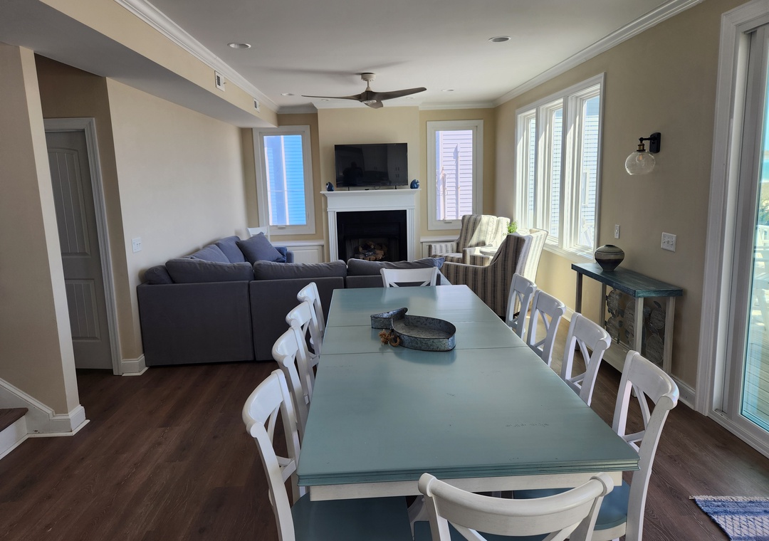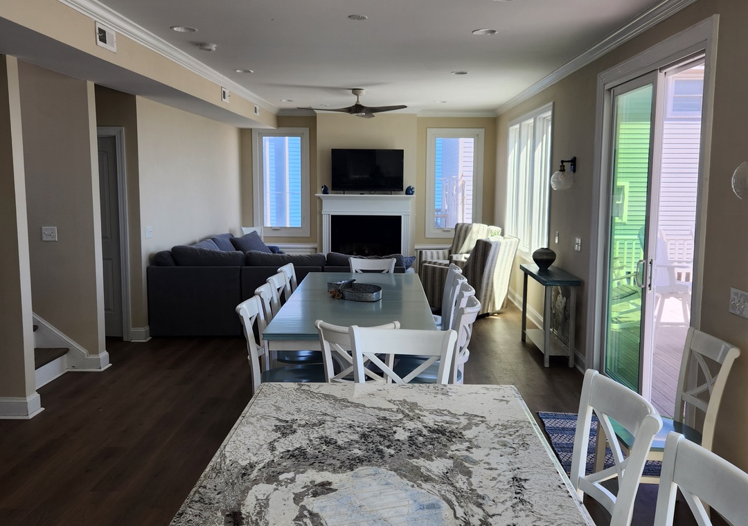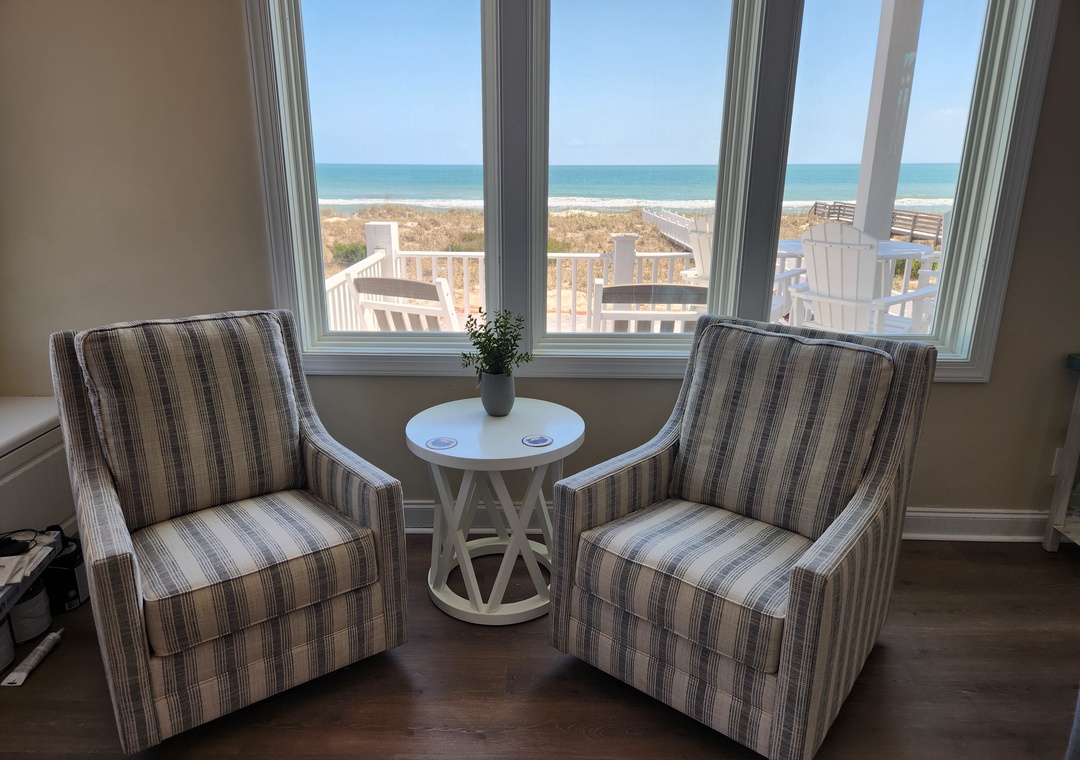 The home’s main living space is located on the second floor. The great room is bright and open, allowing the panoramic ocean view to fill the room. Relax and catch up with loved ones in the comfortable living area, with a gas fireplace available for use during the cooler months of the year. An additional sitting area in the great room offers a space to curl up with a good book or search for dolphins frolicking in the waves. The brand-new kitchen is fully equipped with all that you need to prepare meals for the duration of your stay. The dining area boasts a custom 12-person table and is situated so you can enjoy the gorgeous ocean view during meals. Step outside with your morning coffee to see the beautiful Kure Beach sunrise over the ocean or watch your family enjoying their time in the pool. Two bedrooms and two full baths complete the second floor of the home all with access to the oceanside deck.