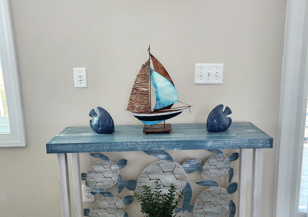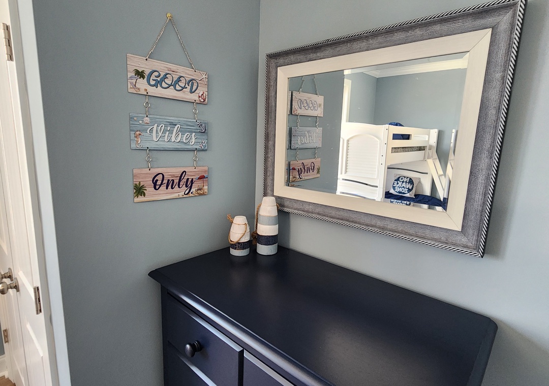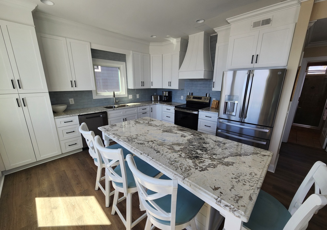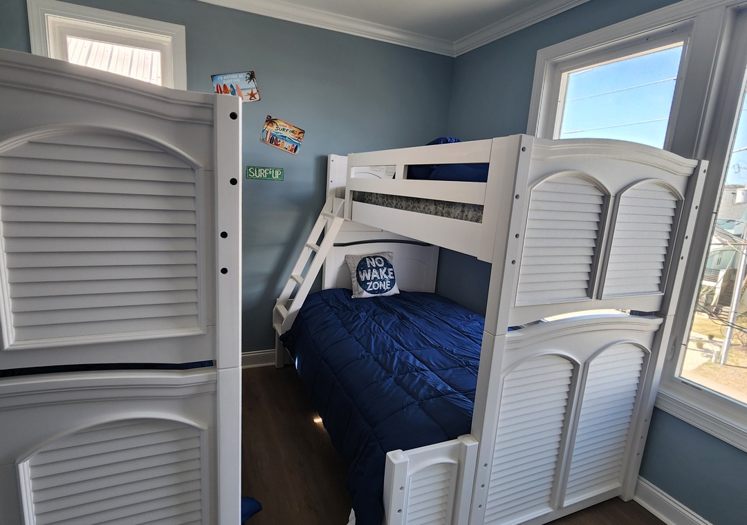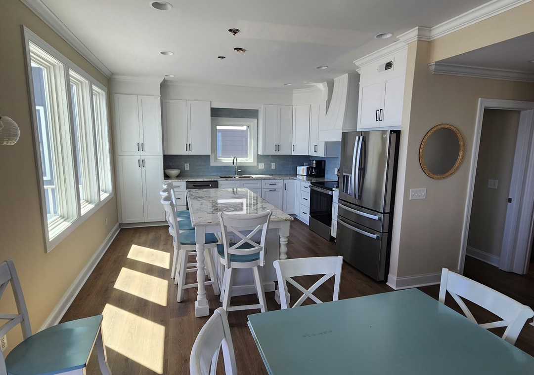The home’s main living space is located on the second floor. The great room is bright and open, allowing the panoramic ocean view to fill the room. Relax and catch up with loved ones in the comfortable living area, with a gas fireplace available for use during the cooler months of the year. An additional sitting area in the great room offers a space to curl up with a good book or search for dolphins frolicking in the waves. The brand-new kitchen is fully equipped with all that you need to prepare meals for the duration of your stay. The dining area boasts a custom 12-person table and is situated so you can enjoy the gorgeous ocean view during meals. Step outside with your morning coffee to see the beautiful Kure Beach sunrise over the ocean or watch your family enjoying their time in the pool. Two bedrooms and two full baths complete the second floor of the home all with access to the oceanside deck.