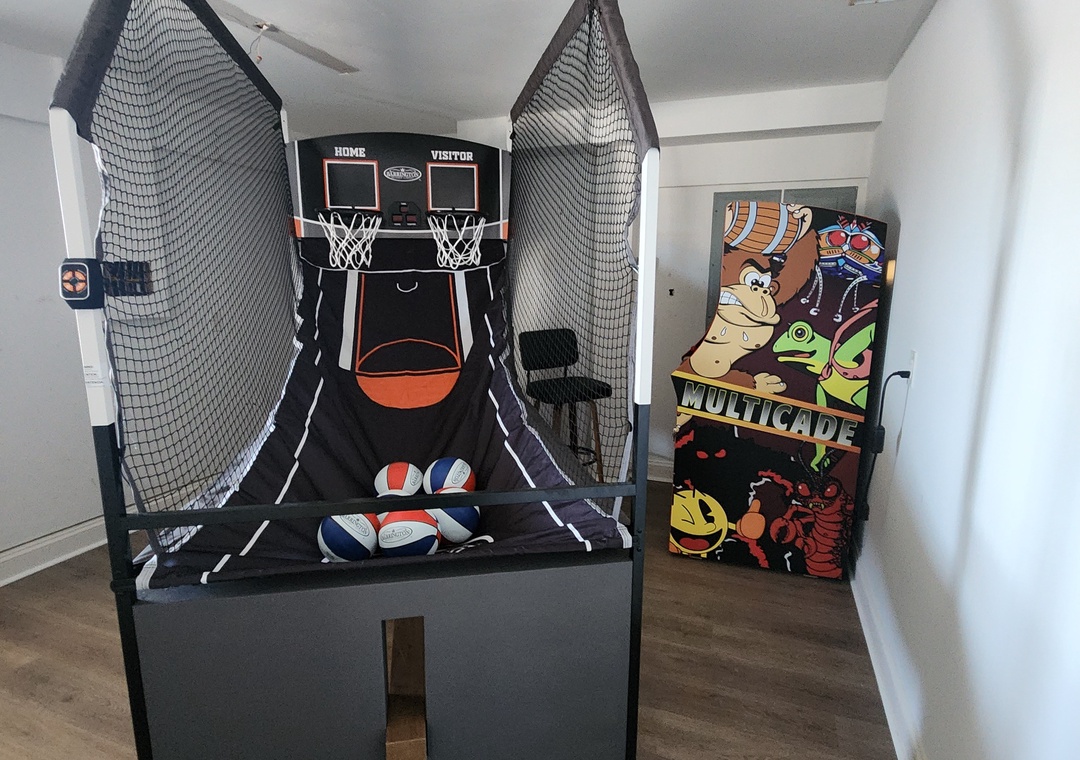 On the ground level you’ll find one more bedroom, a full bathroom, and a large game room with a bumper pool table and a kitchenette with a wet bar. Kids of all ages will enjoy the pinball machine, Mrs. Pac Man and Fast and Furious arcade race game. From the rec room, step outside to enter the large resort-style pool deck complete with a cabana that houses a tiki bar, an outdoor TV, six-person plywood dining table, outdoor ping pong, bar swings, and more. The spacious lounge area provides additional seating, barbeque grill, a pool basketball set, hot tub, and a cornhole set. The expansive 14’ x 34’ pool complex is the ultimate outdoor showstopper — a private oasis designed for both relaxation and entertainment.