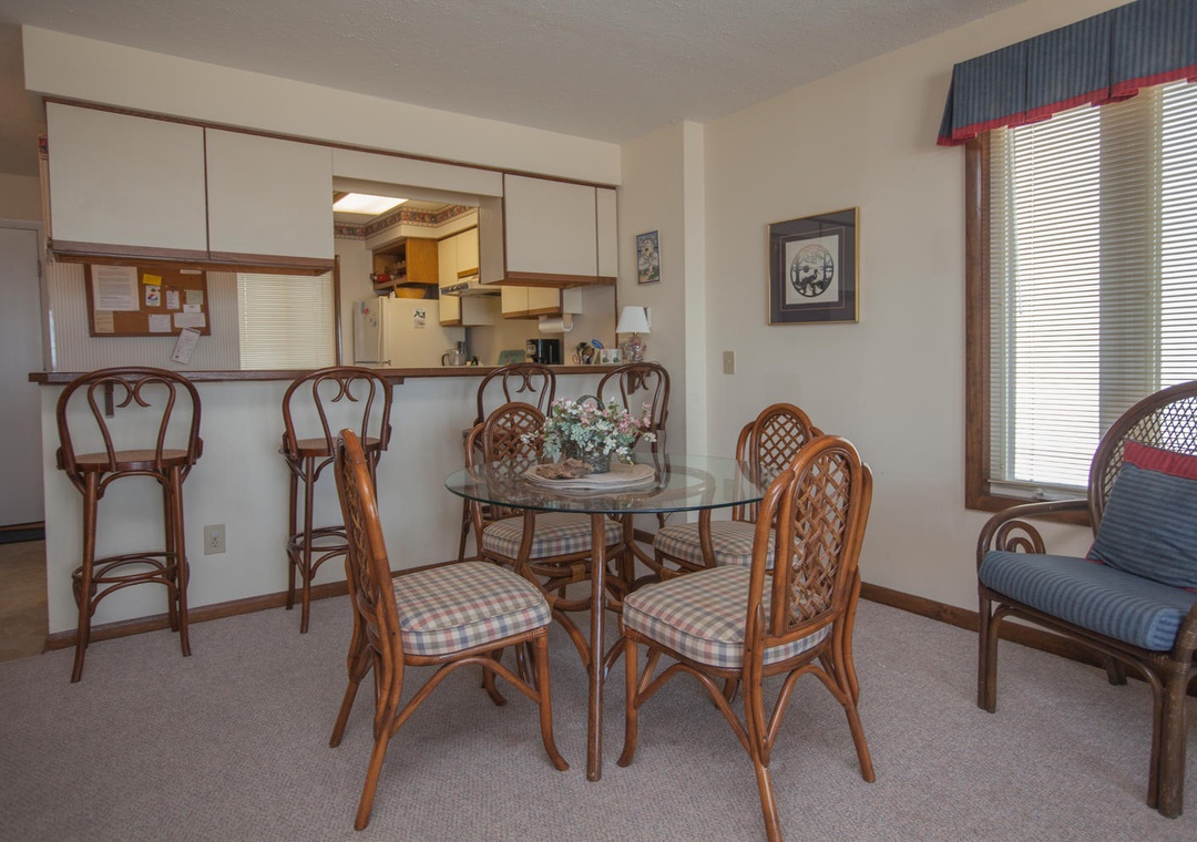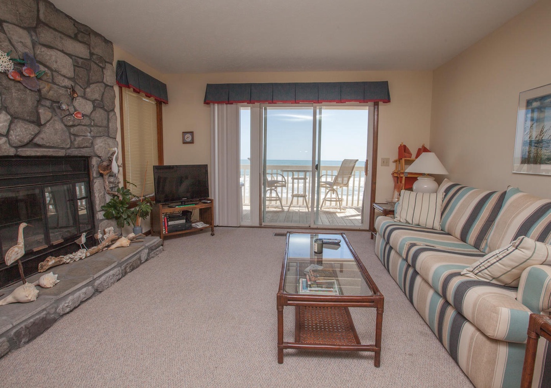 This oceanfront second-floor condominium offers a relaxing coastal retreat with modern comforts and community amenities. Guests can enjoy complimentary WiFi, central air and heat, and cable TV. The unit includes a wet bar, private deck access, and parking for two vehicles. Community features include indoor and seasonal outdoor pools, charcoal grills, and convenient beach access. The condo is accessible via one flight of stairs and is designed for comfort with a spacious single-level layout.