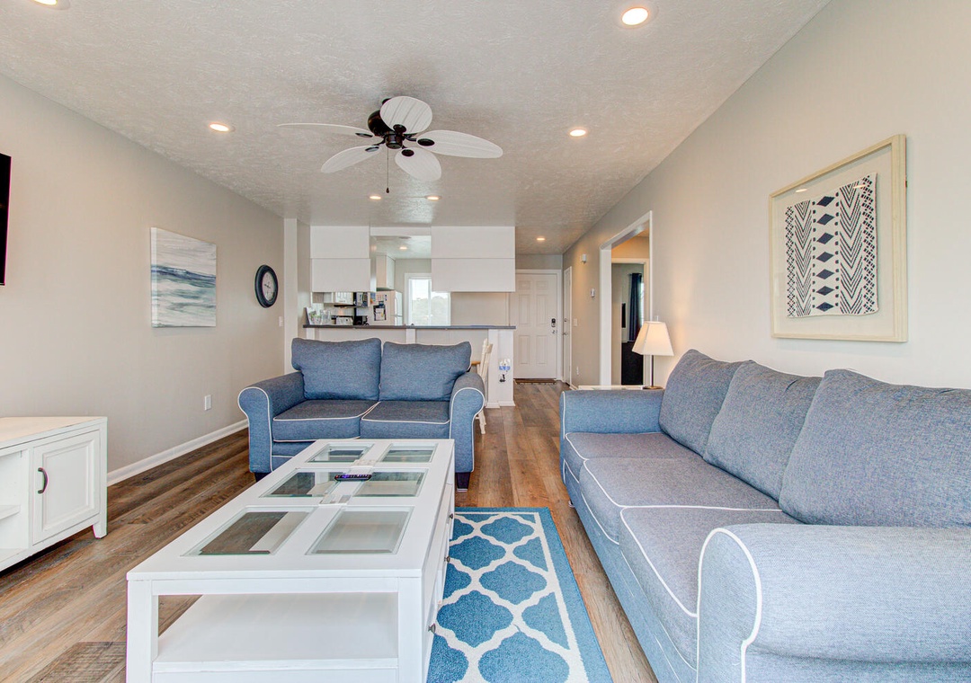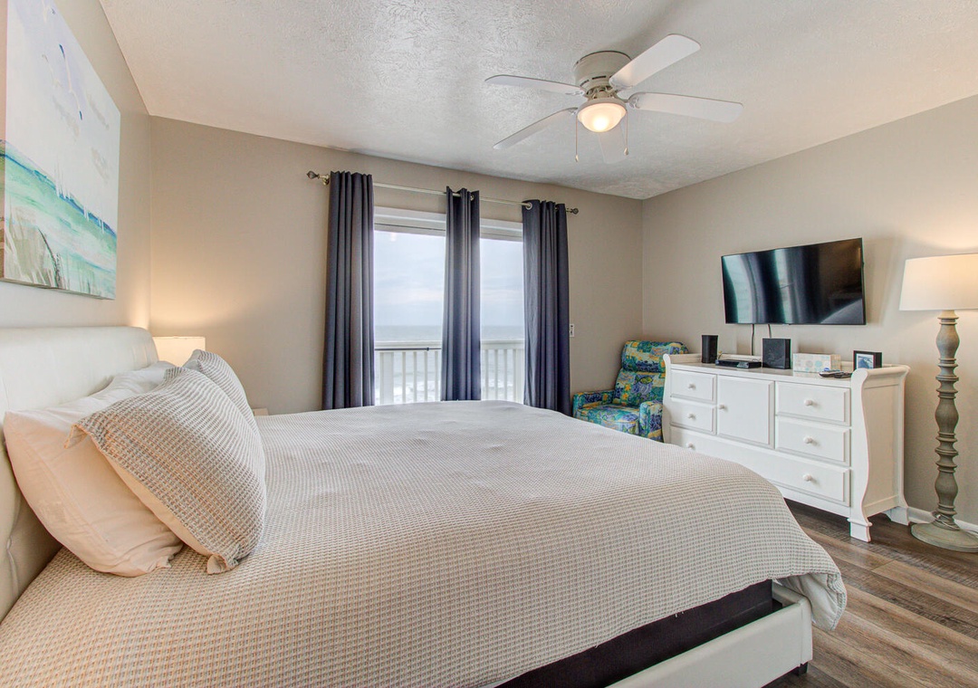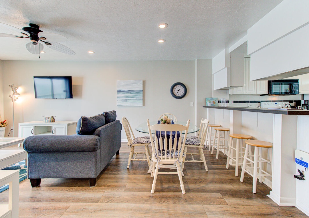 Step inside to find an inviting open-concept living space, where the queen sleeper sofa and seating for seven create a cozy atmosphere for movie nights on the flat-screen Smart TV, complete with a DVD and VCR player. The fully equipped kitchen features a dining table for six, additional barstool seating, and all the essentials, including a blender, dishwasher, and coffee maker. Retreat to the oceanfront master suite, boasting a king bed, private bathroom, and exclusive deck access with seating for four. A second bedroom offers a queen bed, with a shared full bath nearby. Whether sipping coffee on the balcony or taking a dip in the pool, Ocean Dunes 1704 promises a tranquil coastal getaway!