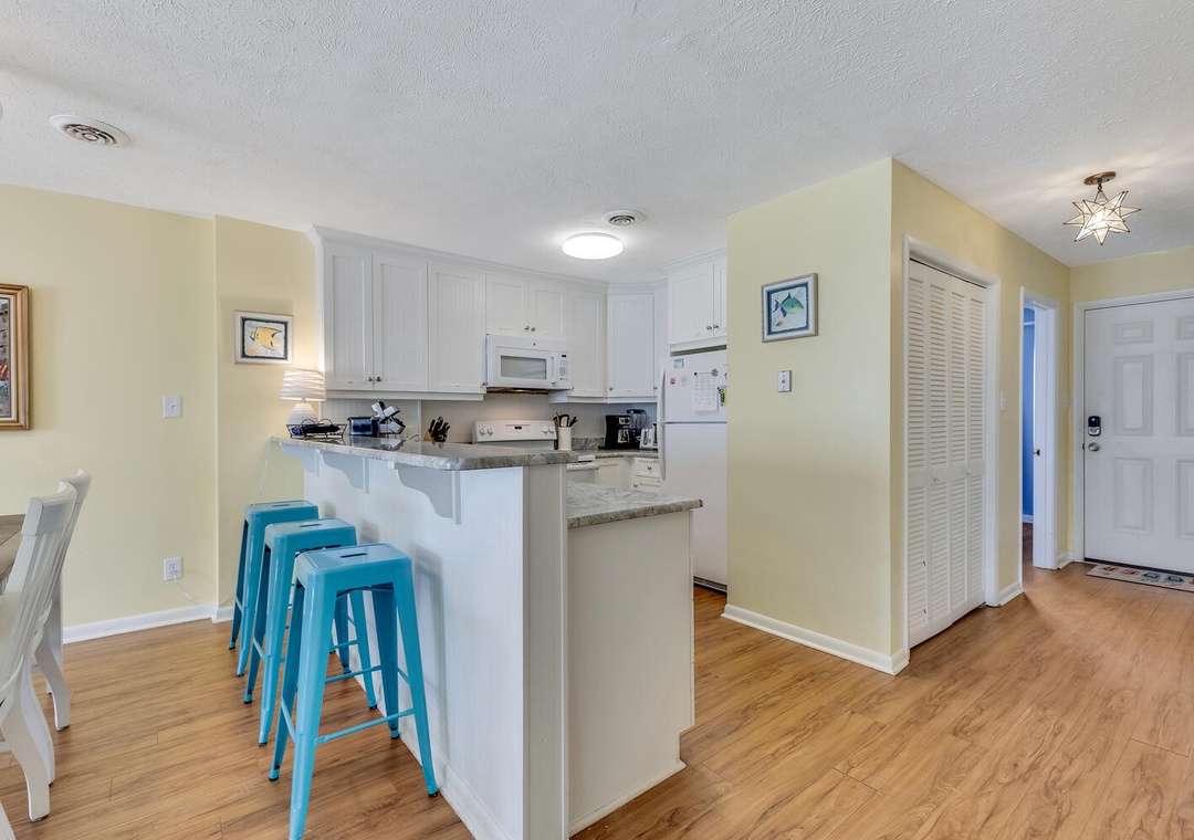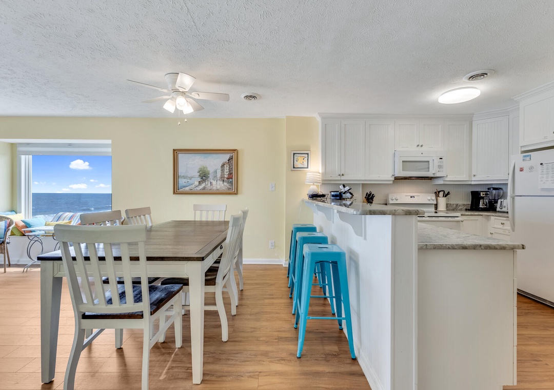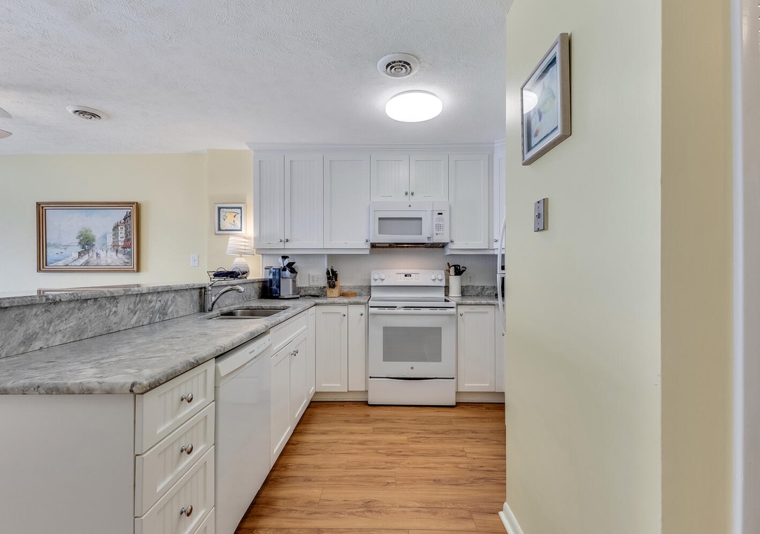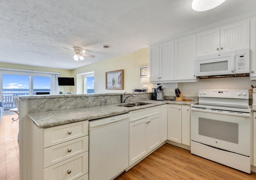 Welcome to Ocean Dunes 306, a beautiful top-floor condo on the south end of Kure Beach. This bright and breezy getaway offers breathtaking ocean views, a modern and inviting living space, and easy access to the beach. Enjoy the comfort of a recently remodeled kitchen with new cabinetry, countertops, and floors, perfect for preparing meals to enjoy on the oceanfront deck.
