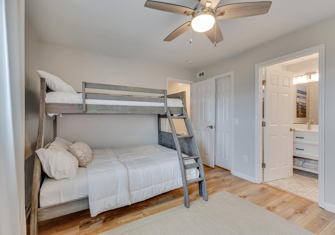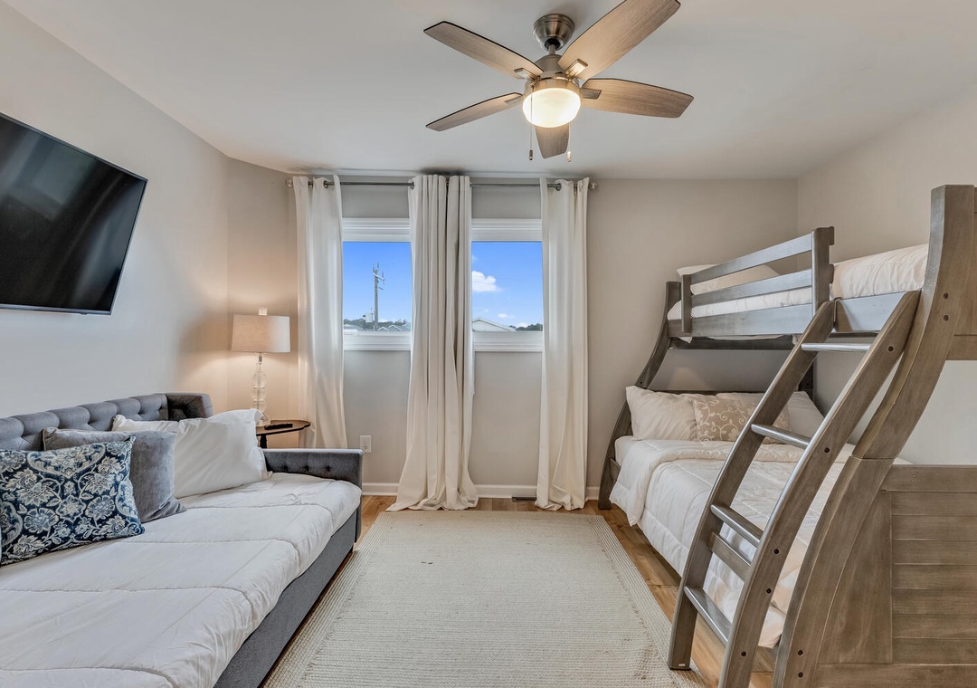 Each of the three bedrooms is designed with relaxation in mind. The primary suite features a luxurious king bed, private en-suite bathroom, and ocean view balcony. The second bedroom offers a queen bed, while the third bedroom is ideal for kids or additional guests, with a twin daybed, and a bunkbed featuring a twin over a full, with an ensuite. Comfortably accommodating up to 8 people total. All bedrooms include quality linens, smart TVs, and plenty of storage.