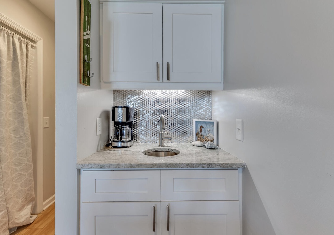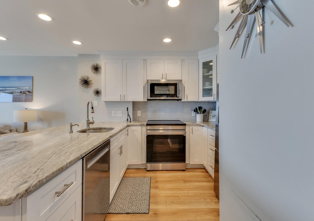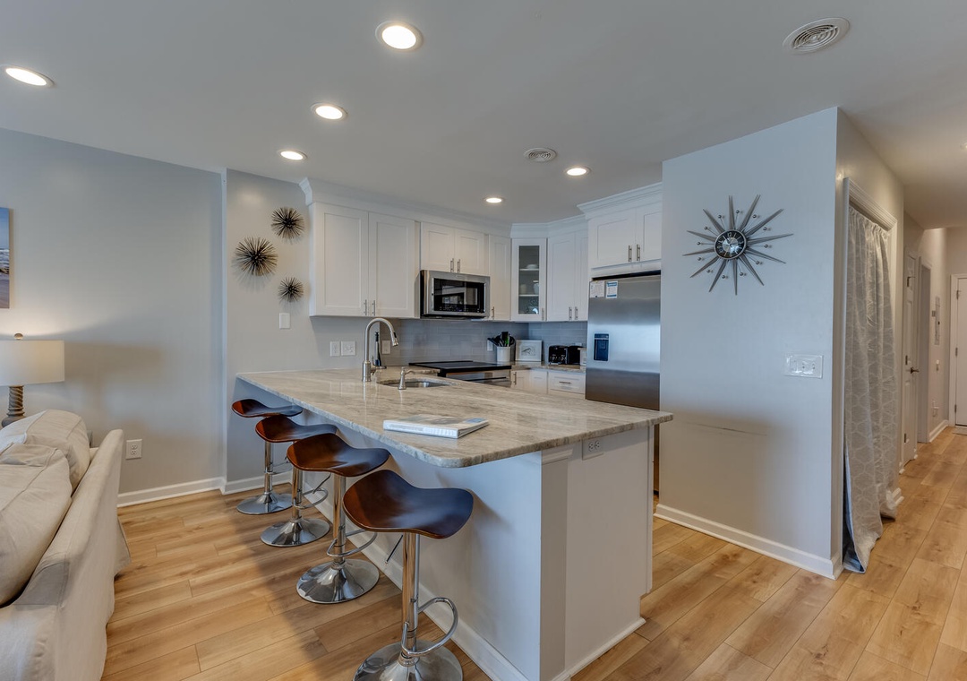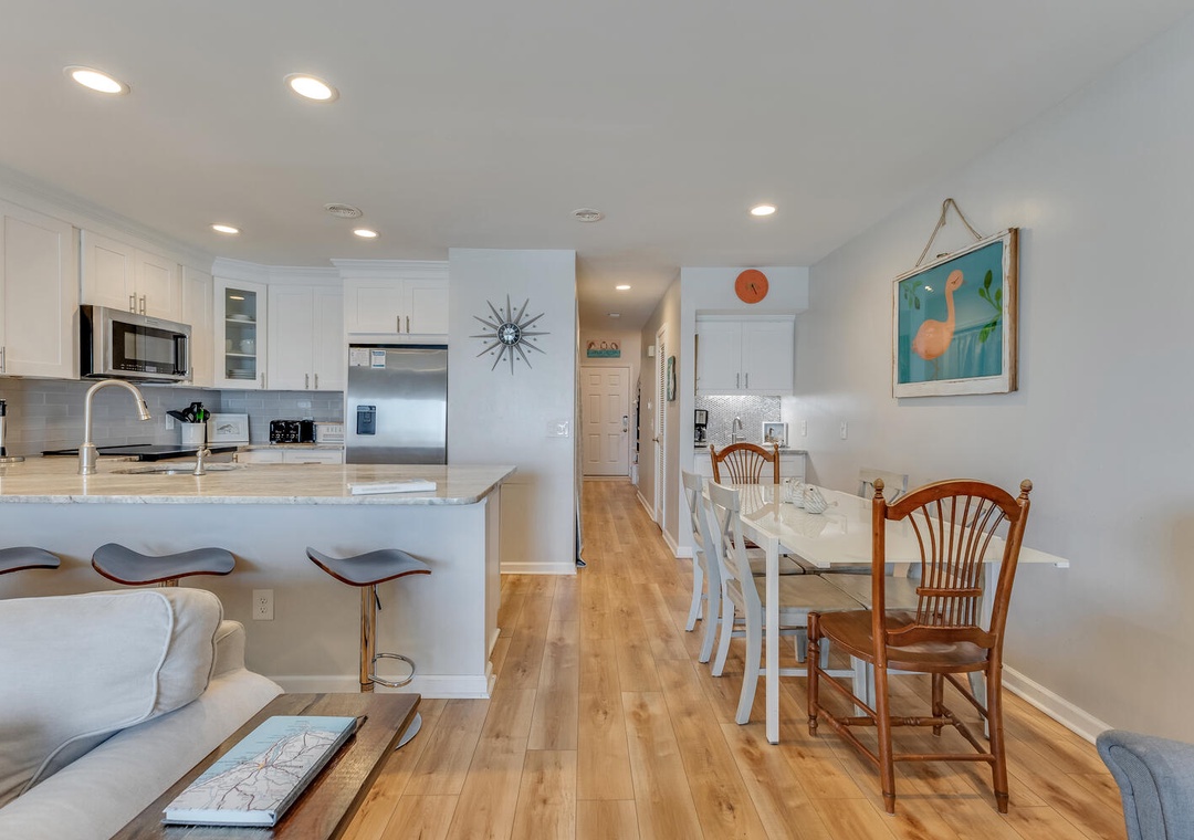 Step out onto the private oceanfront balcony, where you’ll find outdoor dining for six. The fully equipped kitchen includes everything you need to prepare meals at home, including stainless steel appliances, granite countertops, a breakfast bar, and ample storage. Adjacent to the kitchen, the indoor dining area offers a welcoming space to gather for meals with a view.