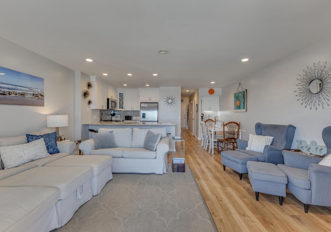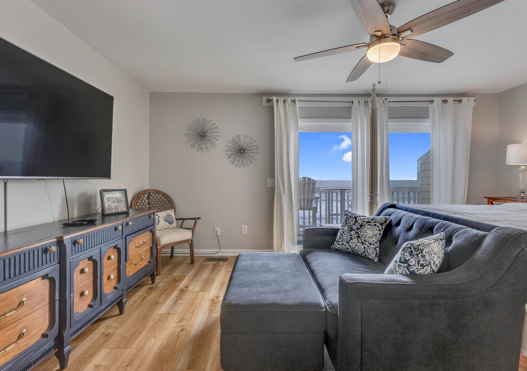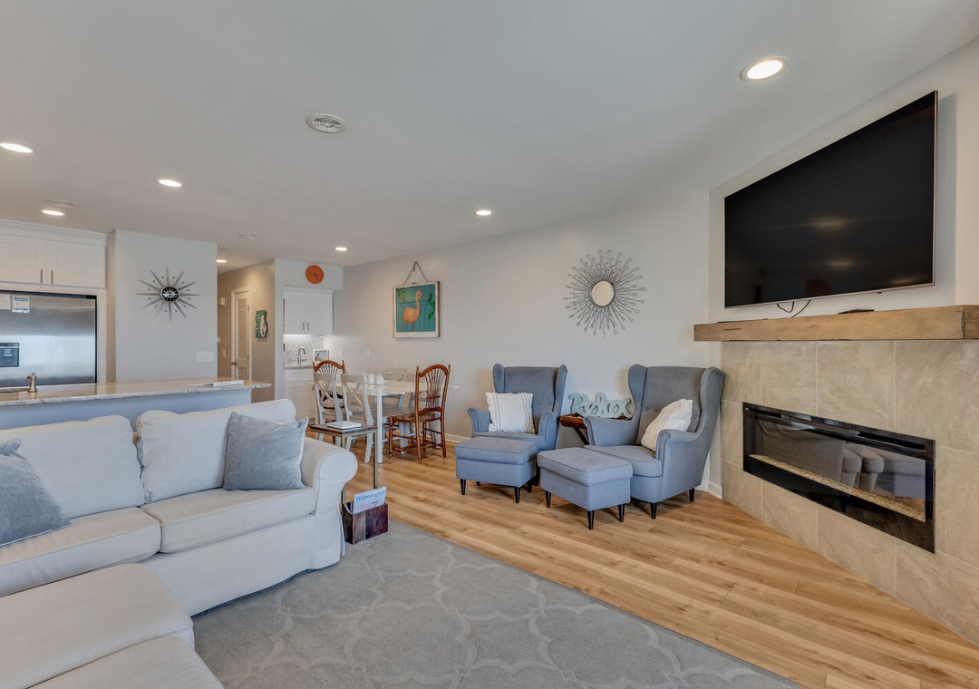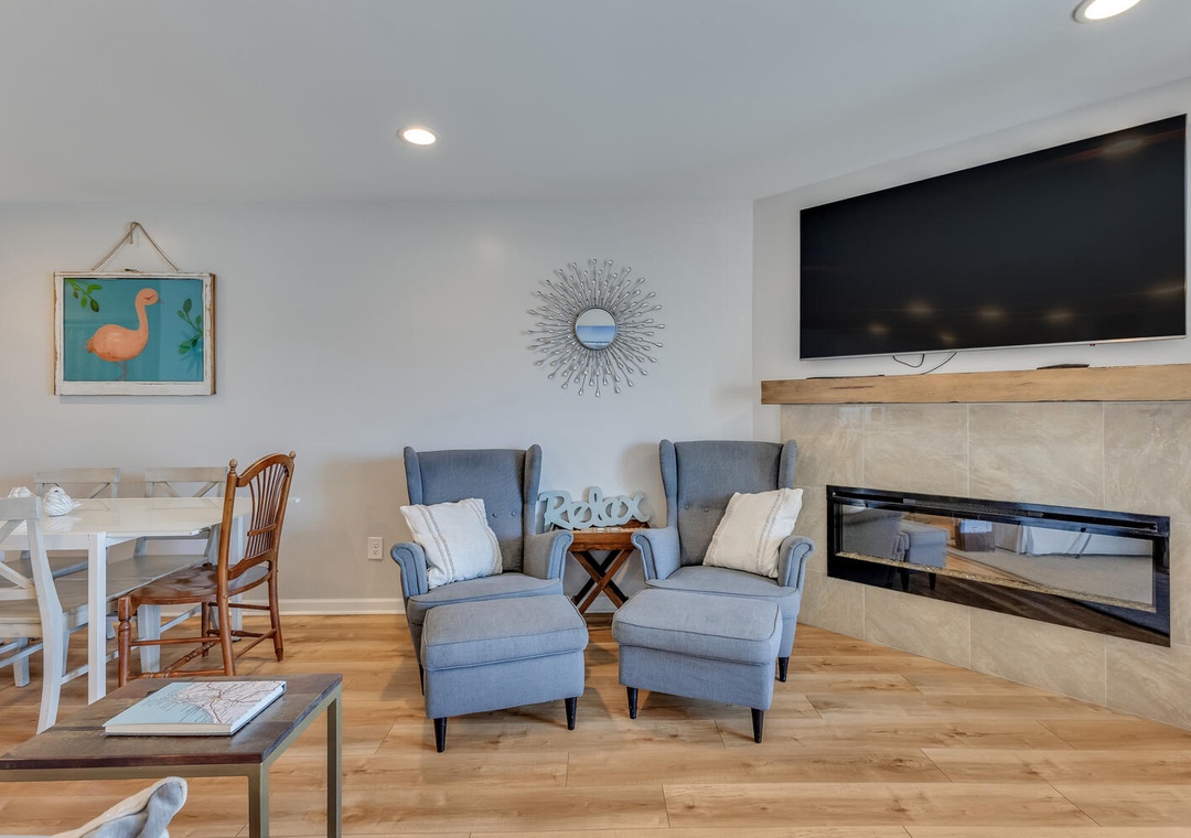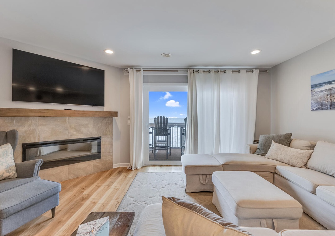 From the moment you step inside, you’ll be greeted by breathtaking views of the Atlantic Ocean through sliding glass doors. The open-concept living area is bathed in natural light and features cozy seating, a large smart TV over the electric fireplace, and direct access to your private balcony.