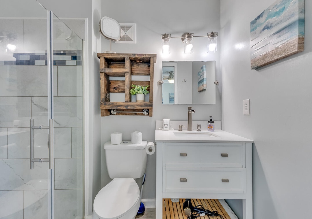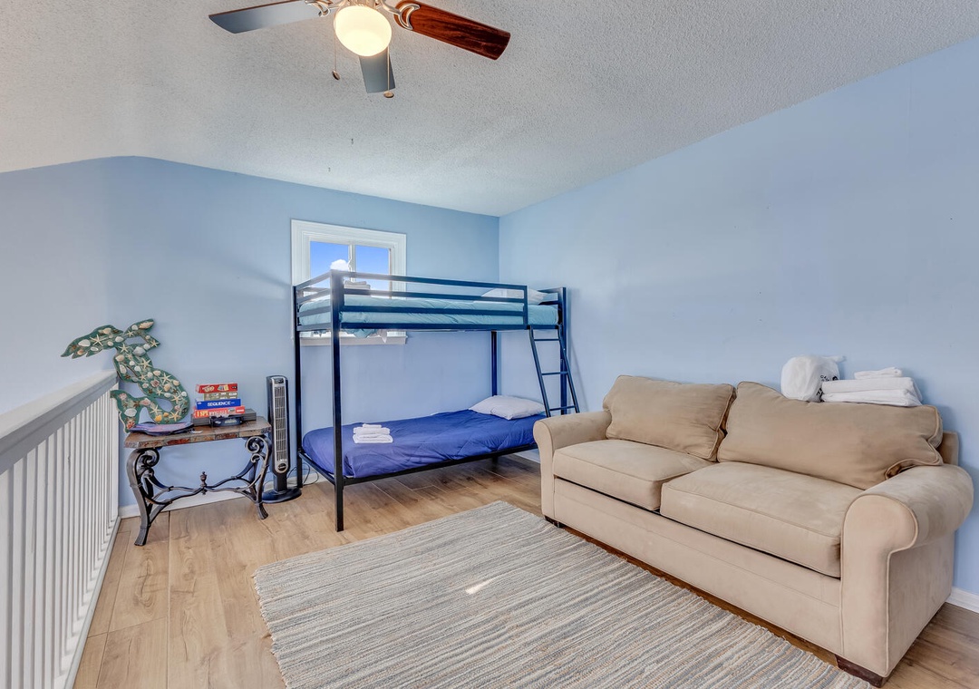 Inside, the home is bright and thoughtfully designed for families or small groups. It comfortably sleeps up to 10 guests with 1 California king bed, 1 queen bed, 1 full bed, and 2 twin-over-twin bunk beds, providing plenty of space for everyone to rest after a fun day exploring the beach and boardwalk.