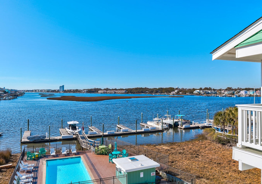 Inside, the condo boasts a spacious and well-appointed kitchen and dining area, complete with seating for 10 across a dining table for six and barstools for four. The kitchen is fully equipped with modern appliances, including a Keurig coffeemaker, dishwasher, and microwave. The living room provides cozy seating, flat screen TV and opens to a stunning view of the Myrtle Grove Sound and pool deck. For your comfort, the property boasts two king sized suites both featuring on suite private baths with double vanities and glass door showers. A third bedroom holds a queen bed and private bathroom with a tub/shower combo ensures comfort for additional guests. For added convenience, a washer and dryer are located in the hallway.