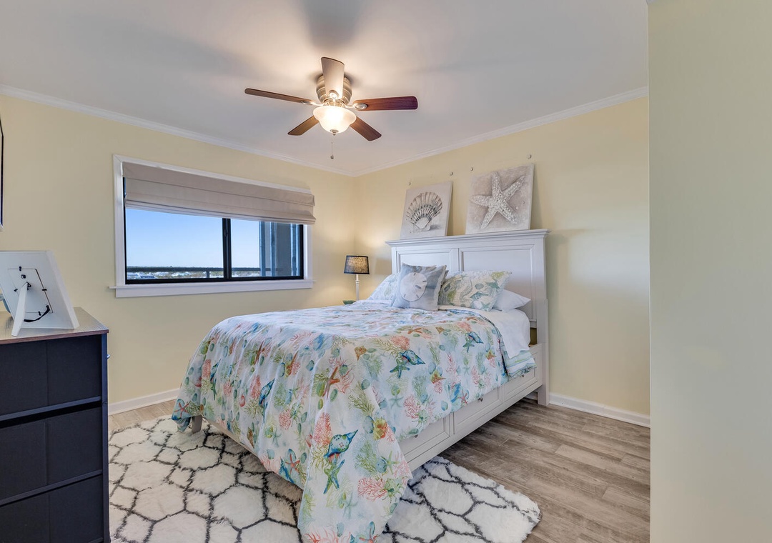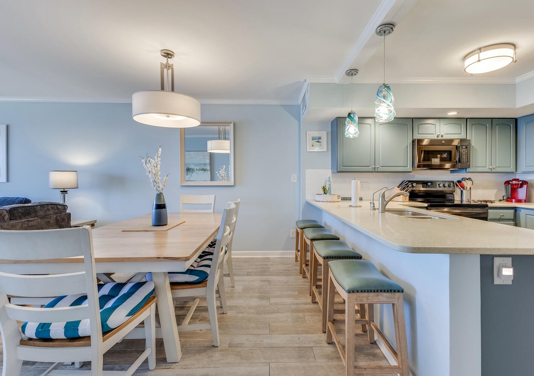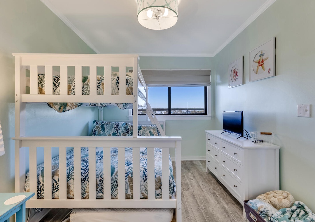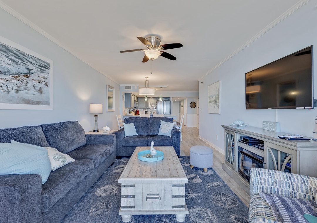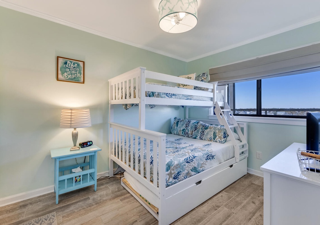 Accommodating up to eight guests, this unit features two additional bedrooms—one with a new queen bed and flat-screen TV, and the other with a twin over full bunk bed and pull-out twin trundle, perfect for the kids. With three bedrooms and two bathrooms, there's plenty of space for everyone to unwind after a day of seaside adventures.