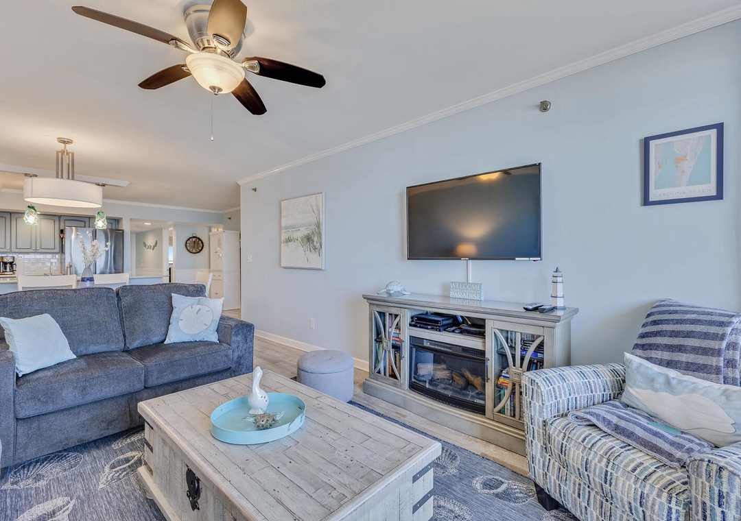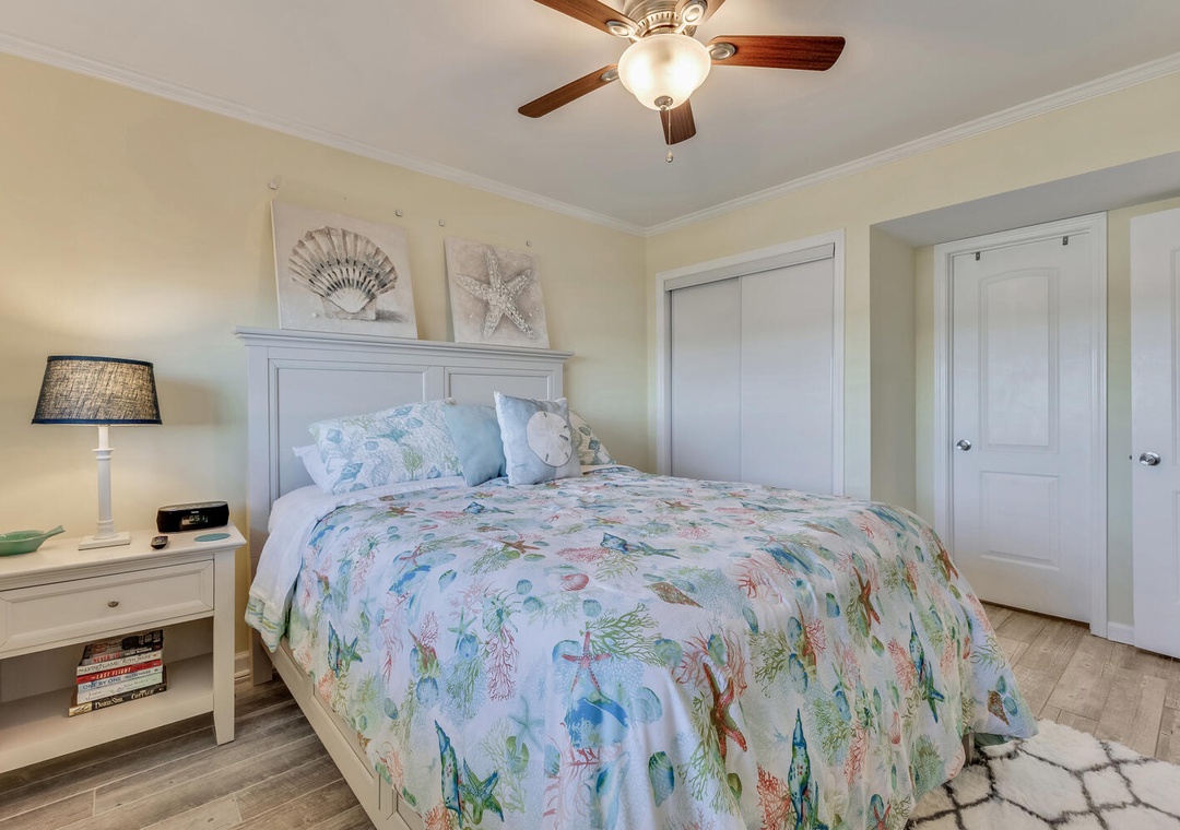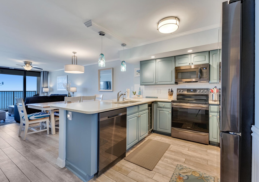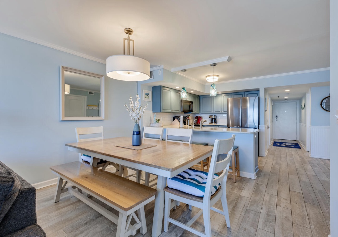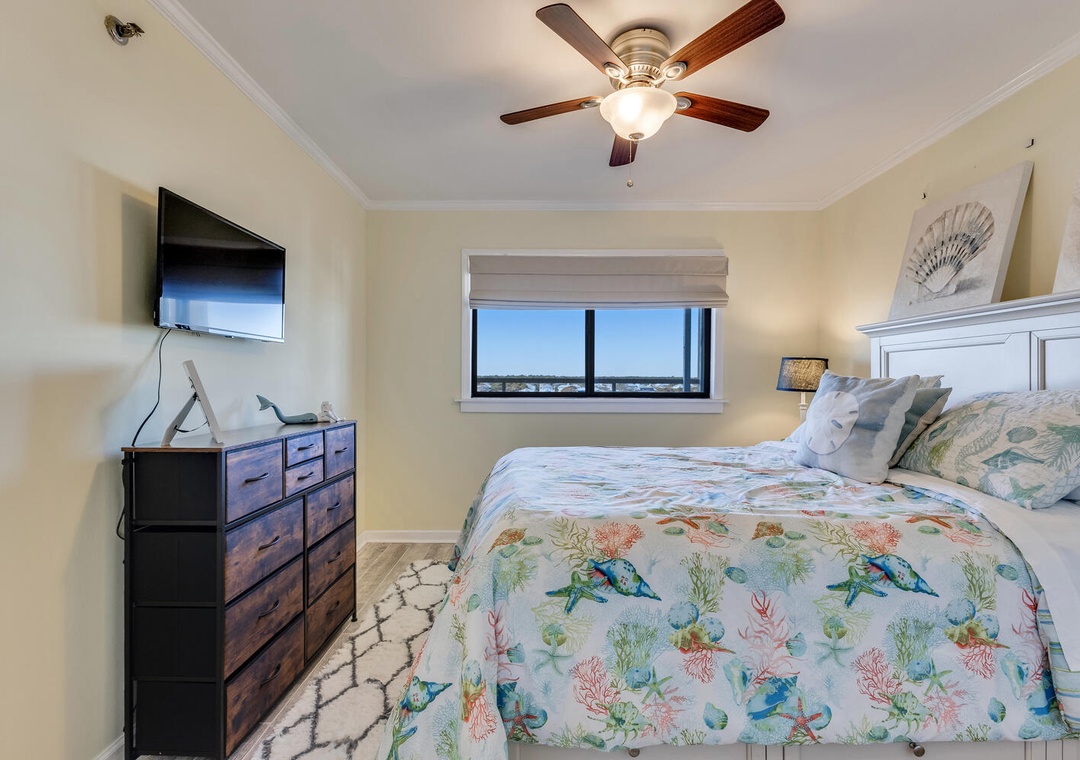 Accommodating up to eight guests, this unit features two additional bedrooms—one with a new queen bed and flat-screen TV, and the other with a twin over full bunk bed and pull-out twin trundle, perfect for the kids. With three bedrooms and two bathrooms, there's plenty of space for everyone to unwind after a day of seaside adventures.