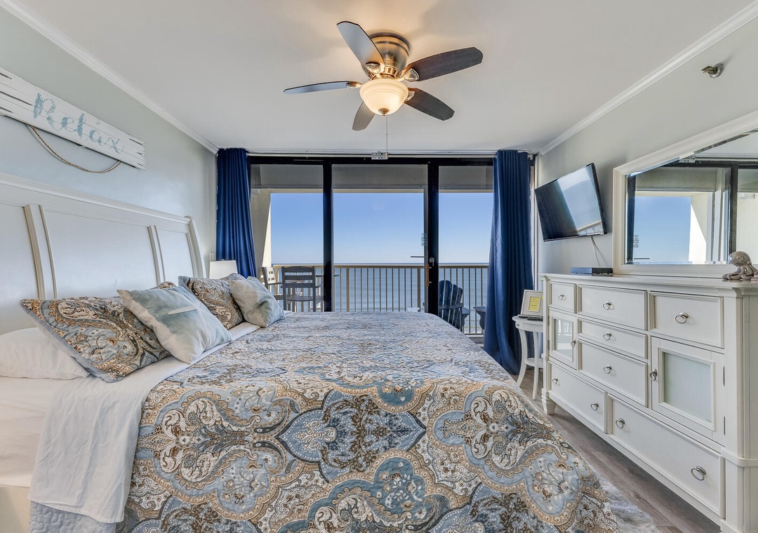 The primary bedroom boasts a plush king bed, flat-screen TV, and direct access to the deck, offering a serene retreat with ocean breezes and breathtaking sunsets. A fully equipped kitchen awaits, stocked with essentials including a spice rack and wine/beer fridge, making meal preparation a breeze.