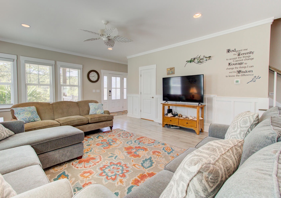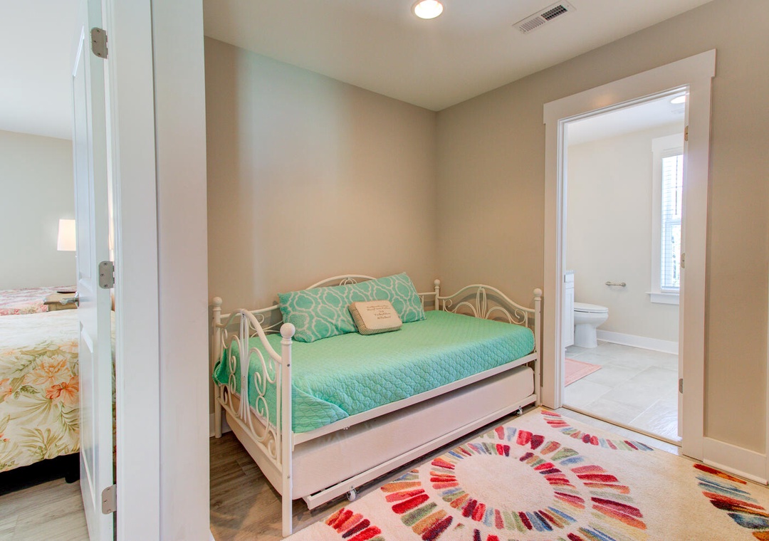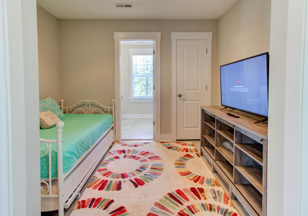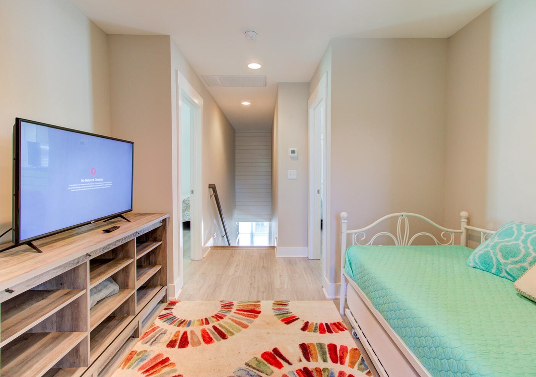 The home's sleeping accommodations are thoughtfully designed to provide comfort for all guests. The master bedroom, located on the second floor, features a queen bed, flat-screen TV, ceiling fan, and a private bathroom with a double vanity and glass door walk-in shower. The third floor includes two additional bedrooms: one with two twin beds and one queen bed, and another with three queen beds, each equipped with flat-screen TVs and ceiling fans. A loft area with a twin day bed and flat-screen TV adds an extra cozy retreat, while a shared bathroom on the third floor offers a tub/shower combo. Laundry facilities, including a top-loading washer and front-loading dryer, are located on the second floor. A half bathroom is conveniently positioned off the living room for easy access.