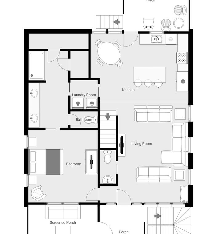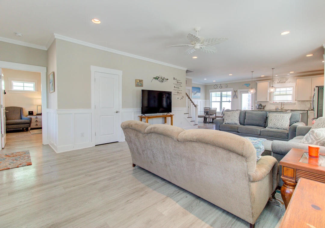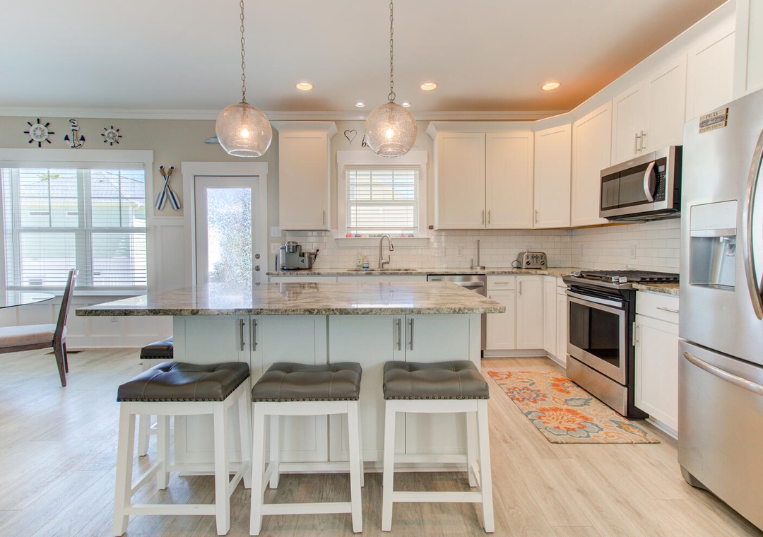 Welcome to Pool House! This modern, well-equipped 3-bedroom rental unit comfortably sleeps up to 10 guests. It features central heating and air conditioning, complimentary Wi-Fi, and a private pool with a picnic table. The property provides parking for six vehicles and an outdoor shower for added convenience. As a newly constructed home, it offers a screened-in front deck with four chairs, making it the perfect spot to relax and enjoy the surroundings. The kitchen and dining area, located on the second floor, include a dining table with seating for four, additional barstool seating for four, and a variety of appliances such as a refrigerator with an icemaker, coil cooktop stove, microwave, drip coffeemaker, toaster, and garbage disposal. Adjacent to the kitchen is the living room, which offers comfortable couch seating for nine, a flat-screen TV, and a ceiling fan for entertainment and relaxation.