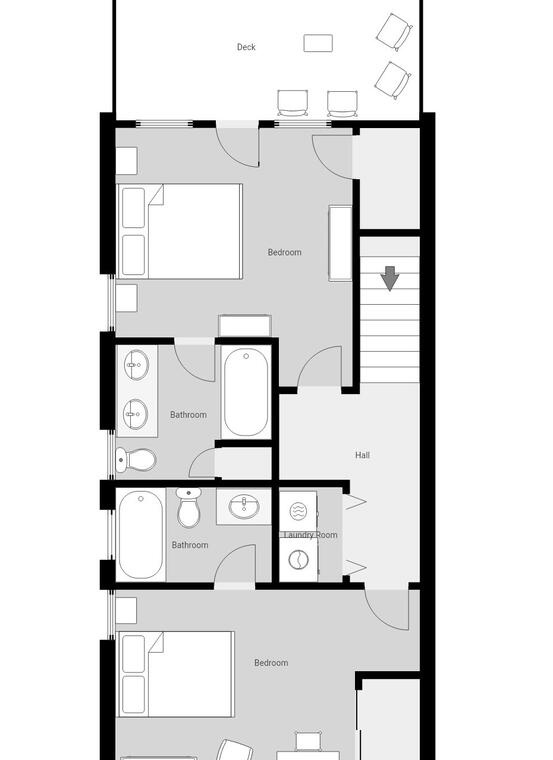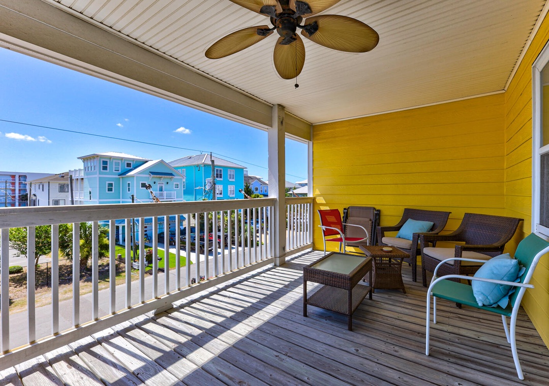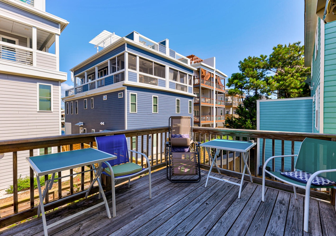 2nd Floor Double Bed Ceiling Fan Deck off Bedroom with 3 Chairs and Retractable Awning